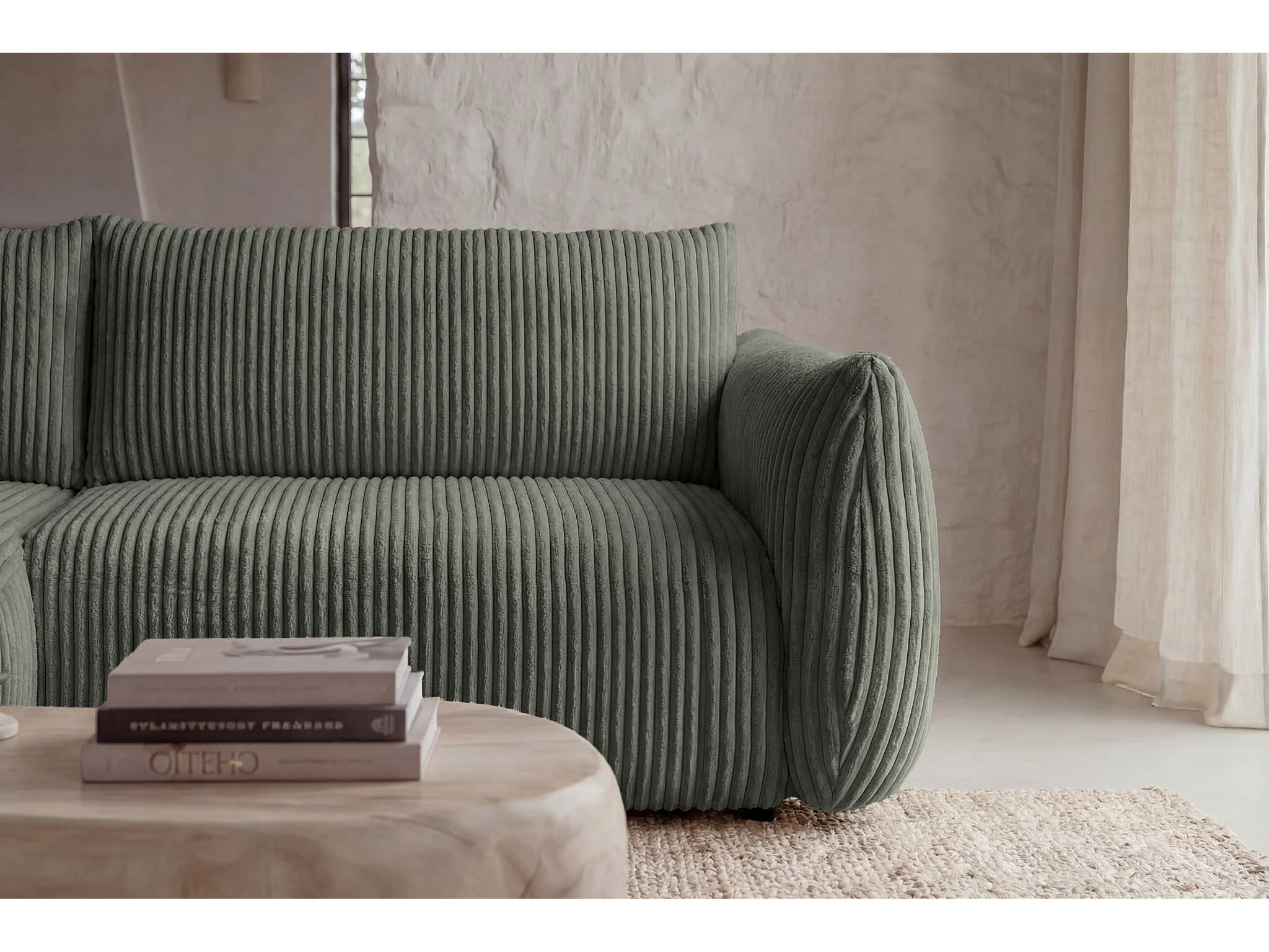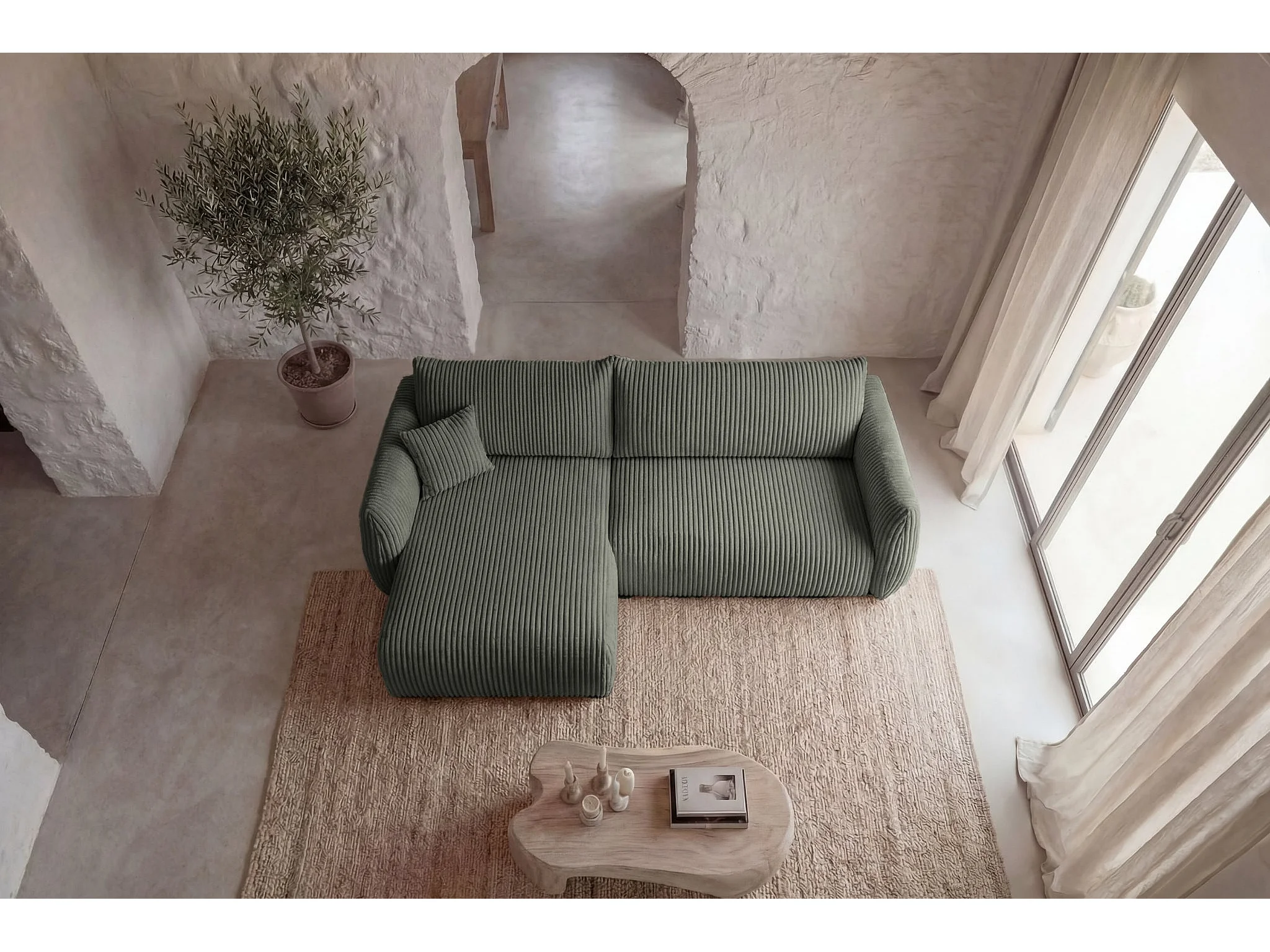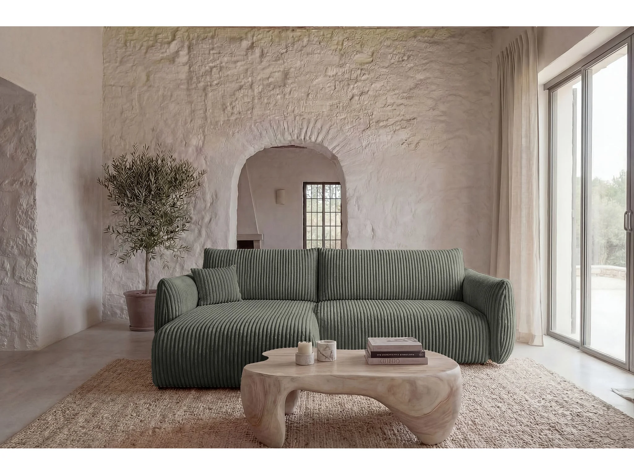 ELIO - Canapé d'angle convertible gros velours côtelé 4 places - Vert