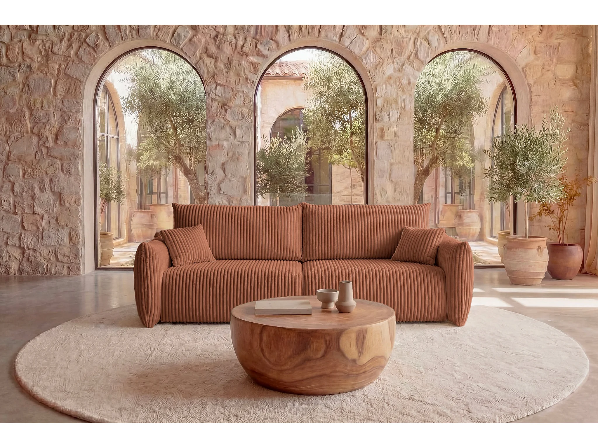 ELIO - Canapé droit convertible gros velours côtelé - Terracotta