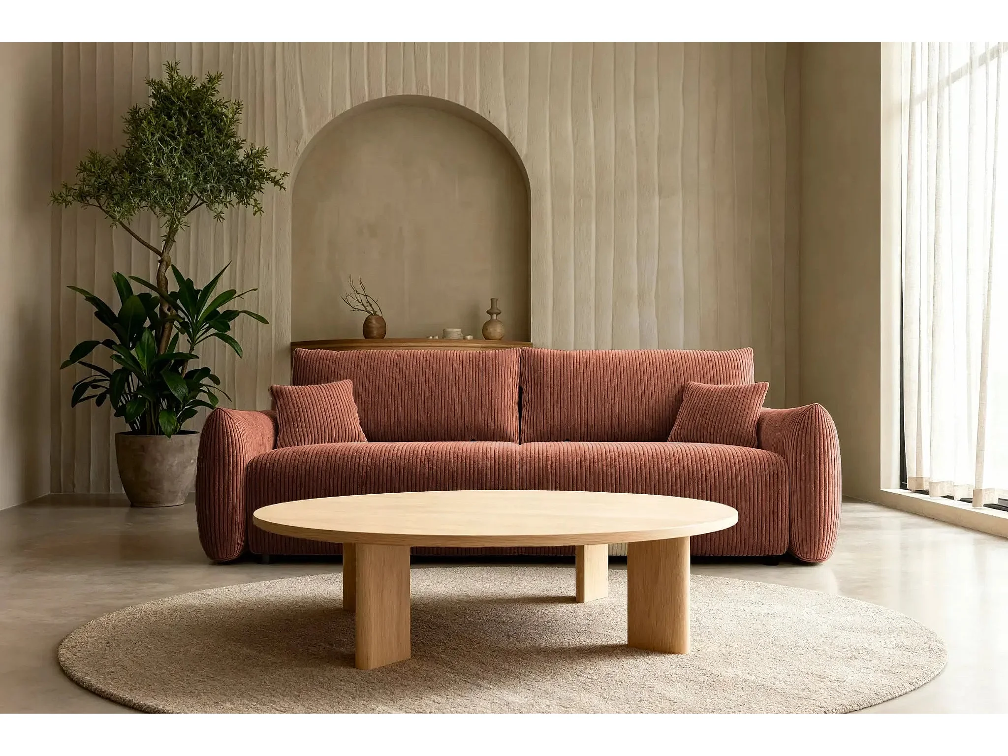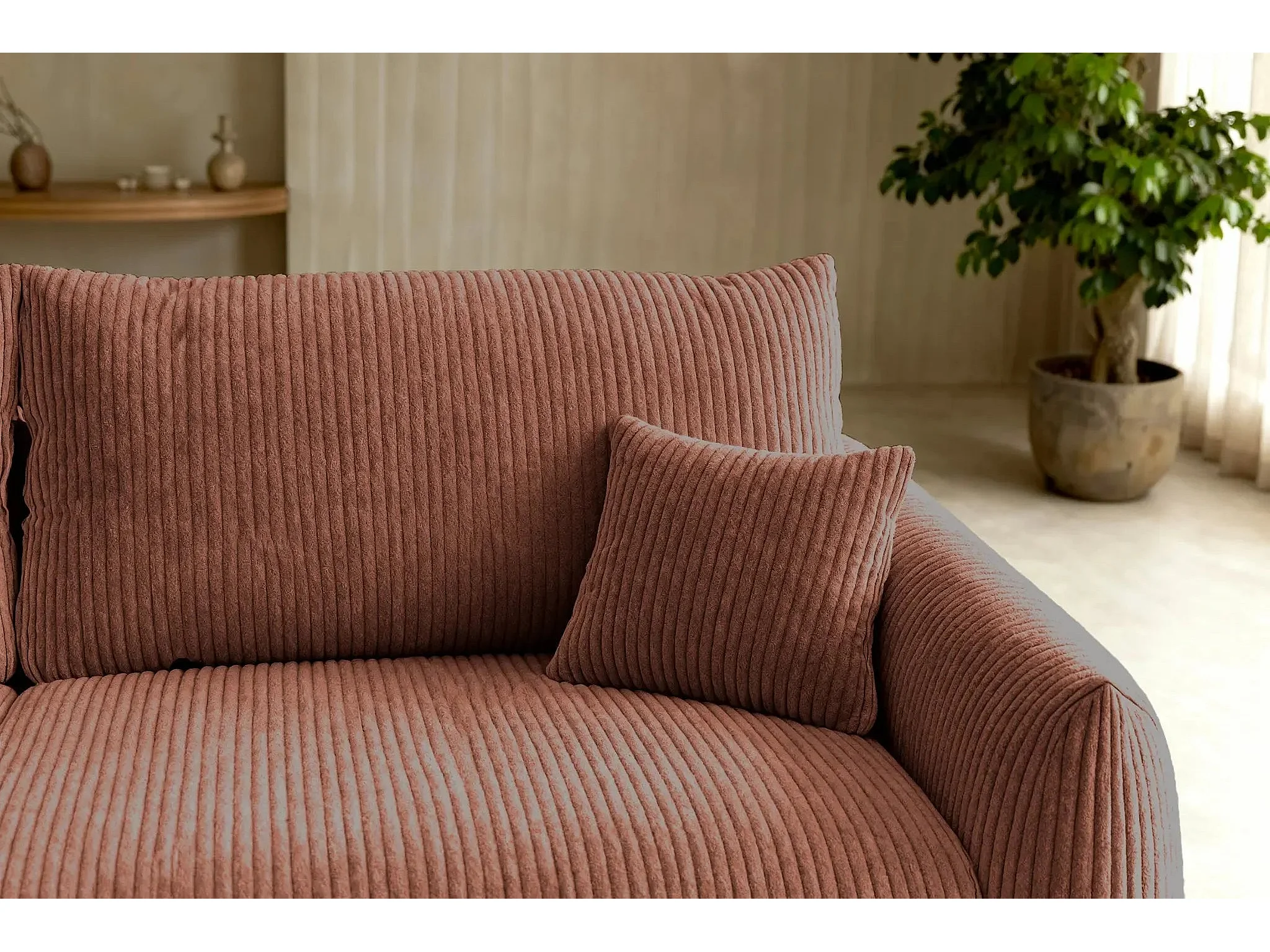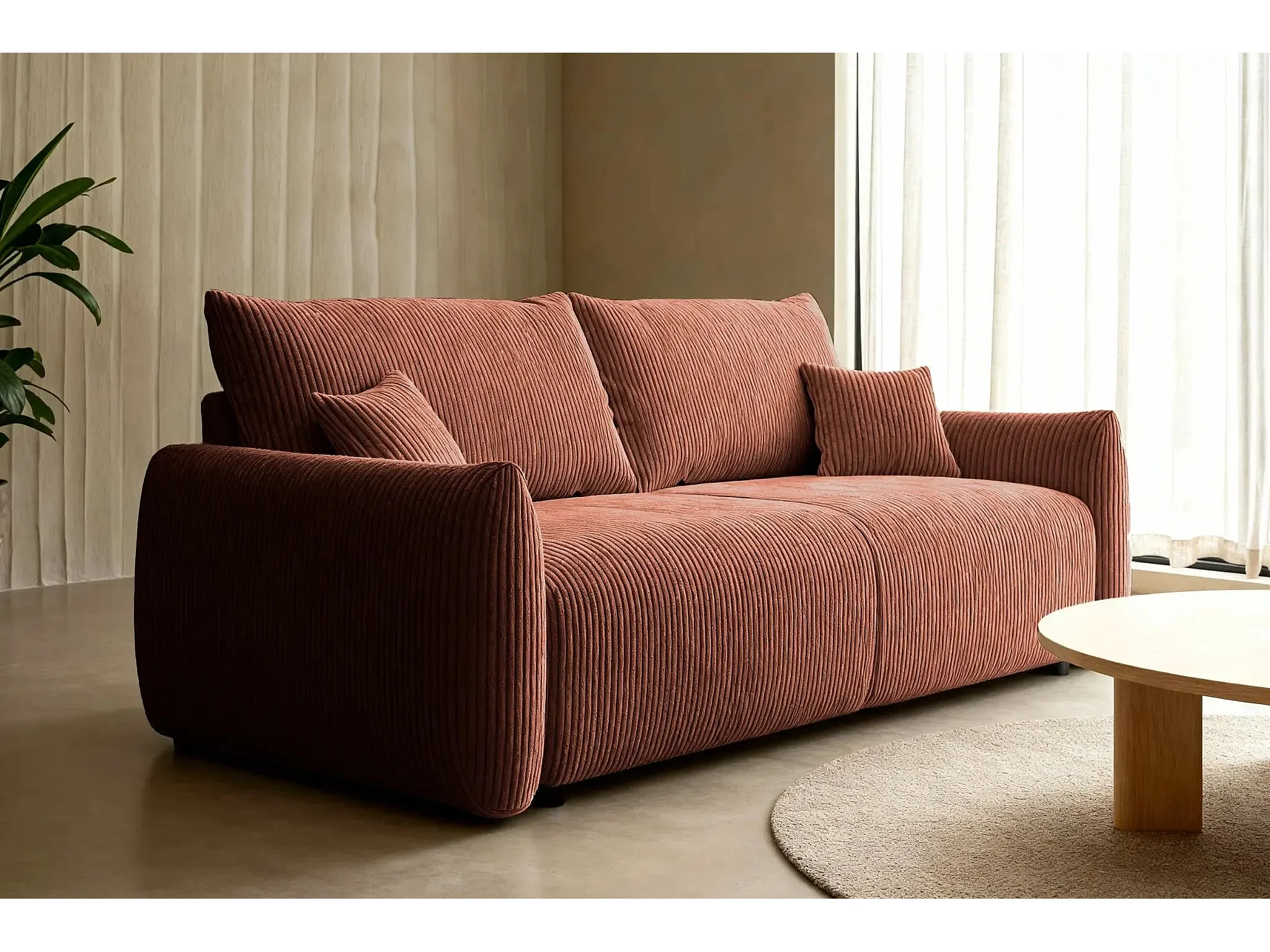 ELIO - Canapé droit convertible petit velours côtelé 3 places - Terracotta