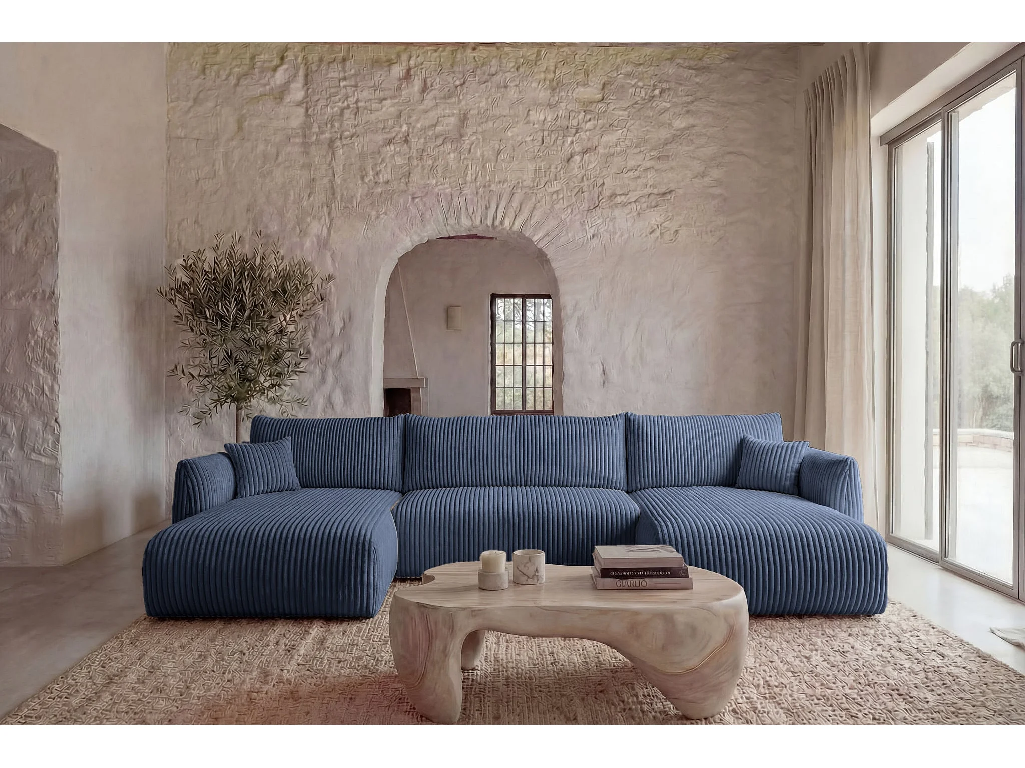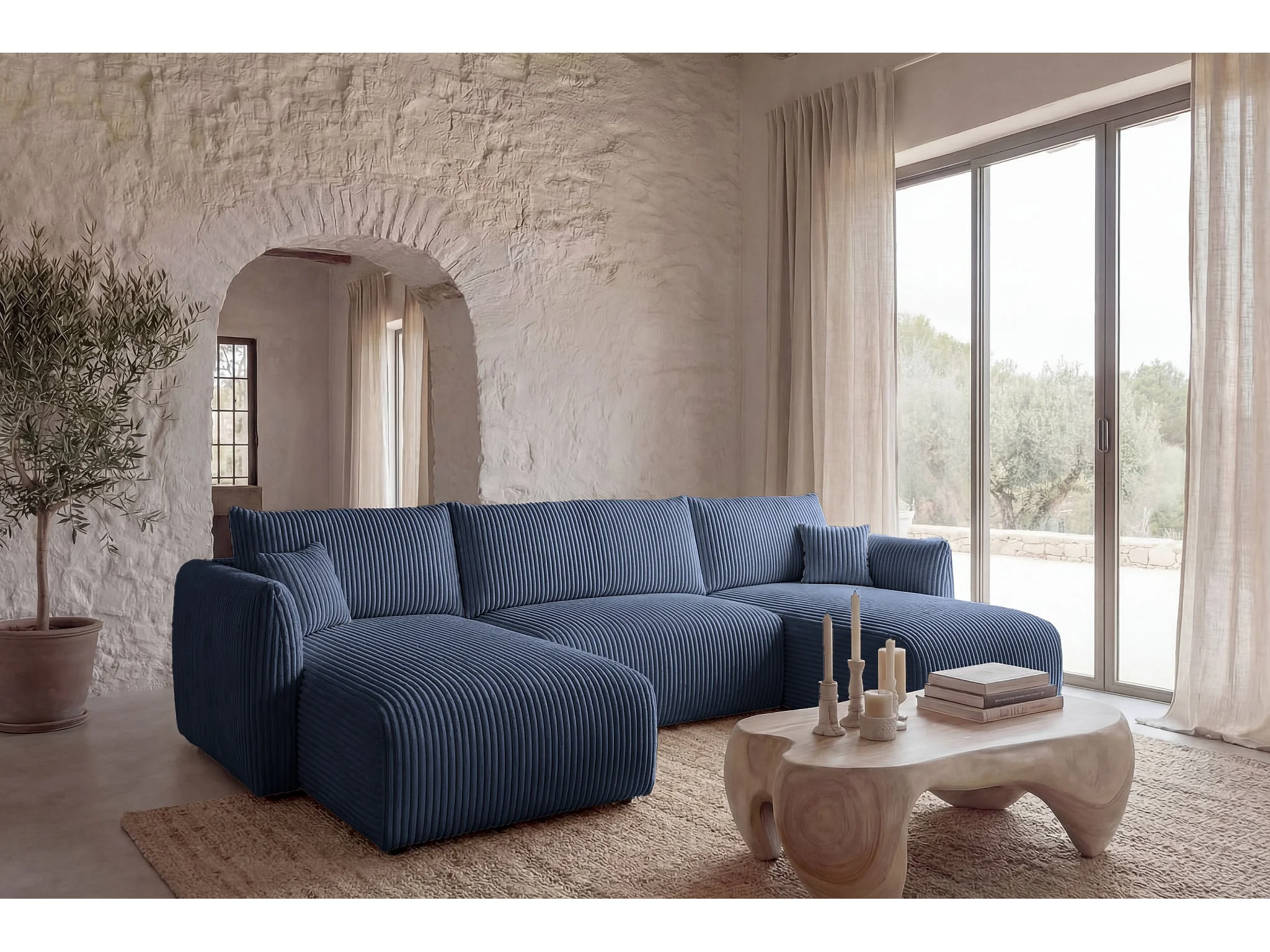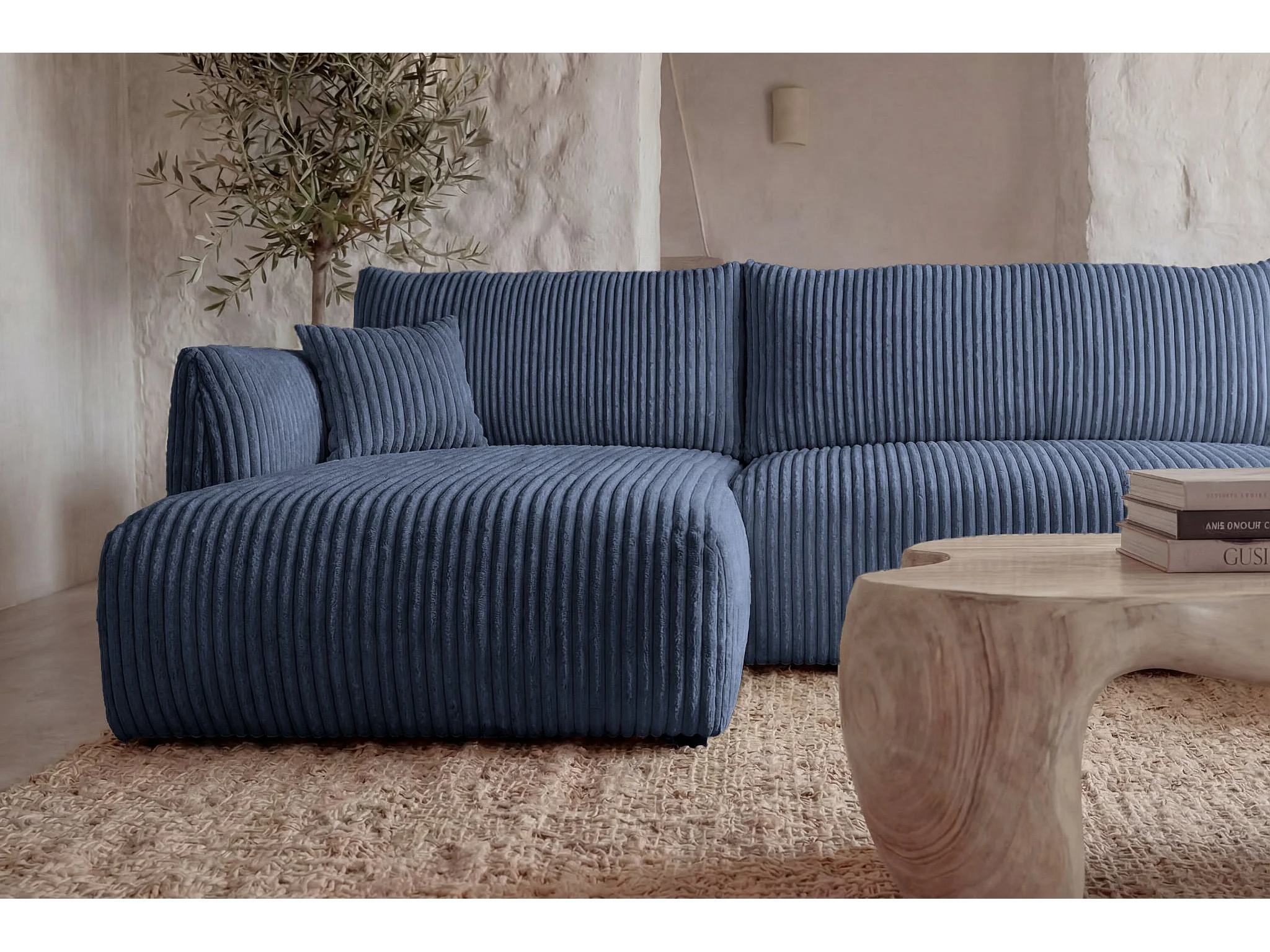 ELIO - Canapé panoramique convertible gros velours côtelé 5 places - Bleu