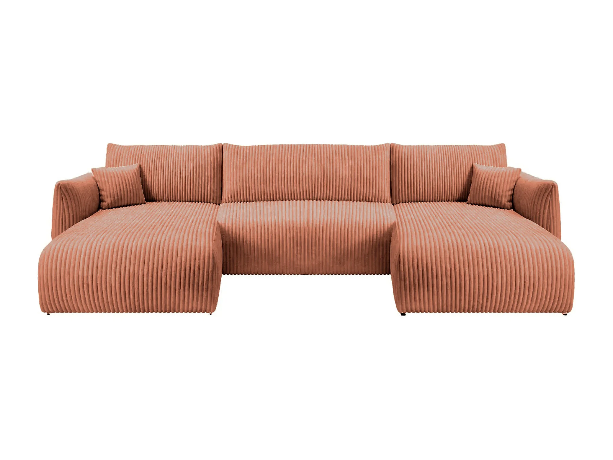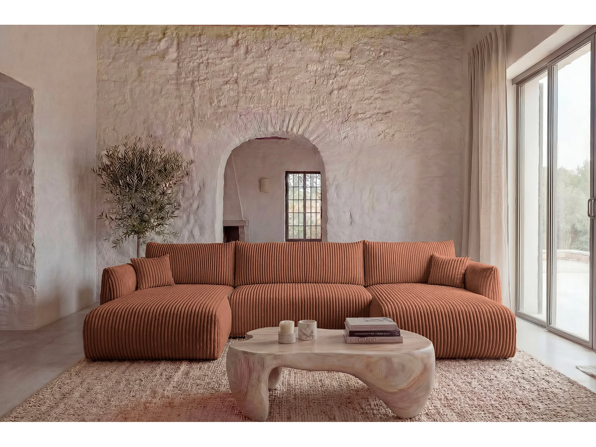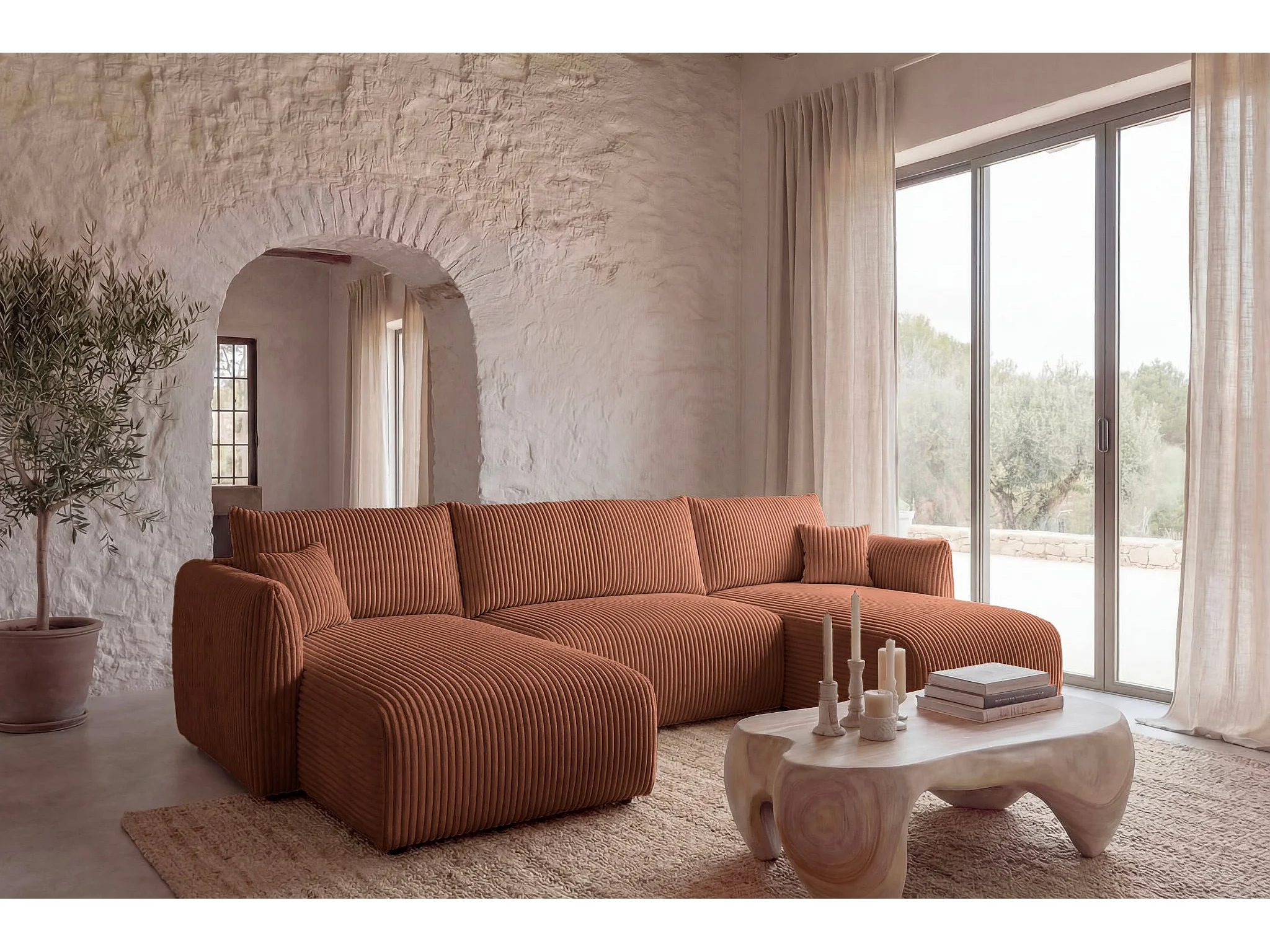 ELIO - Canapé panoramique convertible gros velours côtelé 5 places - Terracotta