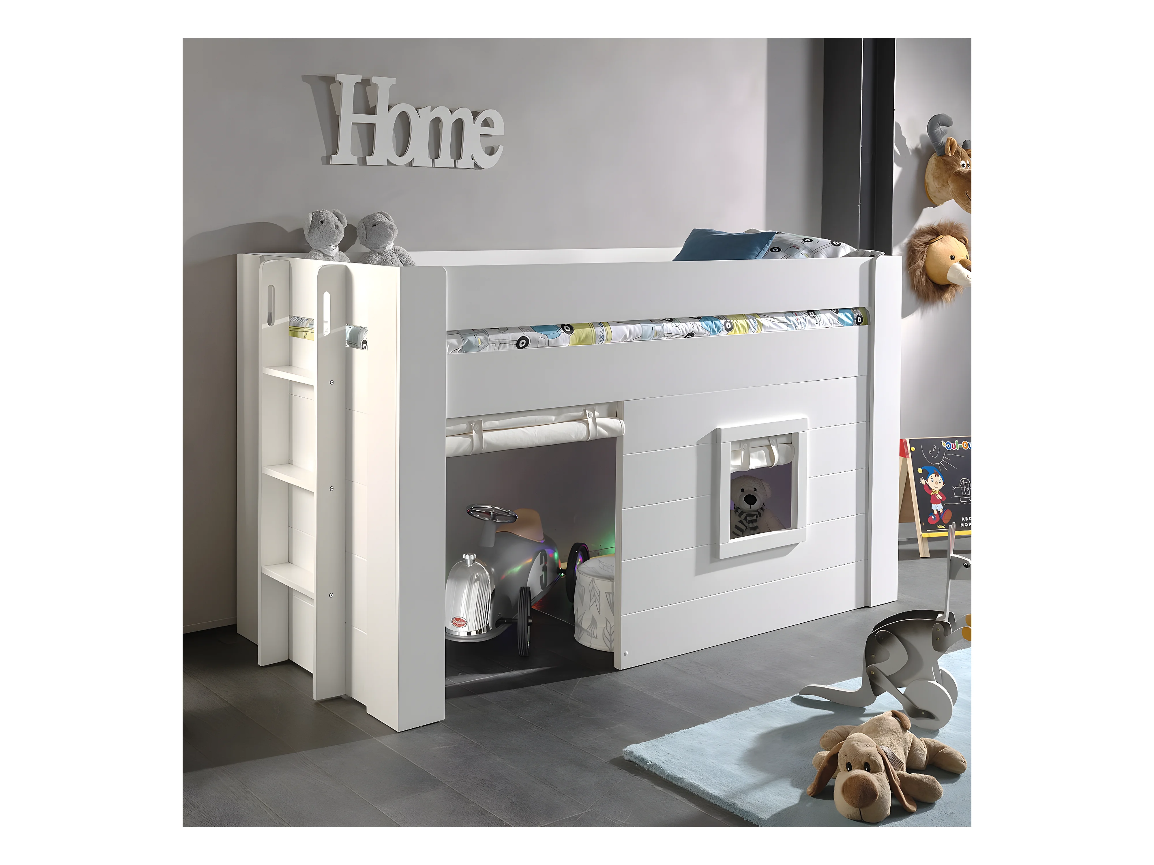 ELSA - Lit Surélevé Cabane 90x200cm Blanc avec Rideaux
