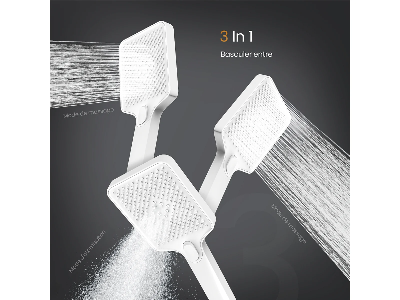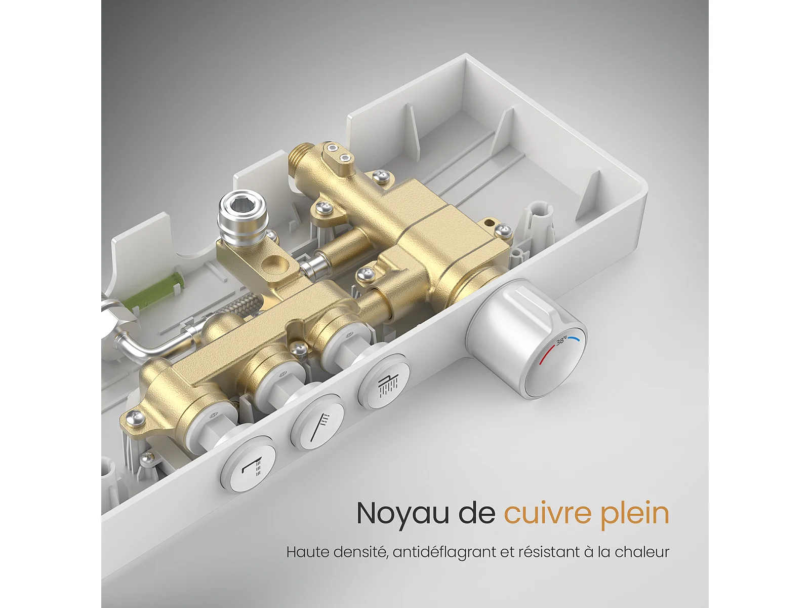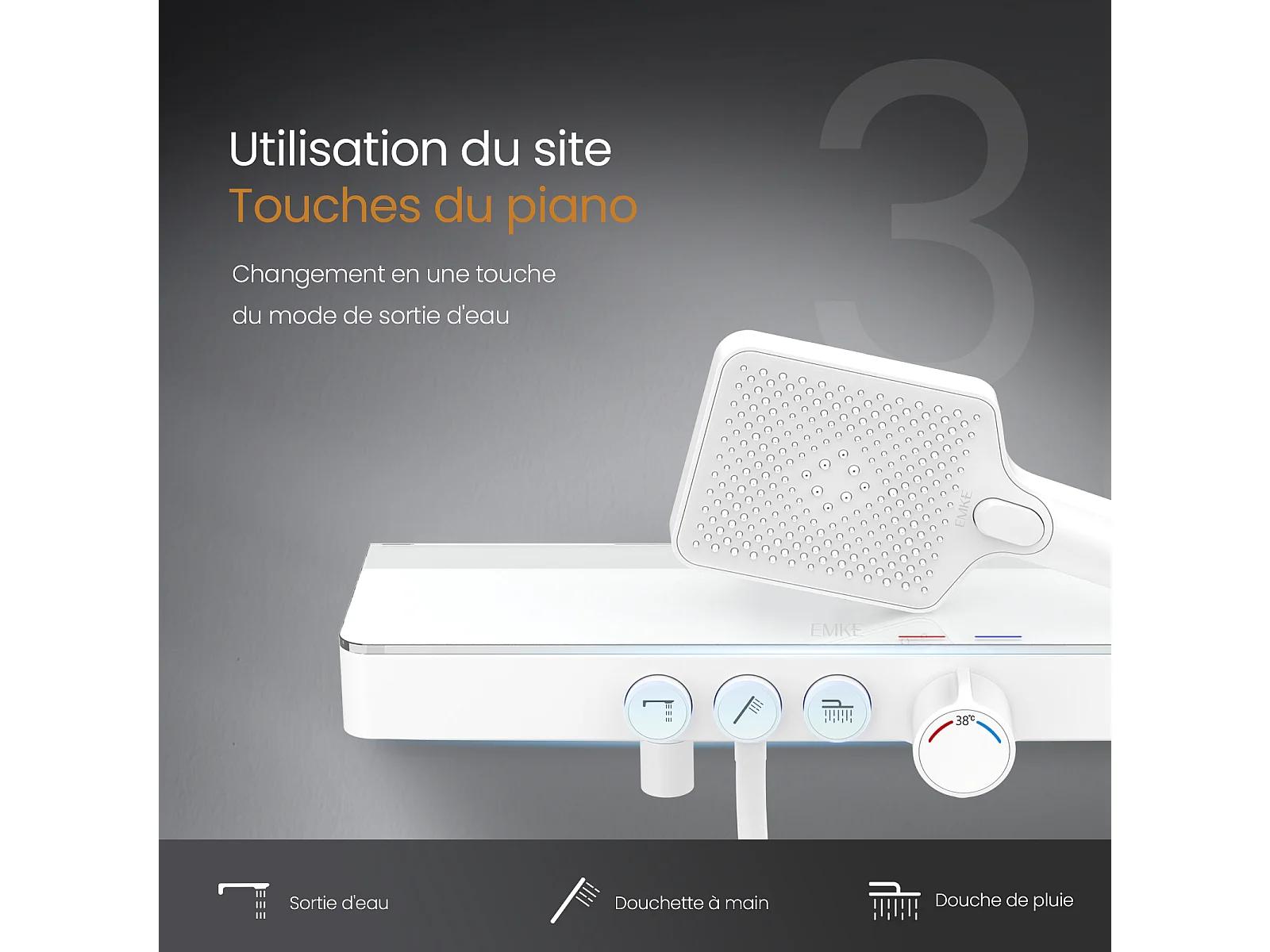 EMKE Colonne de douche Thermostat, 45 x 13 cm étagères en verre, 3 types de jets, douche à effet pluie, Certification KTW, Blanc