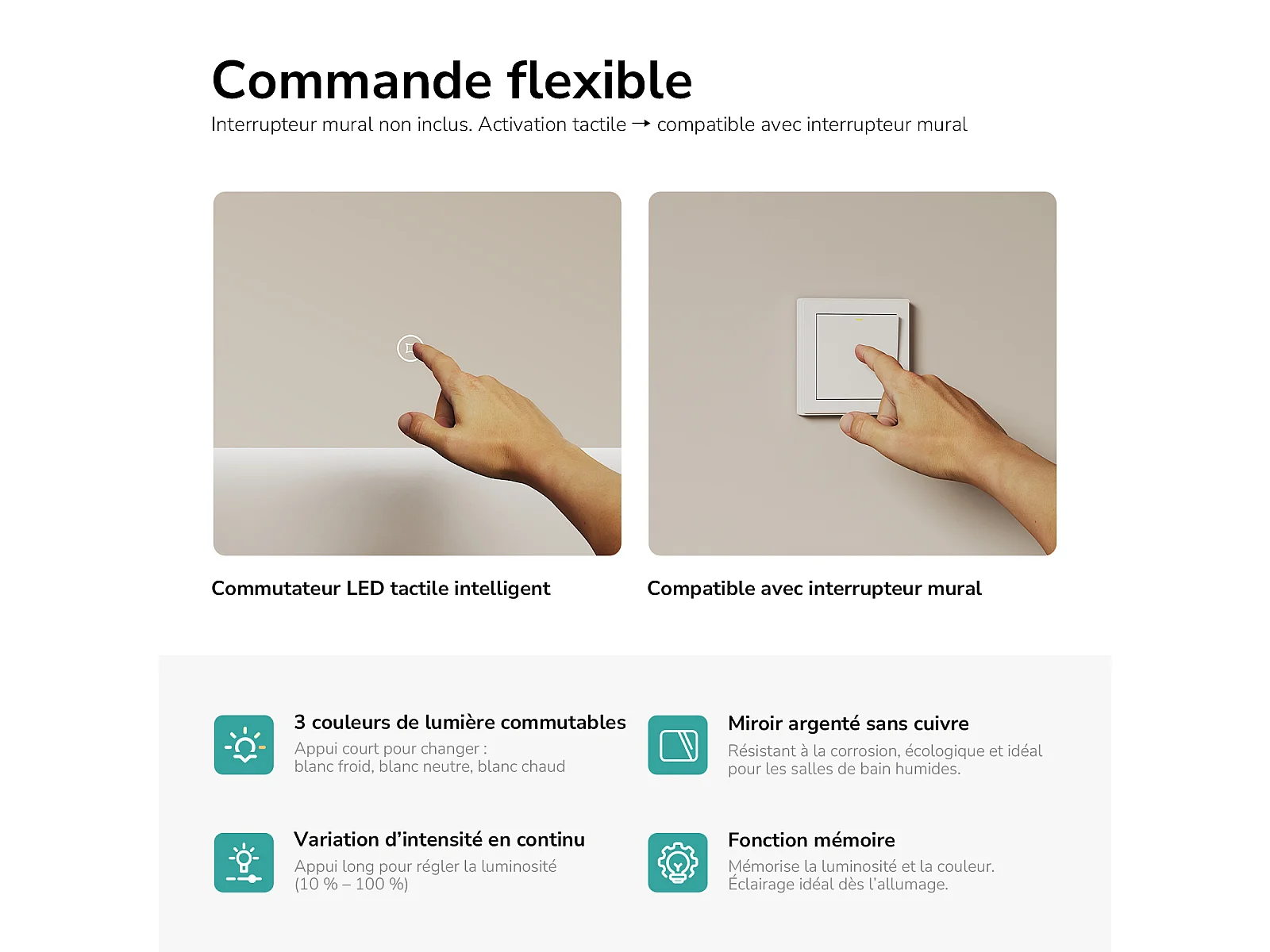 EMKE Miroir de salle de bain LED rectangulaire 100x60 cm tactile