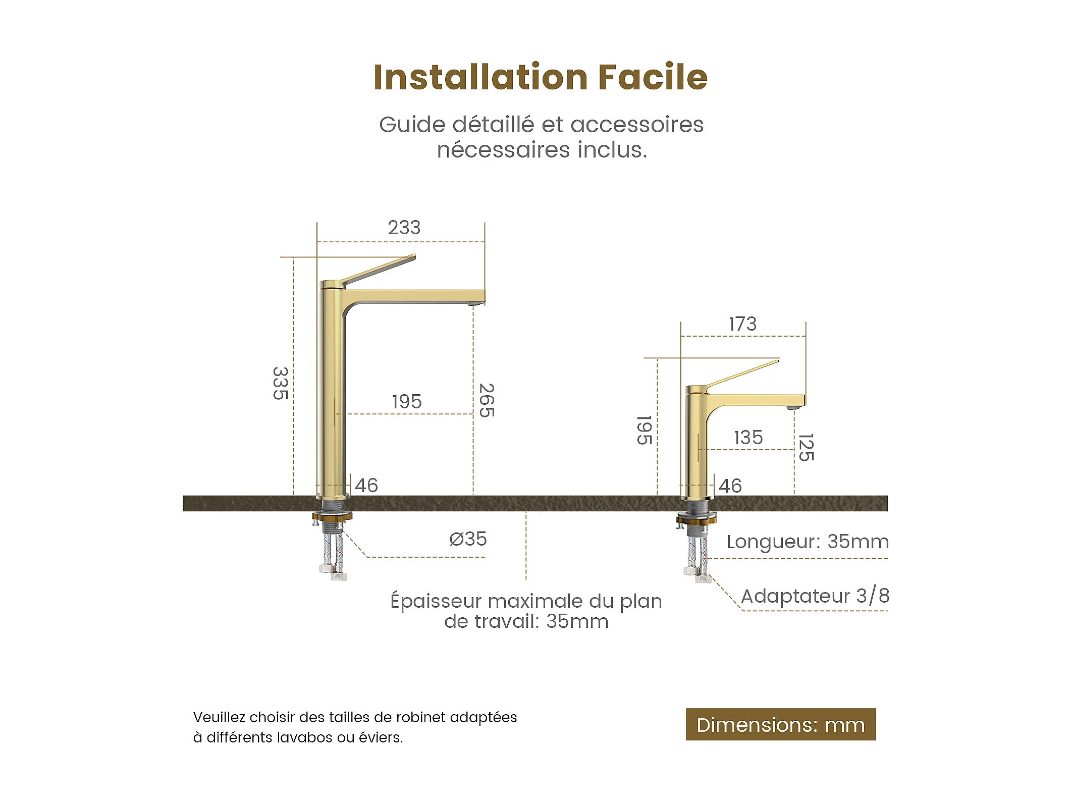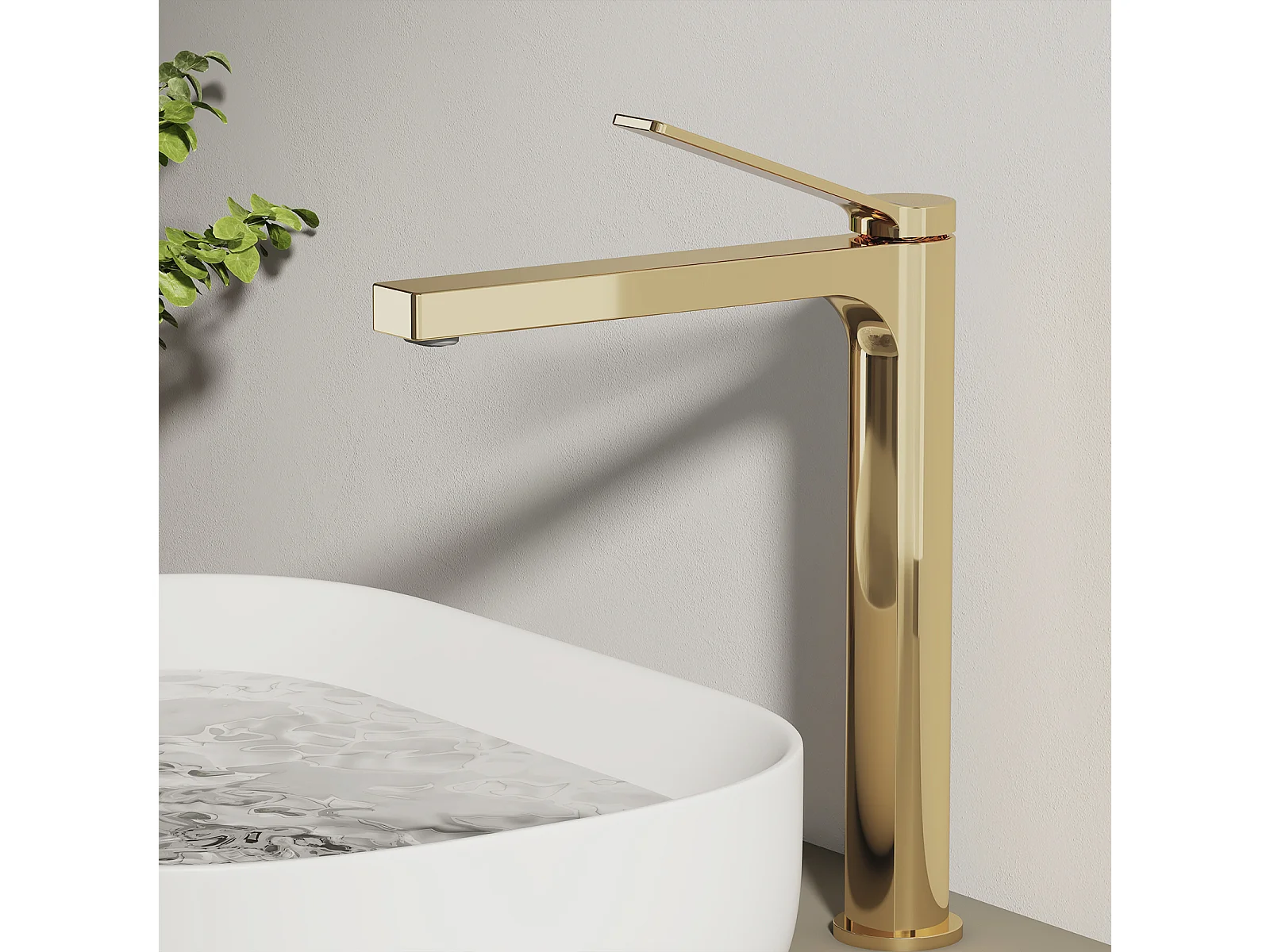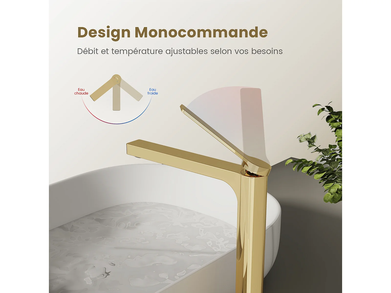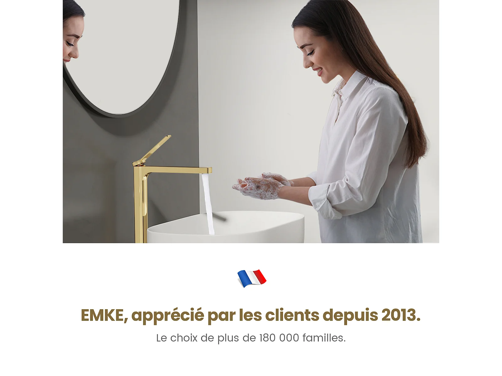 EMKE Mitigeur de lavabo haut salle de bain or champagne cartouche céramique laiton H.33,5 x L.23,3 cm