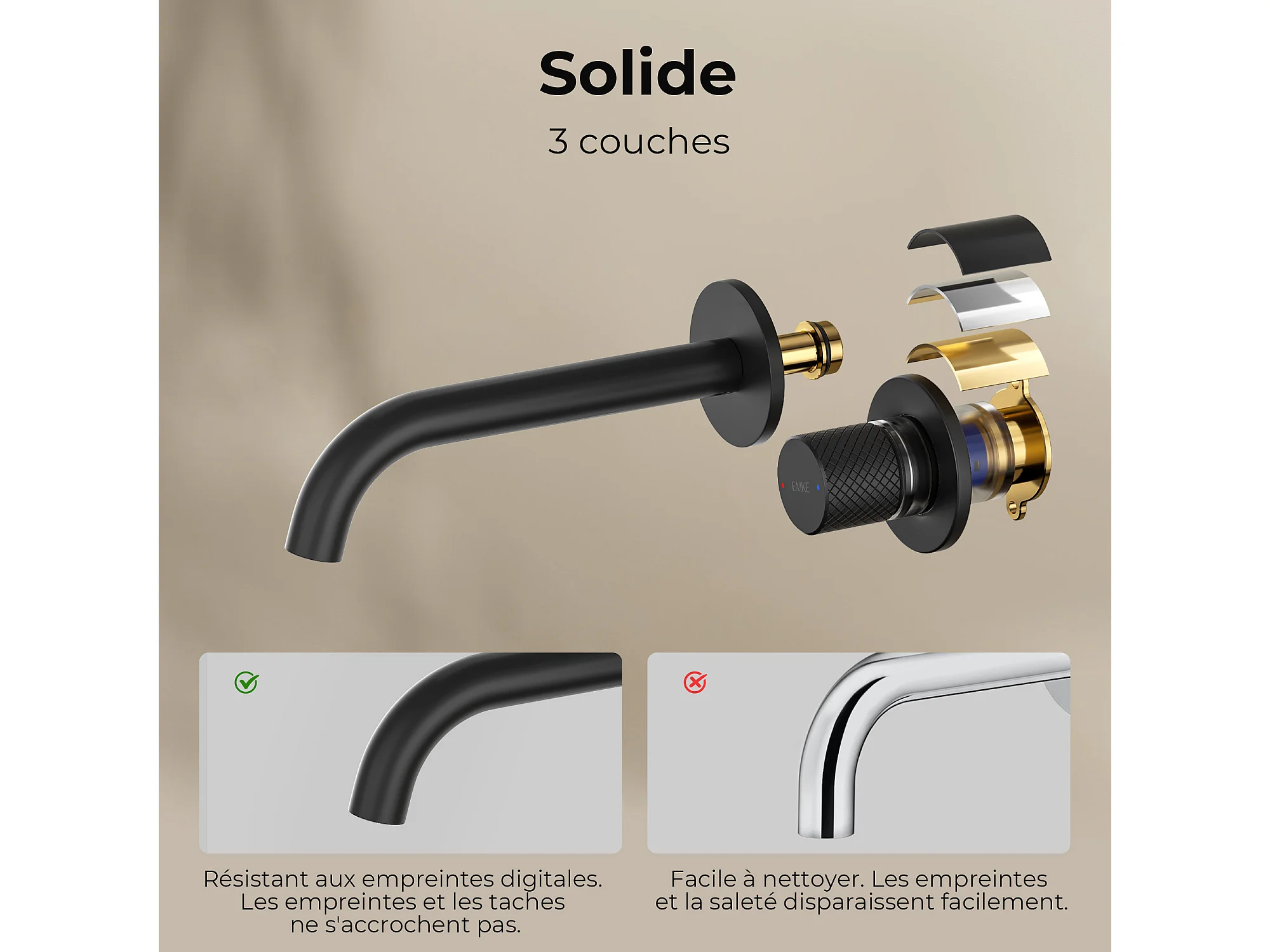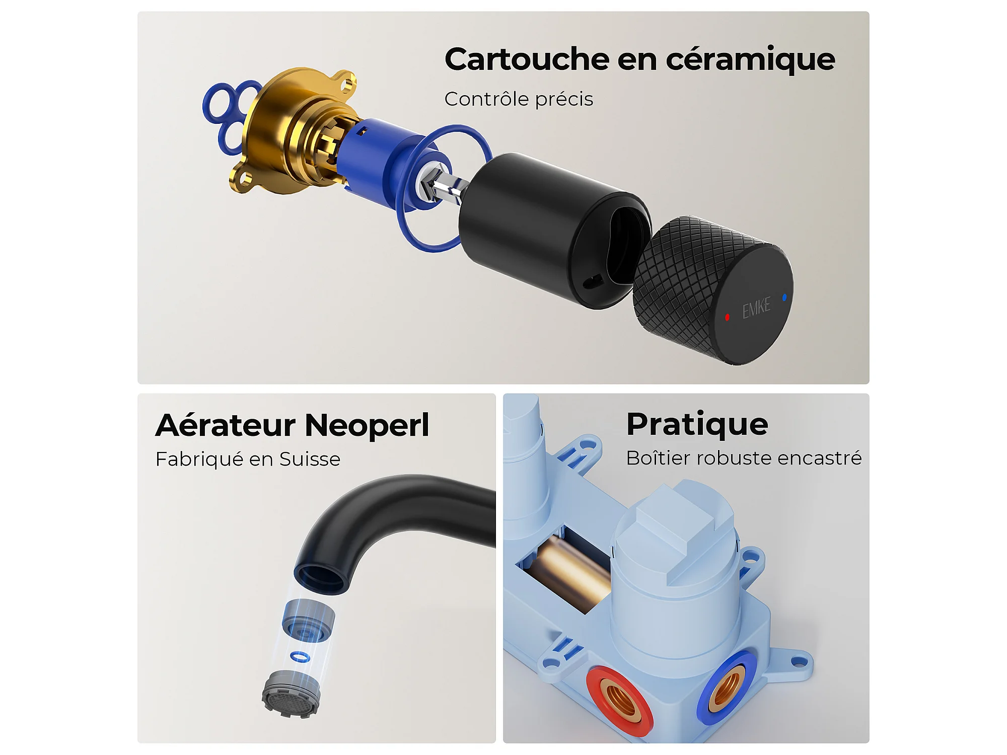 EMKE Mitigeur de lavabo mural encastrable bi-trou noir mat laiton cartouche céramique L.18 cm