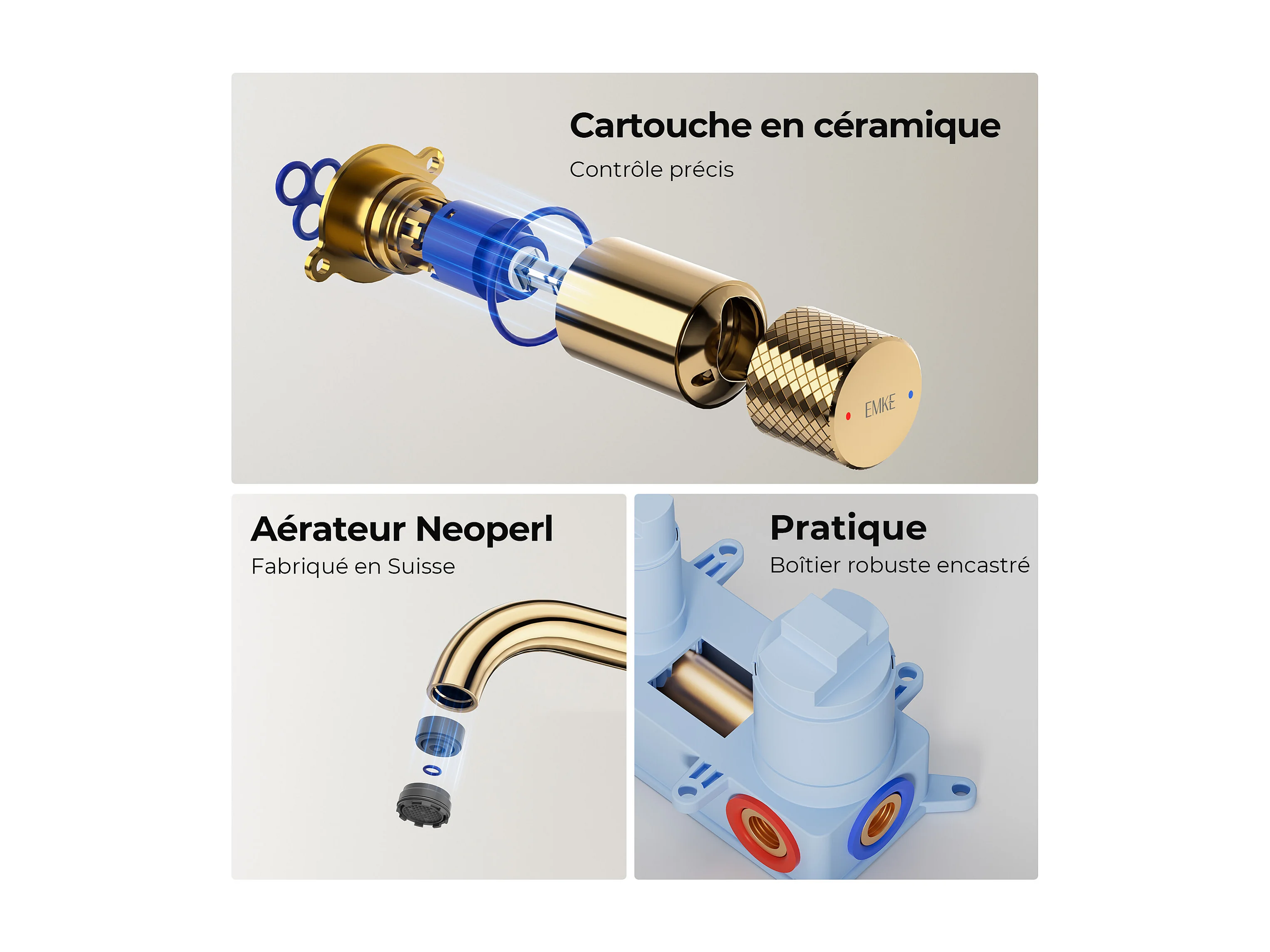 EMKE Mitigeur de lavabo mural encastrable bi-trou or champagne laiton cartouche céramique L.18 cm