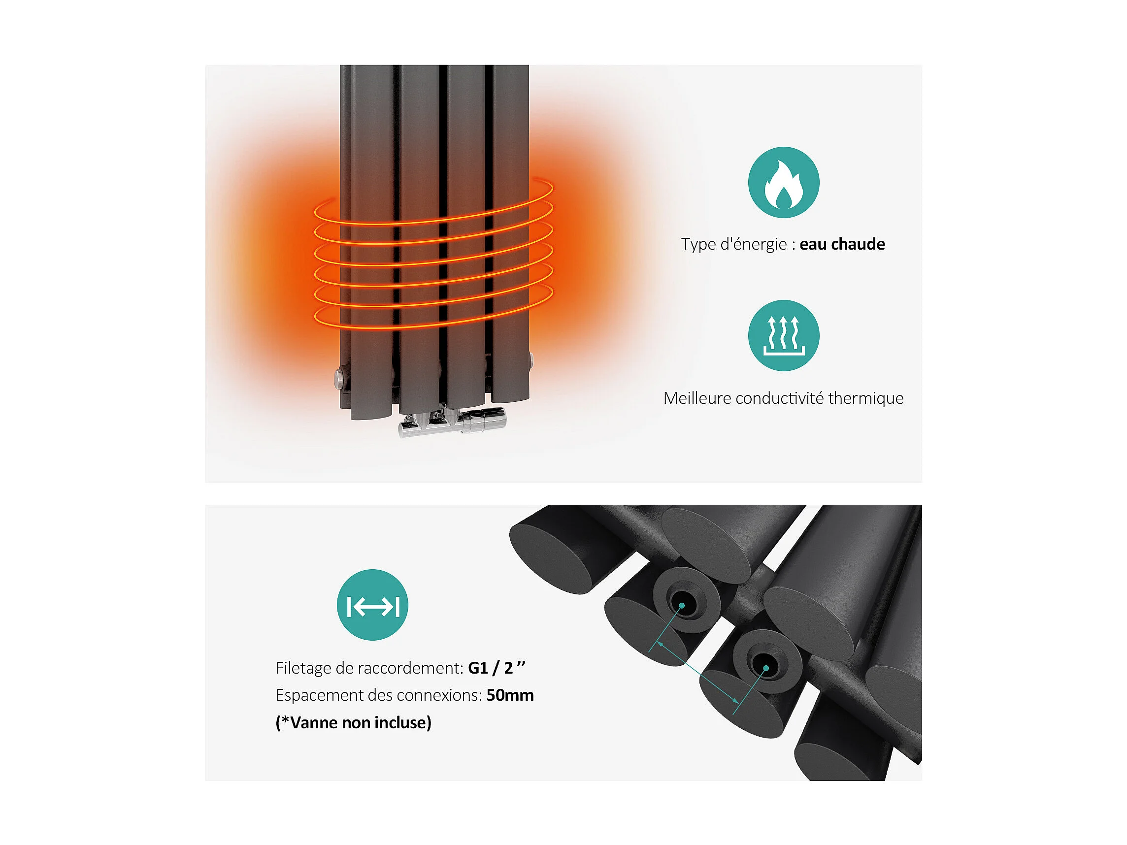EMKE Radiateur eau chaude verticale en acier H.60 × L.24 cm 248 W Classique Chauffage central simple couche noir