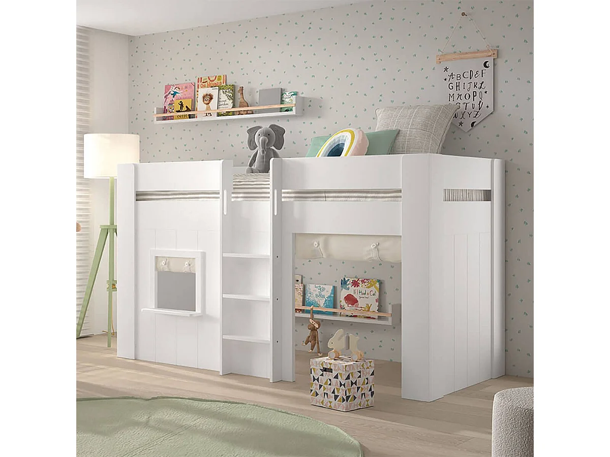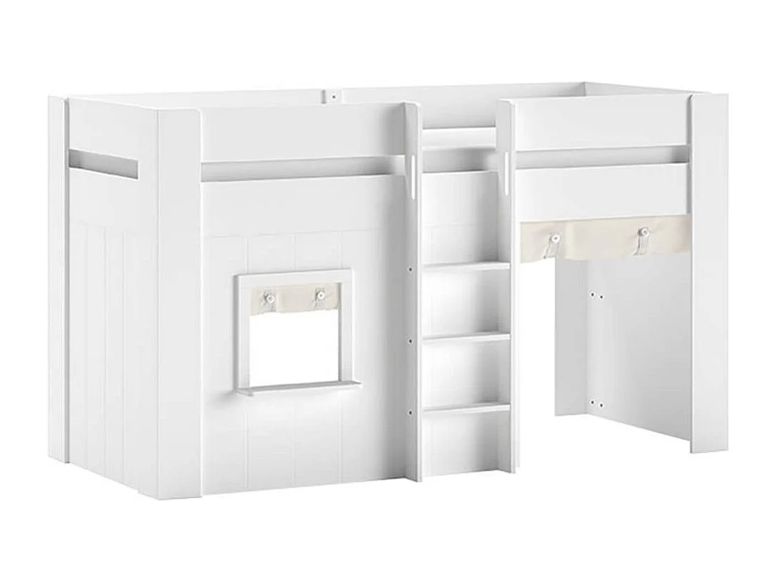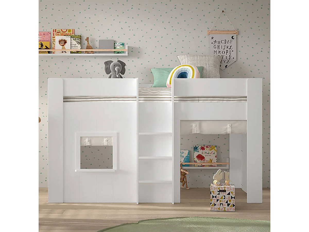 EMRYS - Lit Mi-Hauteur à Fenêtres 90x200cm en MDF Laqué Blanc avec Rideaux