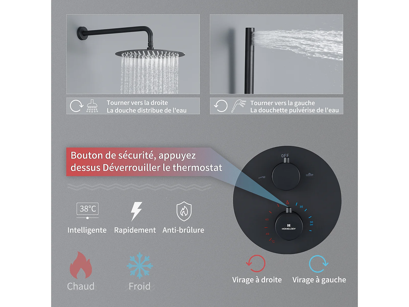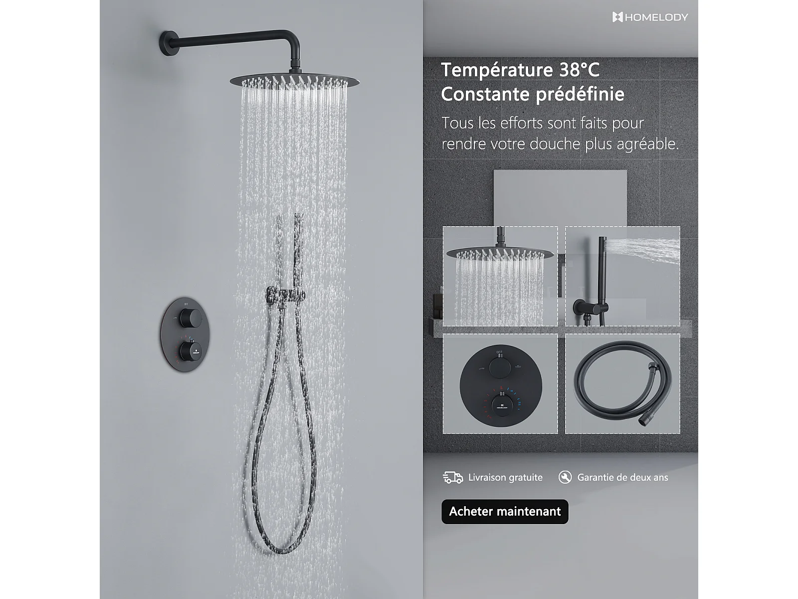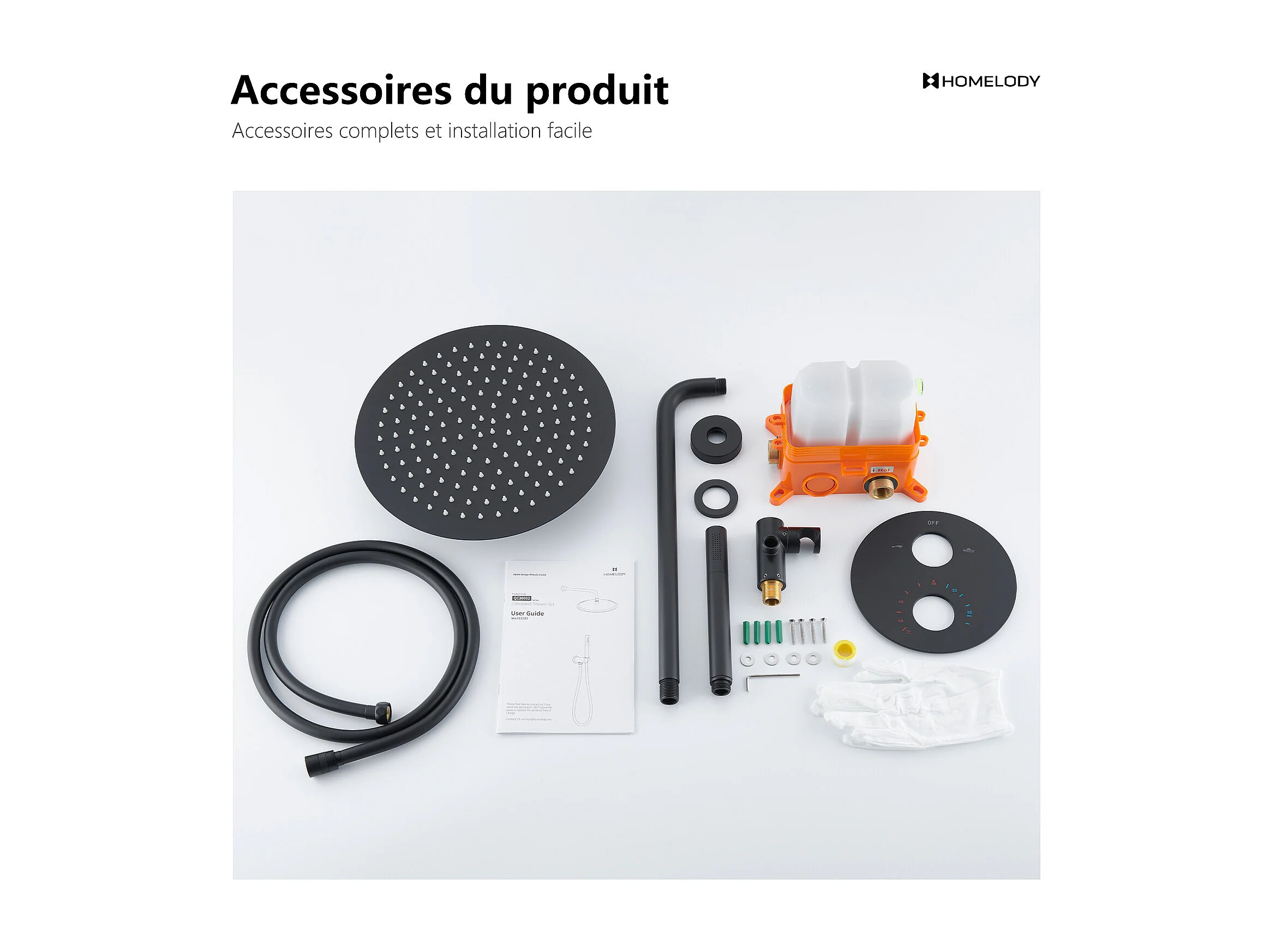 Encastré Ensemble de Douche Thermostatique Colonne de Douche Noir Système de douche Corps en Laiton HOMELODY