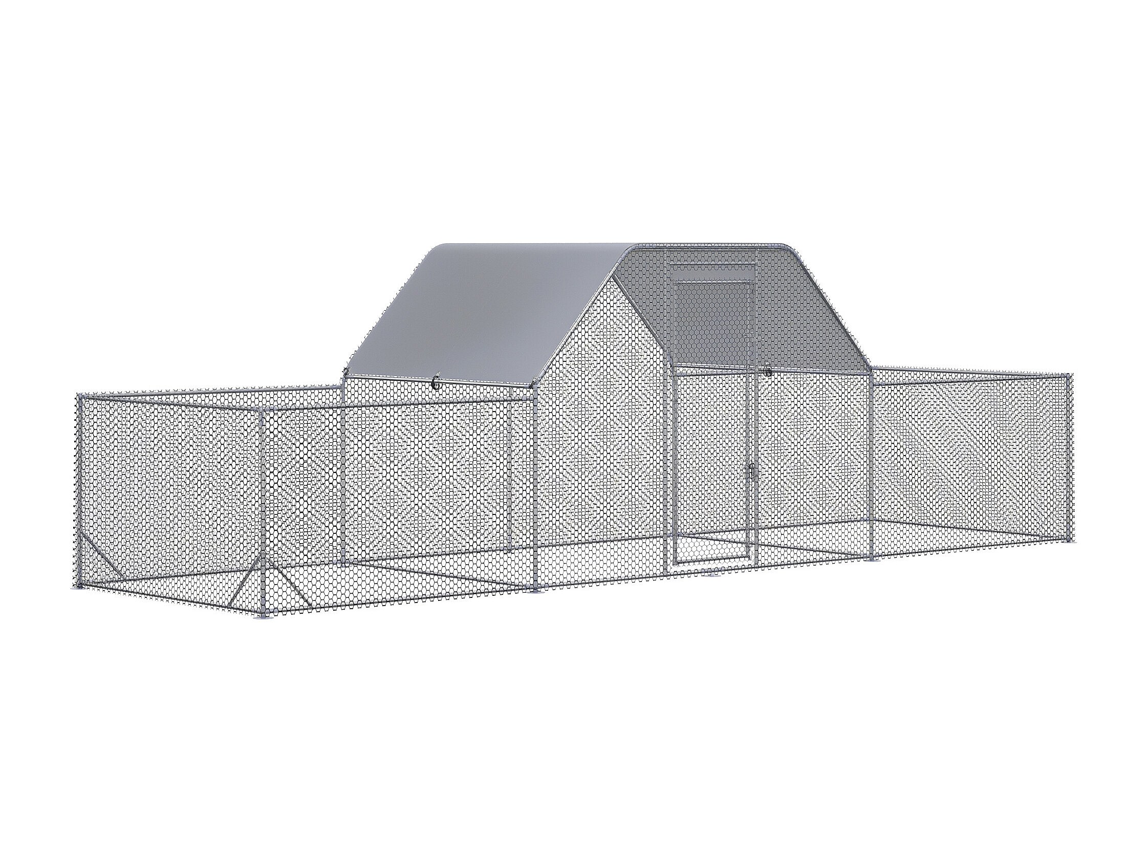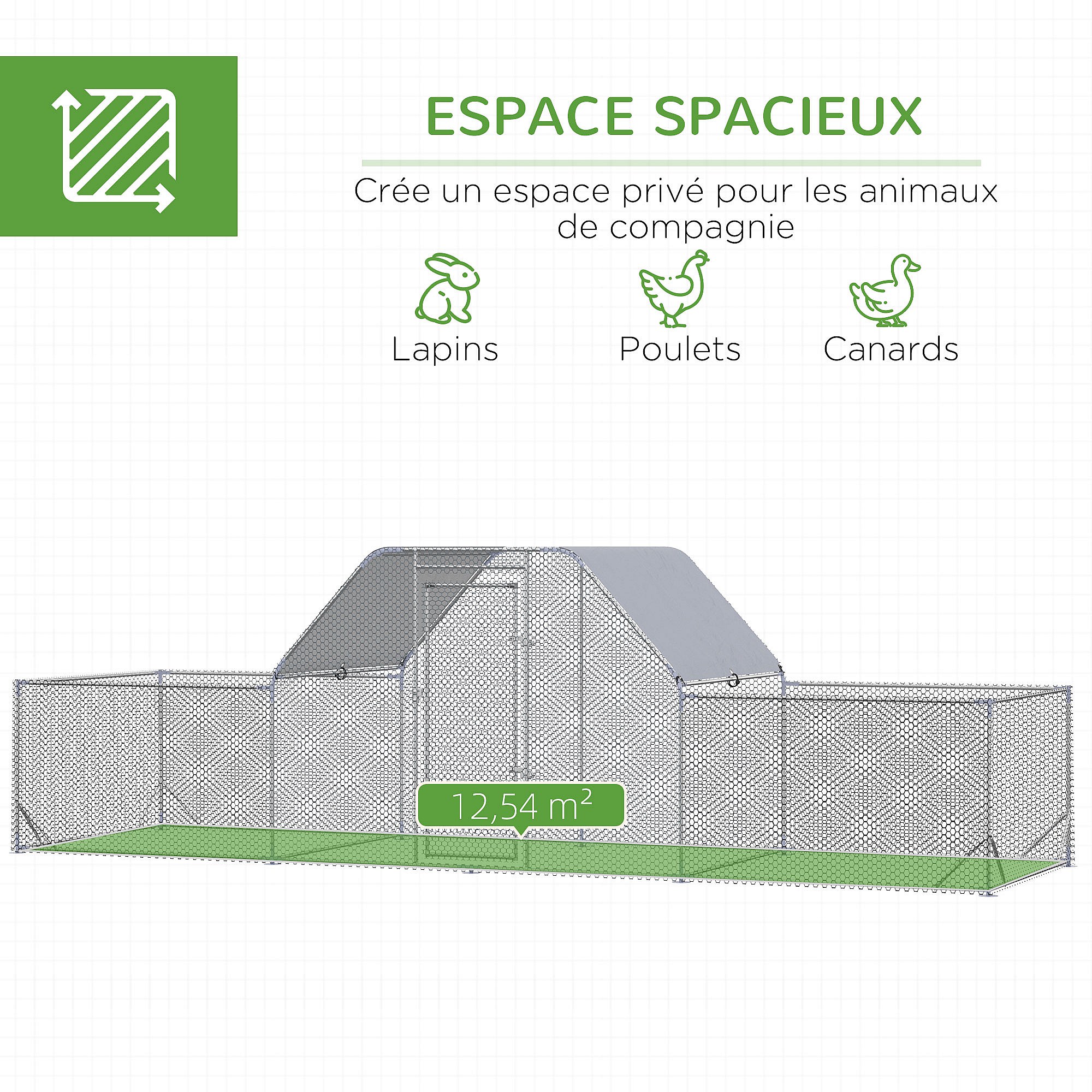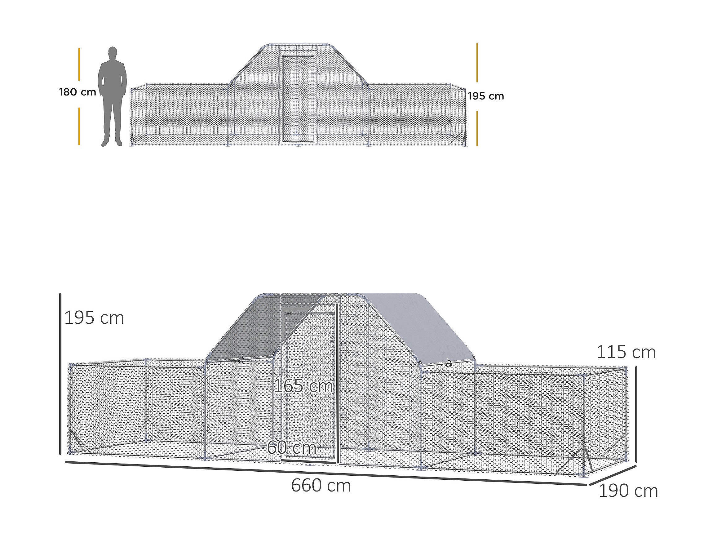 Enclos poulailler chenil 12,54 m² - parc grillagé dim 6,6L x 1,9l x 1,95H m - espace couvert - acier galvanisé