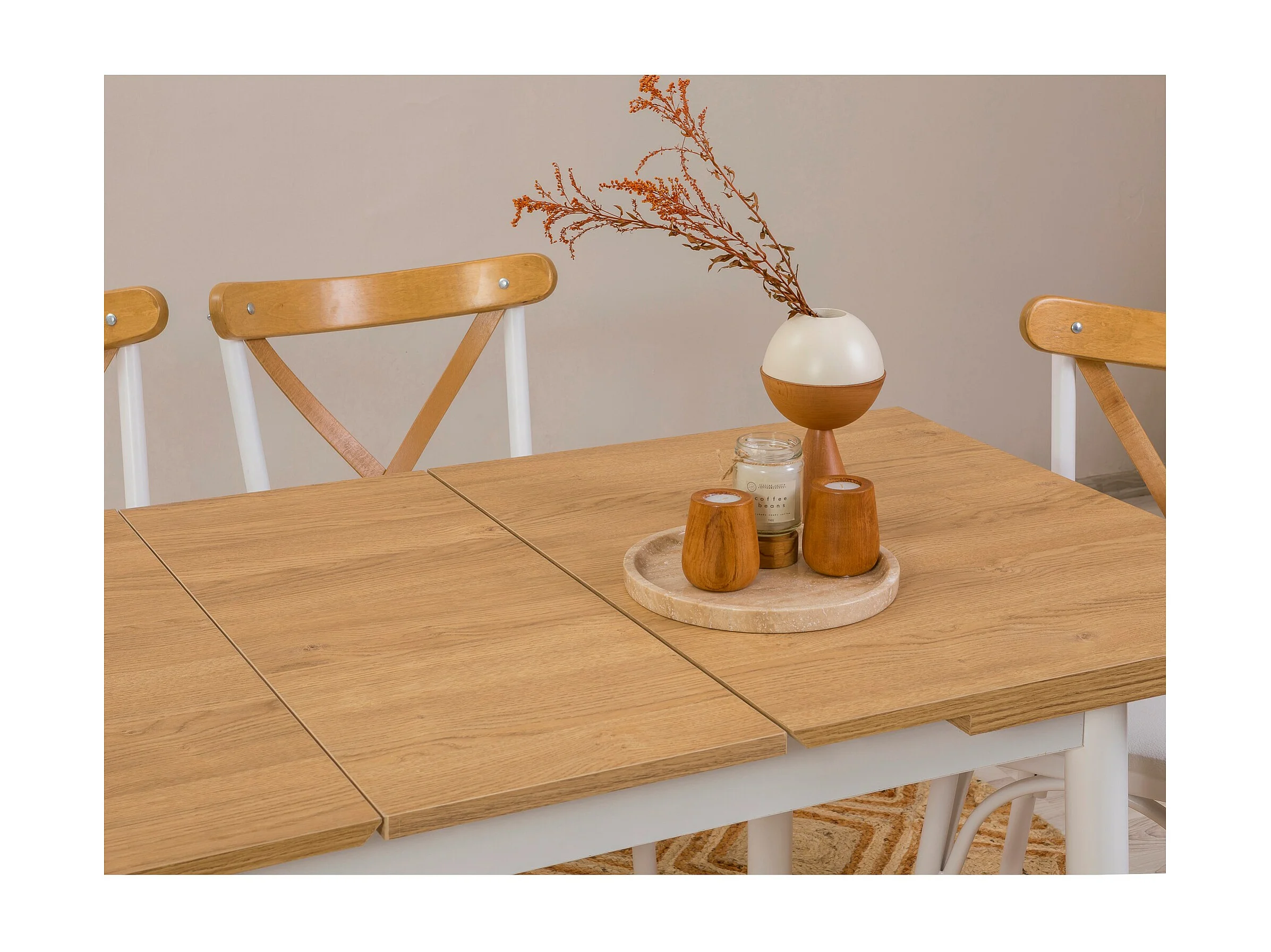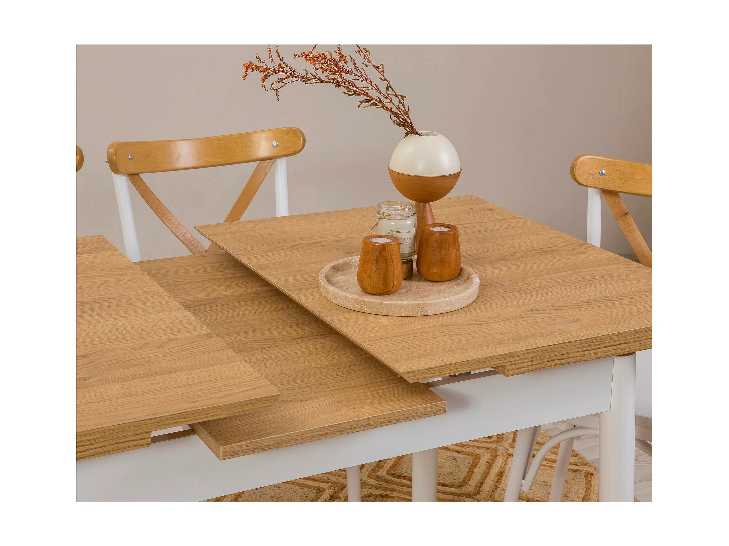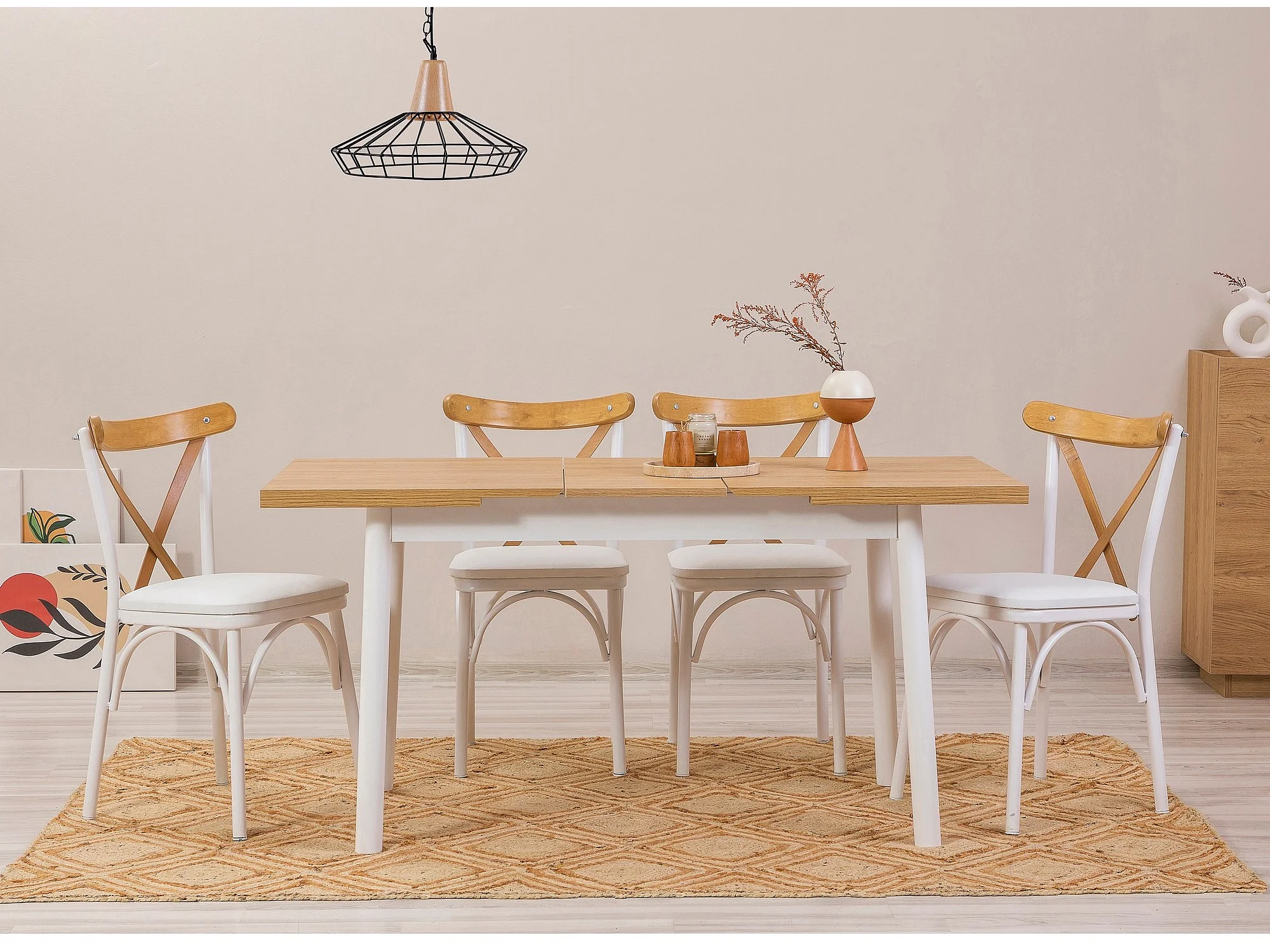 Ensemble 1 table extensible et 4 chaises bois naturel et blanc Kontante
