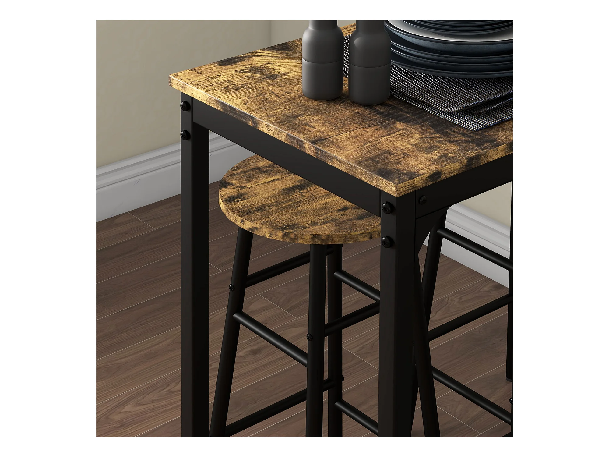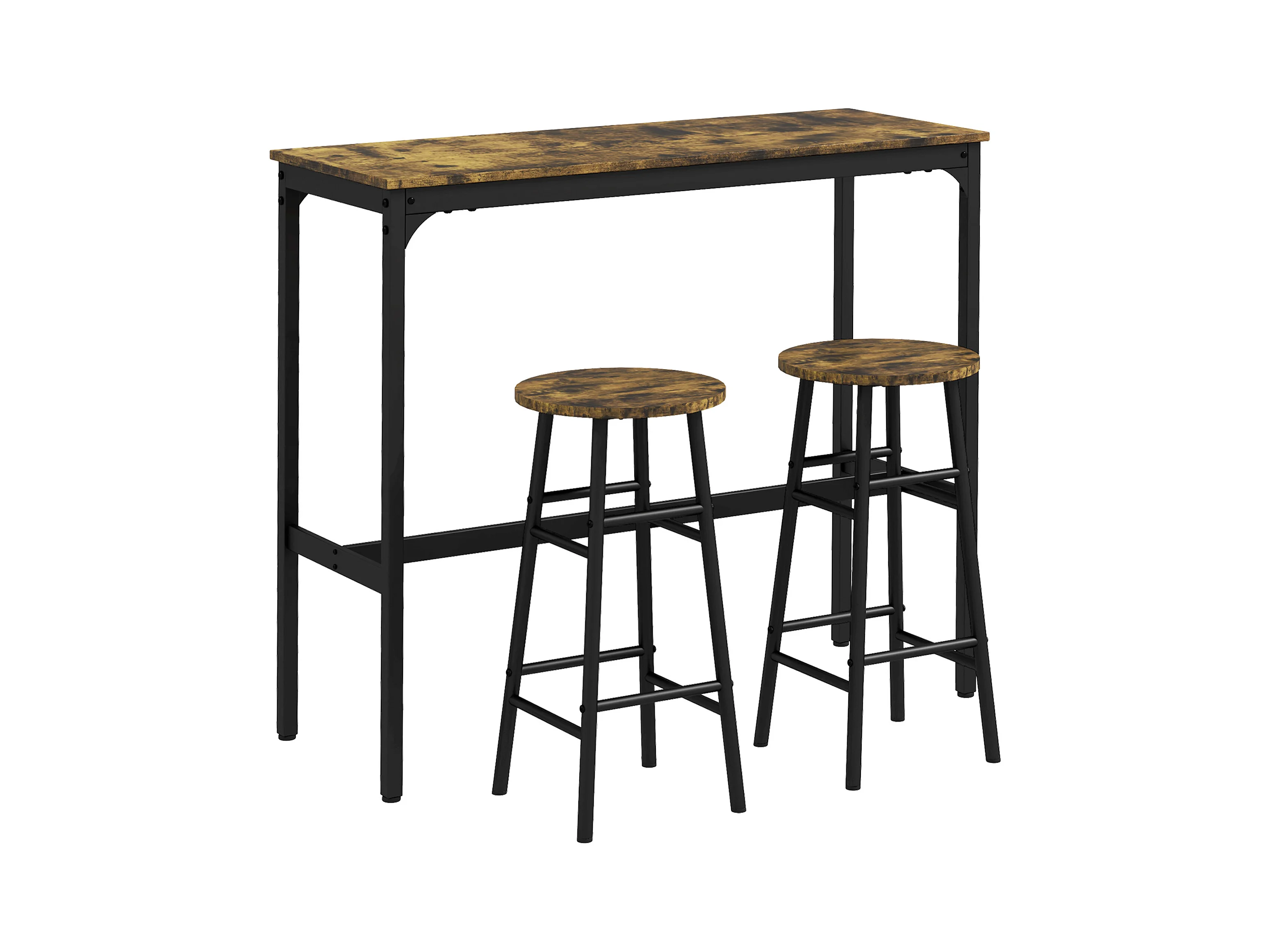 Ensemble 2 places 3 pièces design contemporain - table de bar, 2 tabourets de bar - acier noir aspect bois vieilli