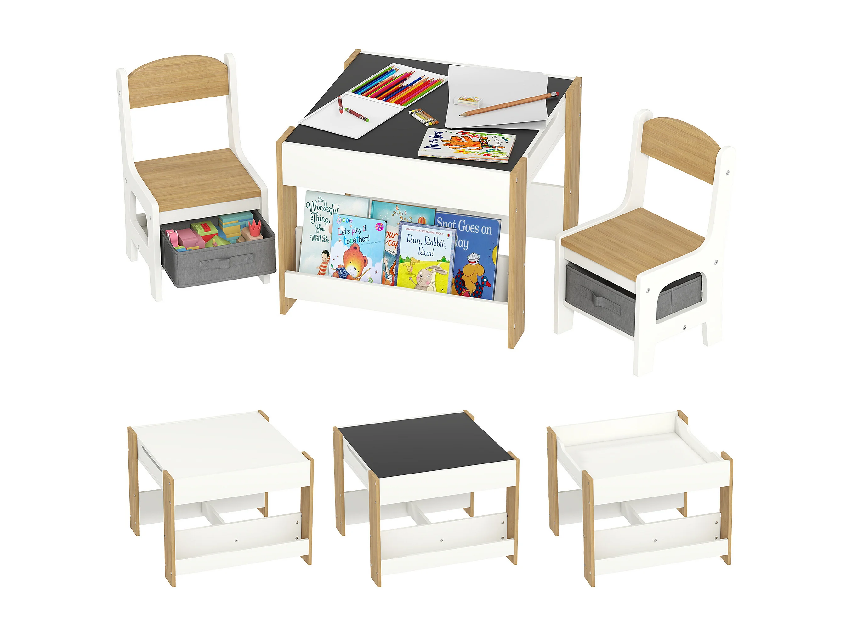 Ensemble 3 pièces table 2 chaises enfant - plateau table réversible tableau noir - rangement - étagères