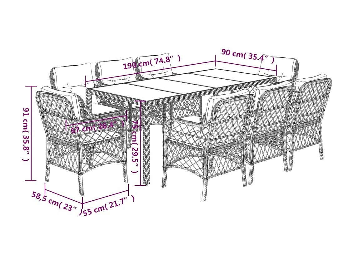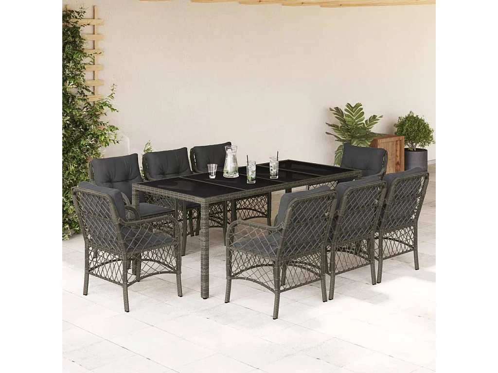 Ensemble à manger de jardin 9 pcs coussins gris résine tressée