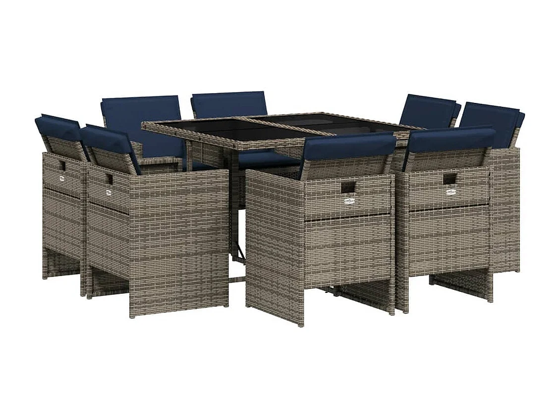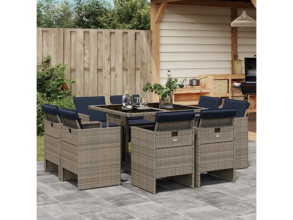 Ensemble à manger de jardin 9 pièces coussins gris résine tressée