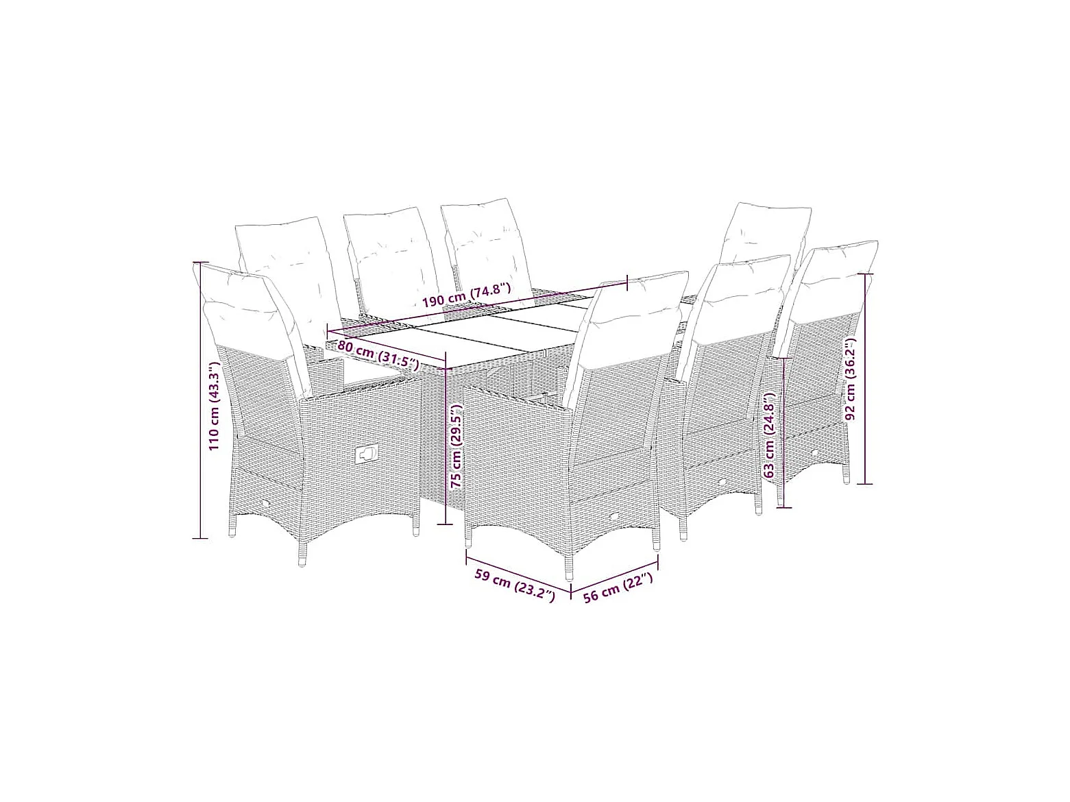 Ensemble à manger de jardin 9 pièces coussins noir résine tressée
