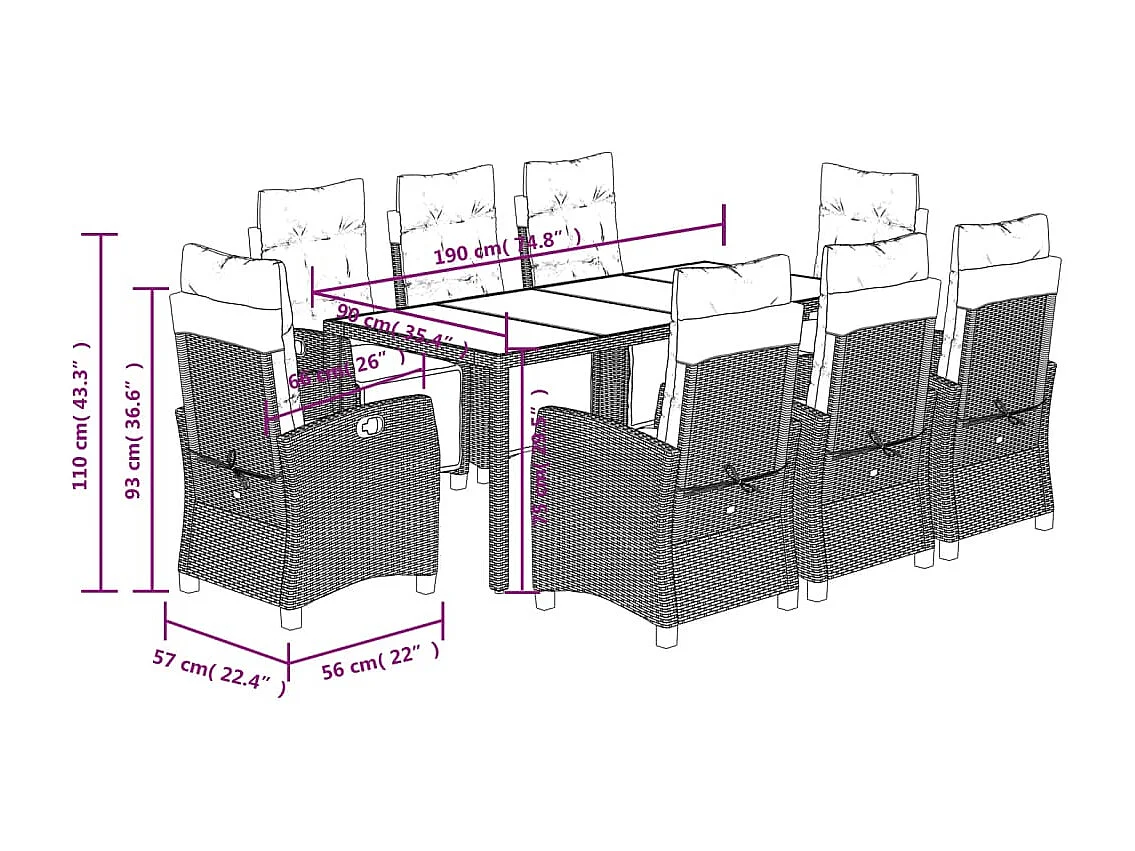 Ensemble à manger de jardin 9pcs coussins noir résine tressée