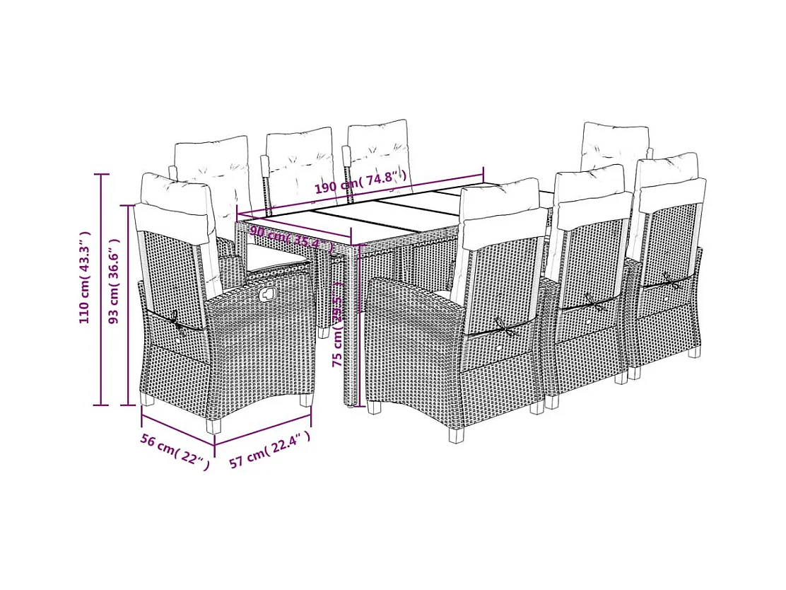 Ensemble à manger de jardin 9pcs coussins noir résine tressée