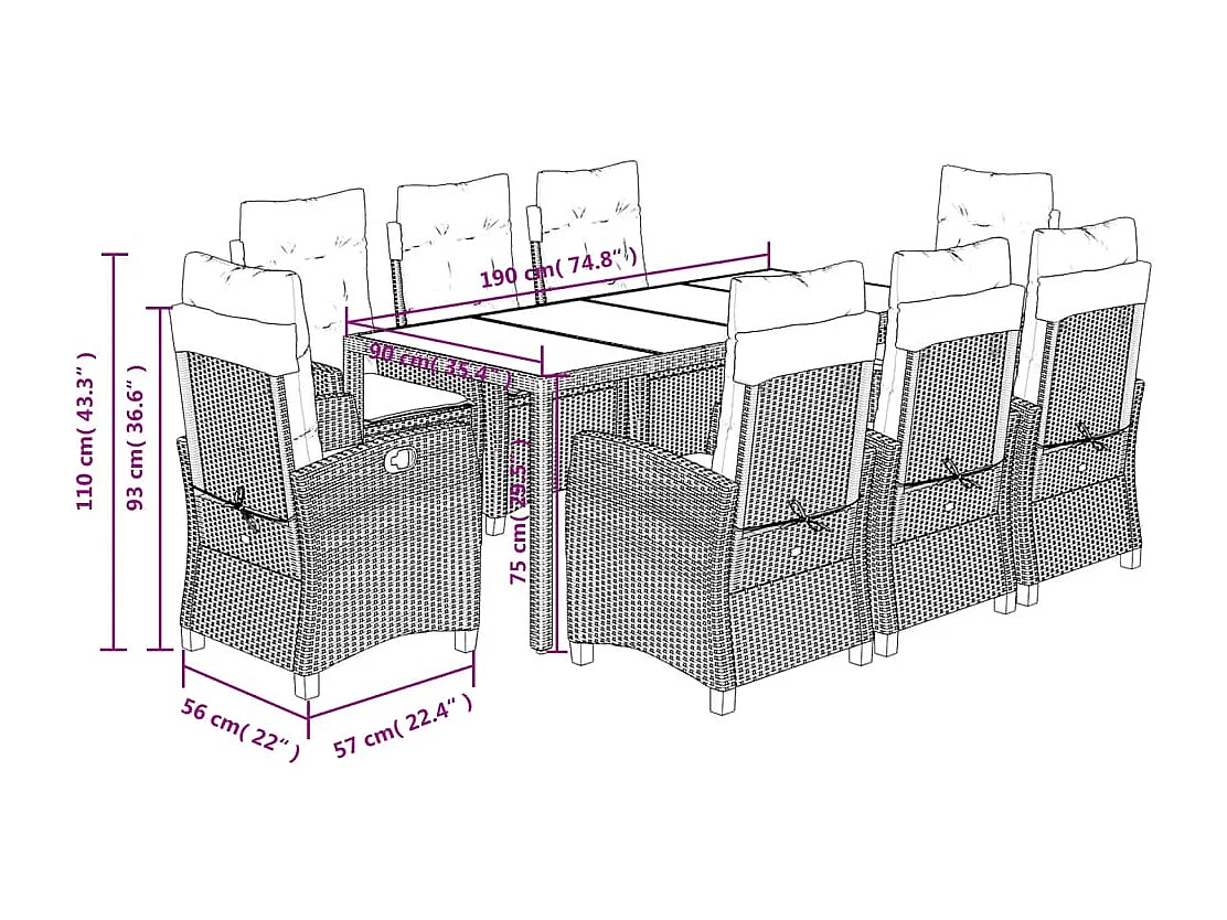 Ensemble à manger de jardin 9pcs coussins noir résine tressée