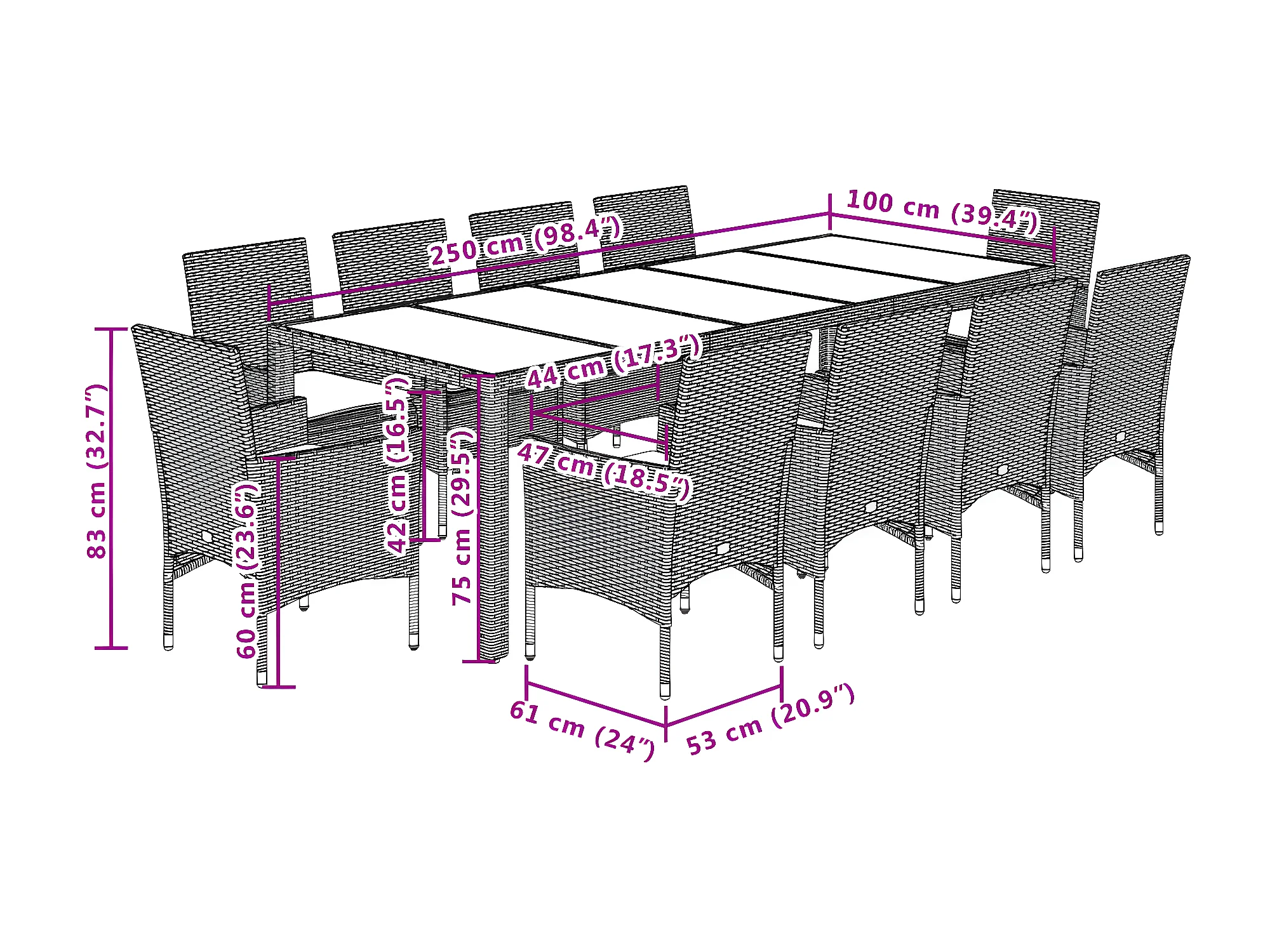Ensemble à manger de jardin et coussins 11pcs beige rotin verre