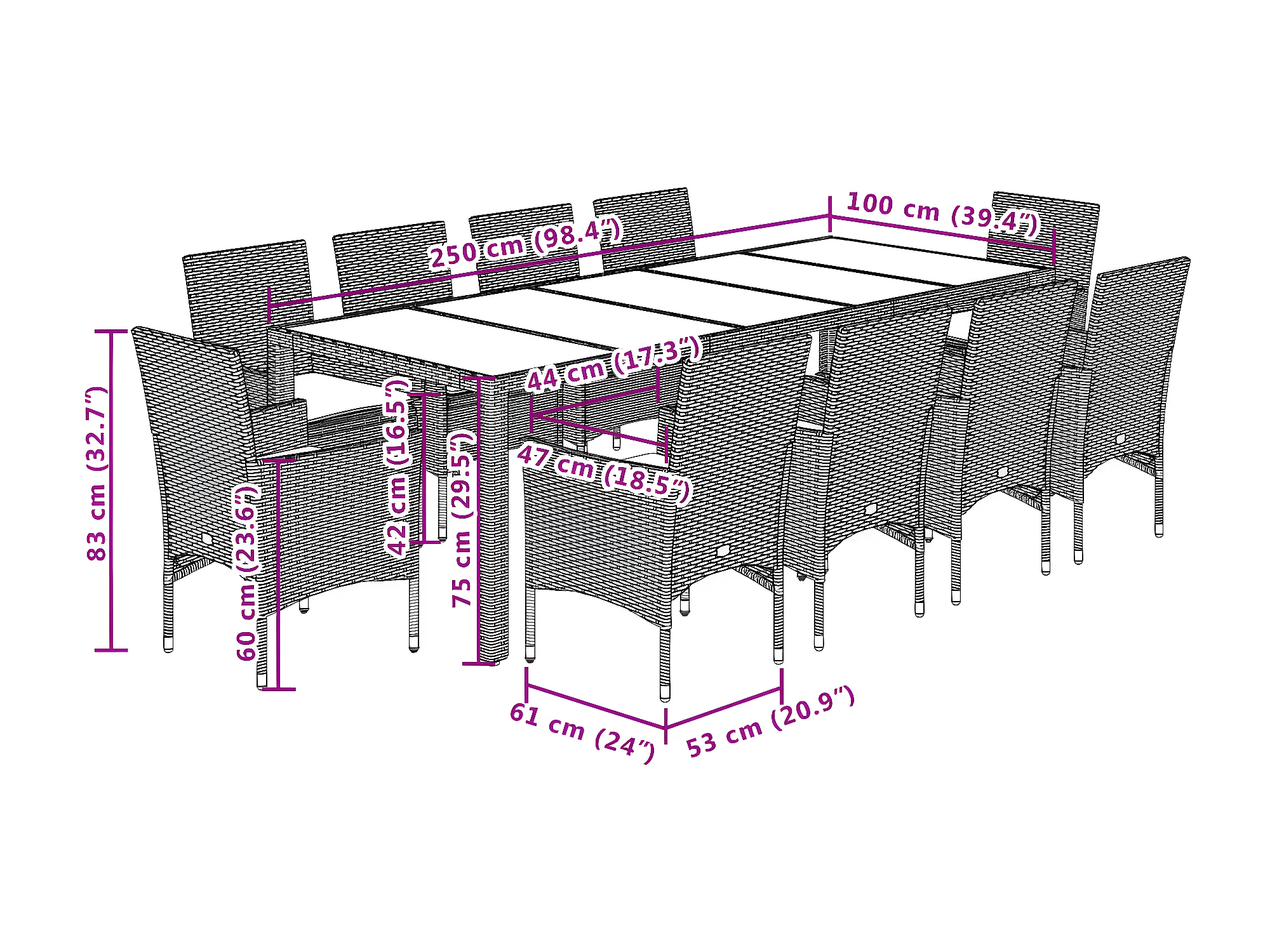 Ensemble à manger de jardin et coussins 11pcs beige rotin verre