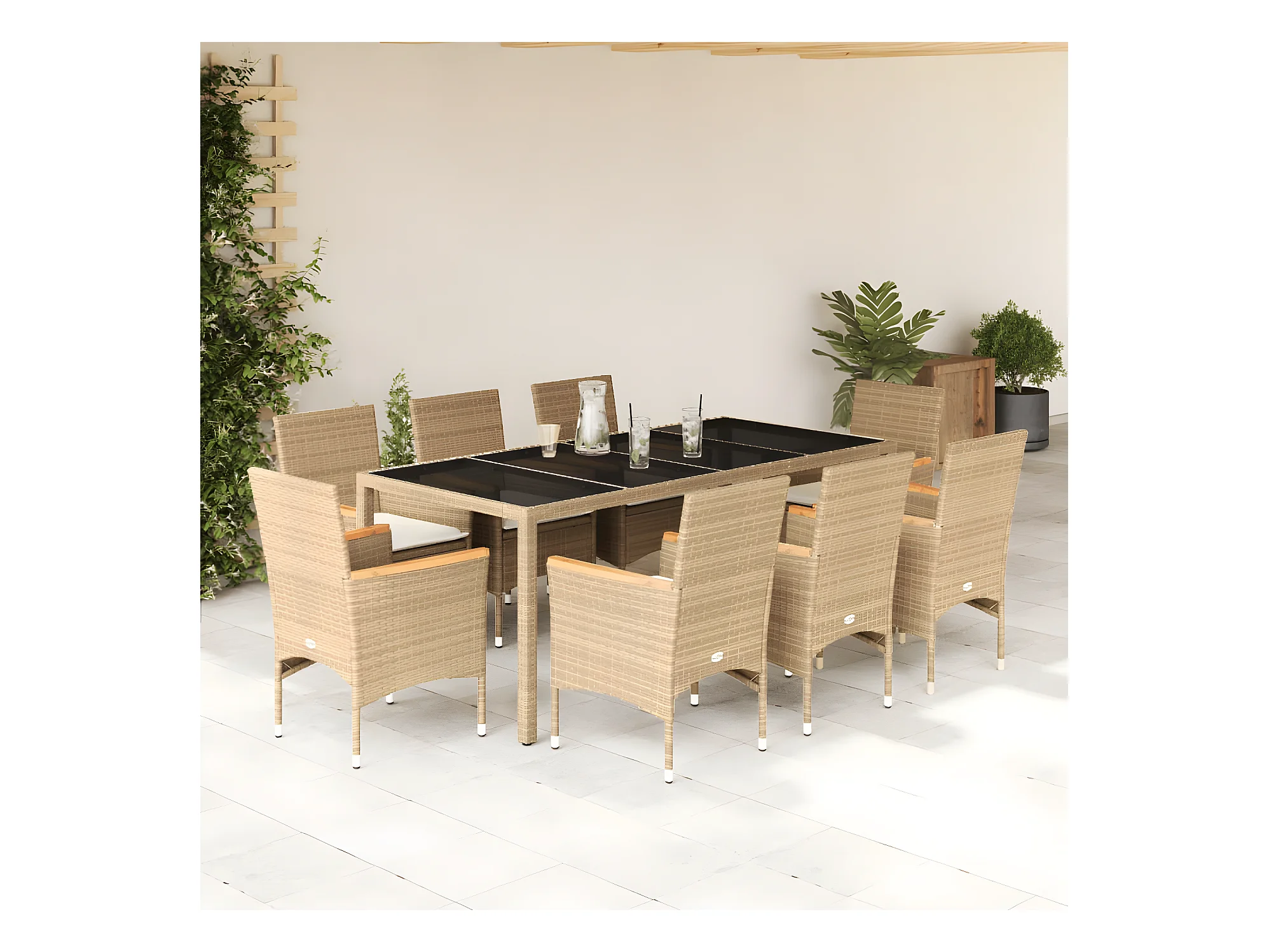 Ensemble à manger de jardin et coussins 9 pcs beige rotin verre