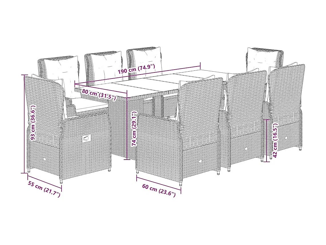 Ensemble à manger de jardin et coussins 9 pcs gris clair rotin