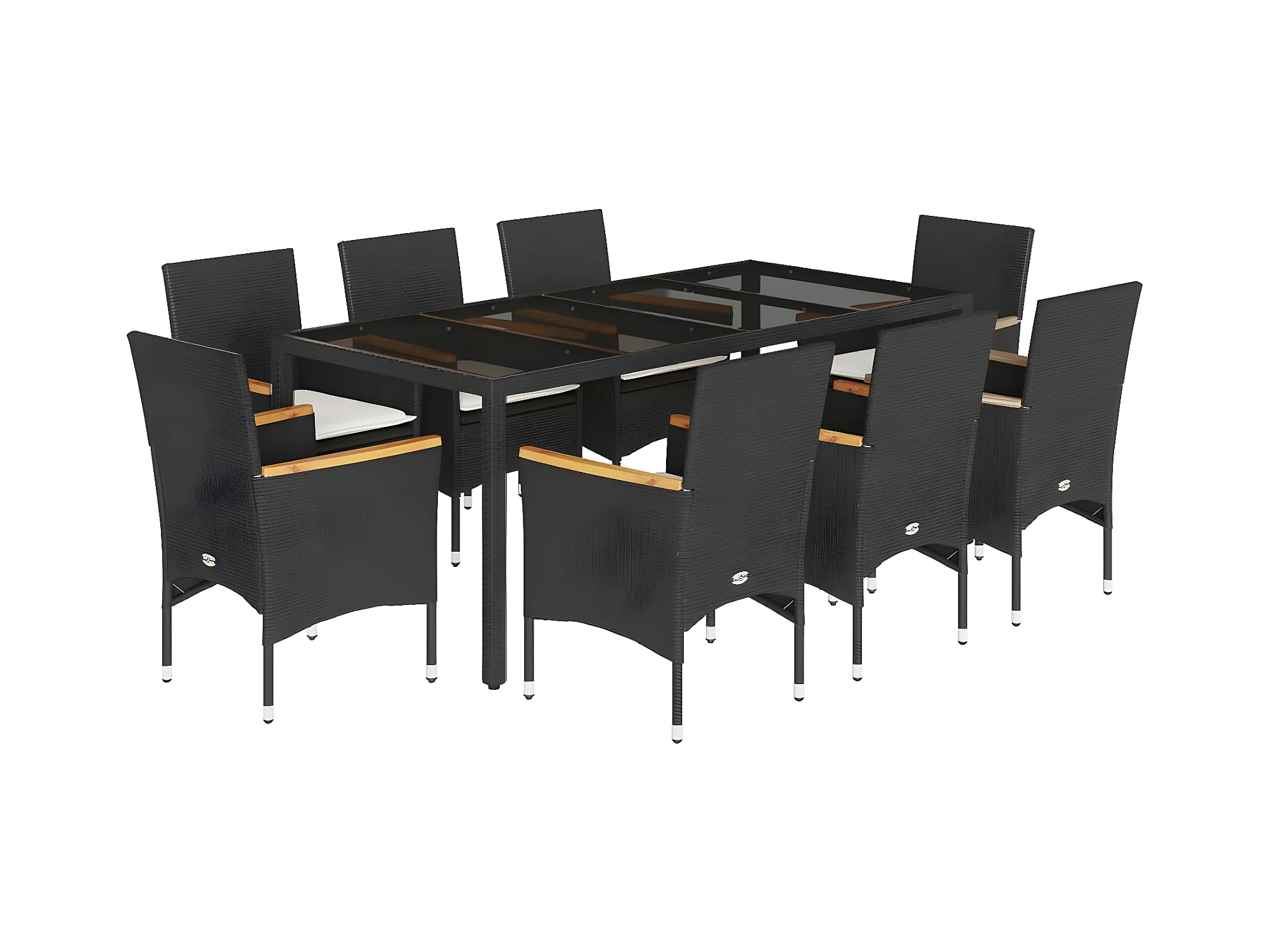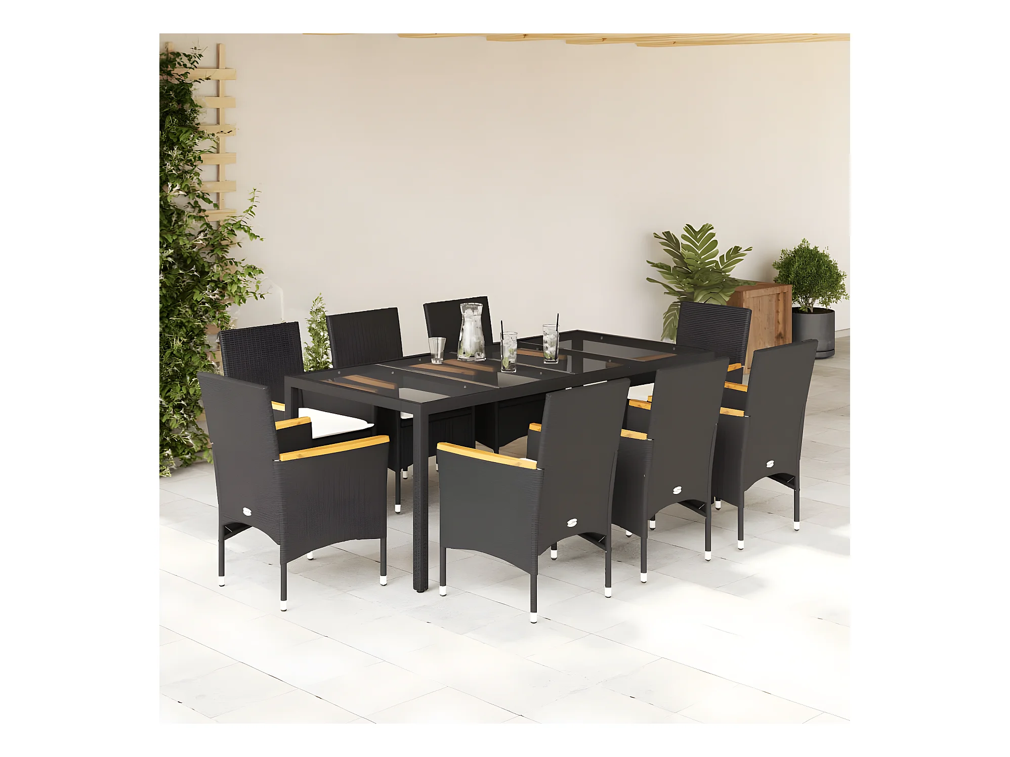 Ensemble à manger de jardin et coussins 9 pcs noir rotin verre