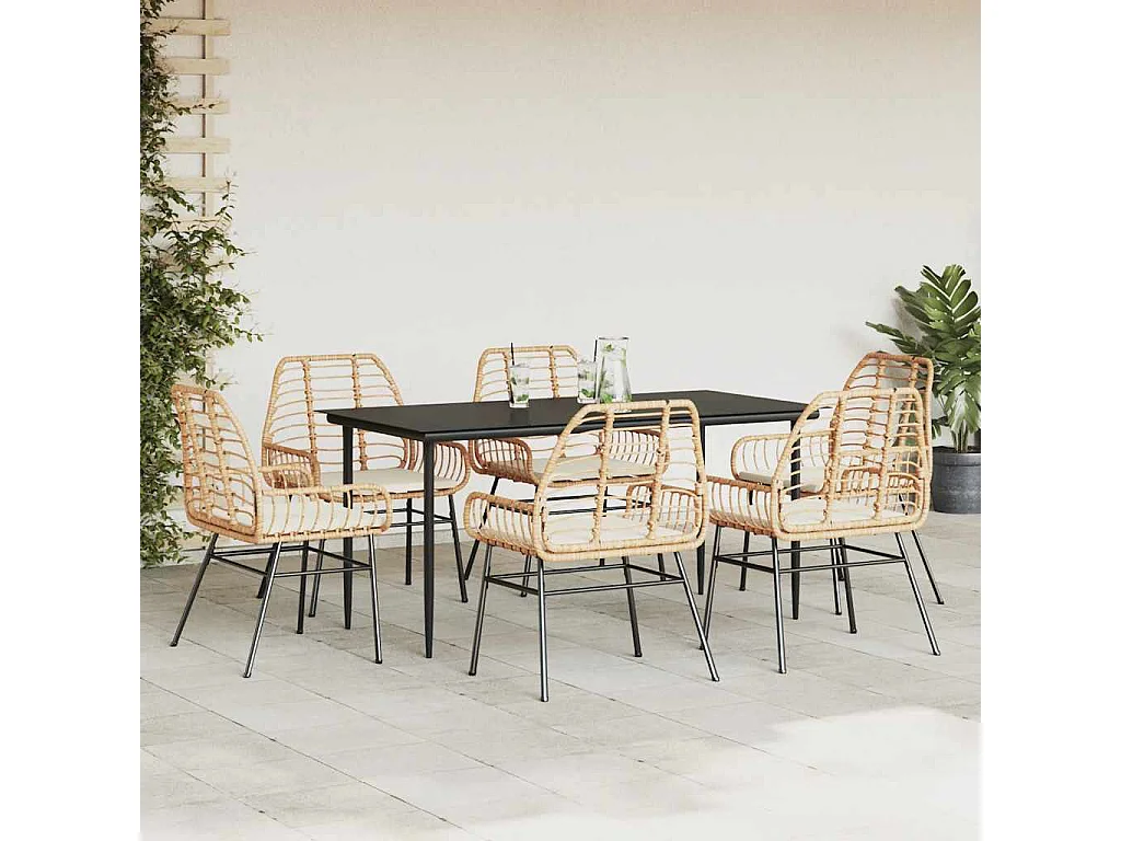 Ensemble à manger jardin coussins 7pièces marron poly rotin verre