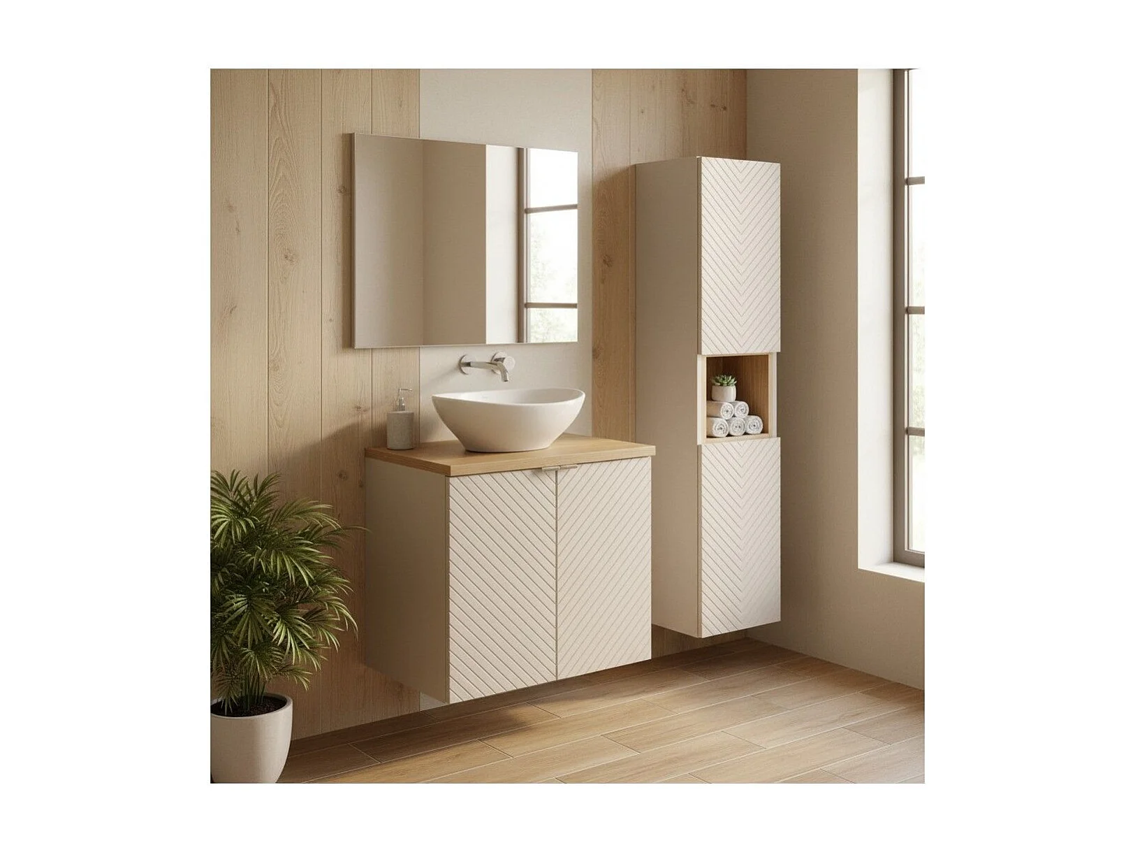 Ensemble AOKI : meuble sous vasque à placard 60cm + plan vasque chêne + vasque blanche ronde à poser + colonne