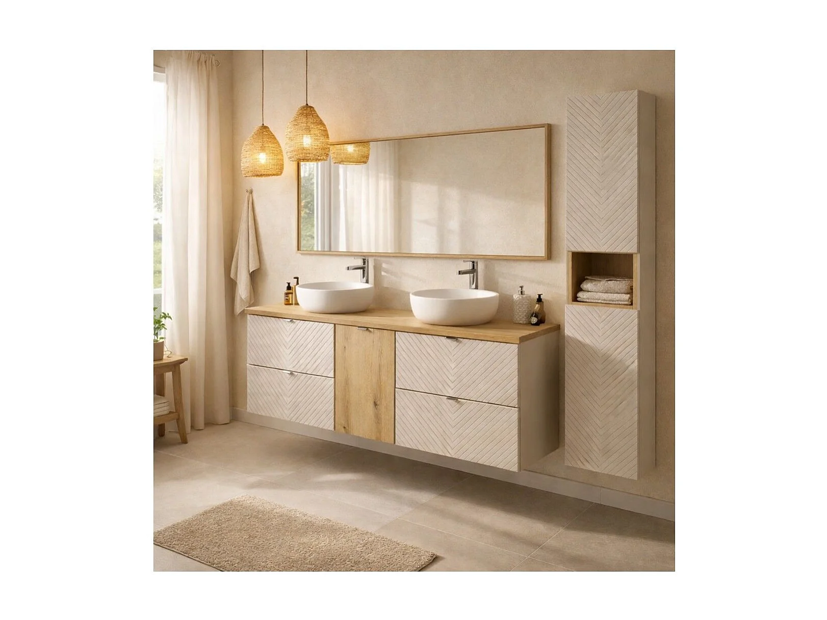Ensemble AOKI : meubles sous vasque à tiroirs + panier à linge + plan vasque chêne + colonne