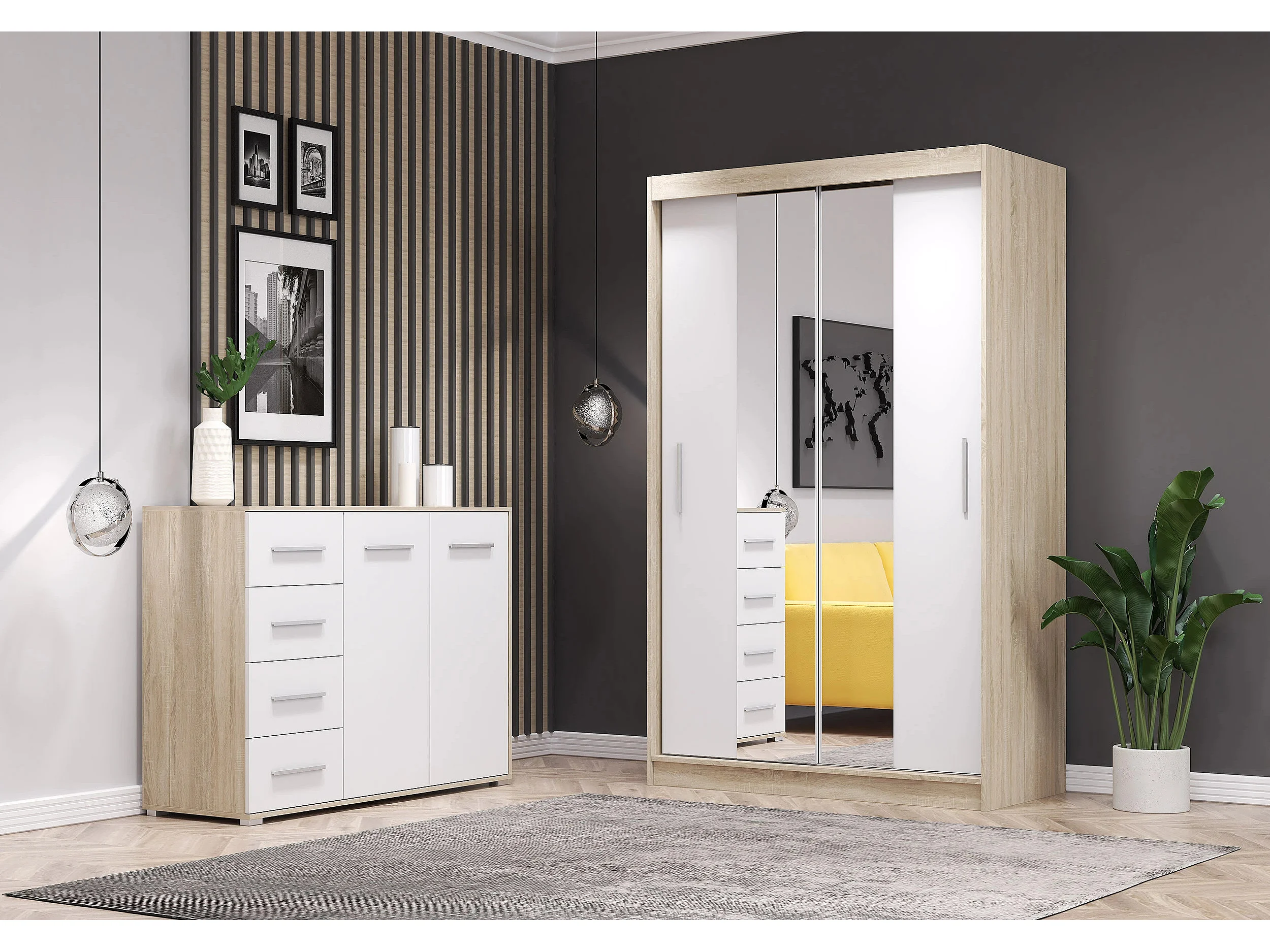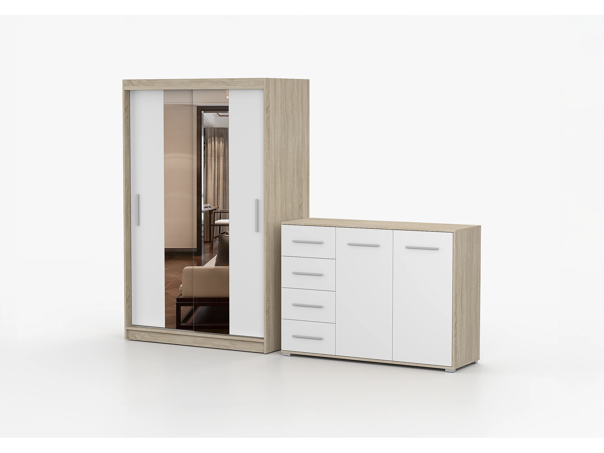 Ensemble armoire Danae et commode Ilario avec miroir - Chêne - Blanc