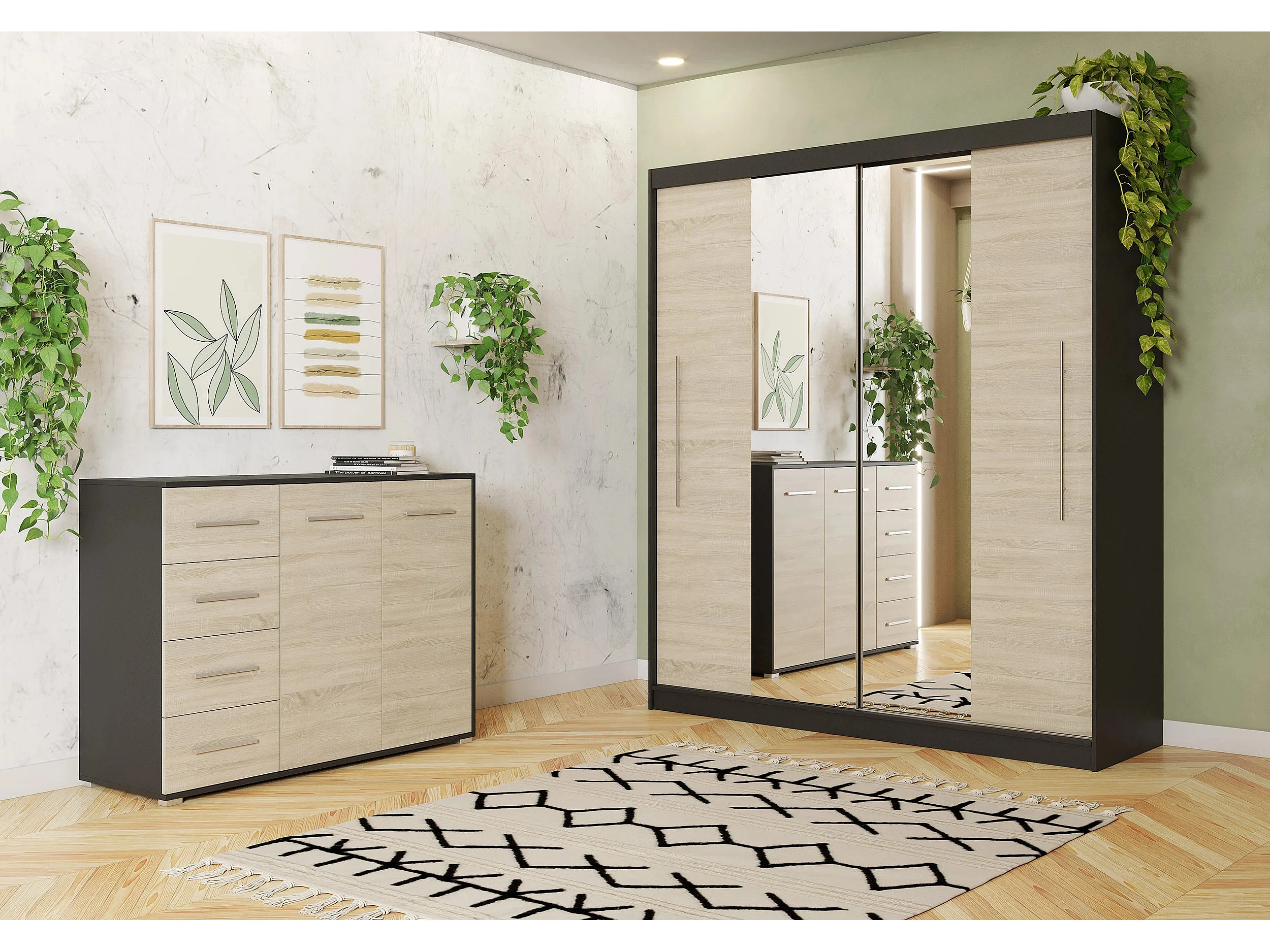 Ensemble armoire Eireen et commode Ilario avec miroir - Noir - Chêne