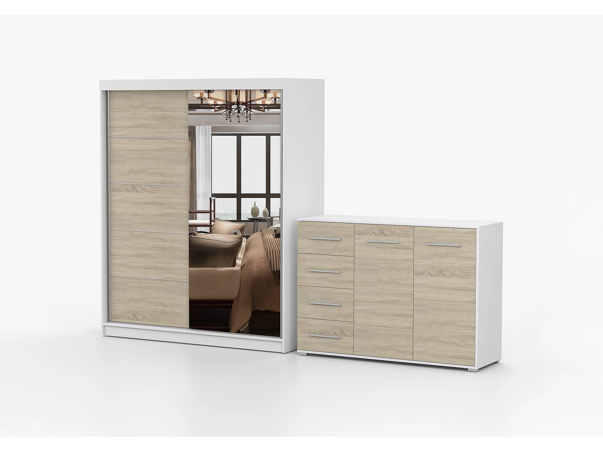 Ensemble armoire Ondine et commode Ilario avec miroir - Blanc - Chêne