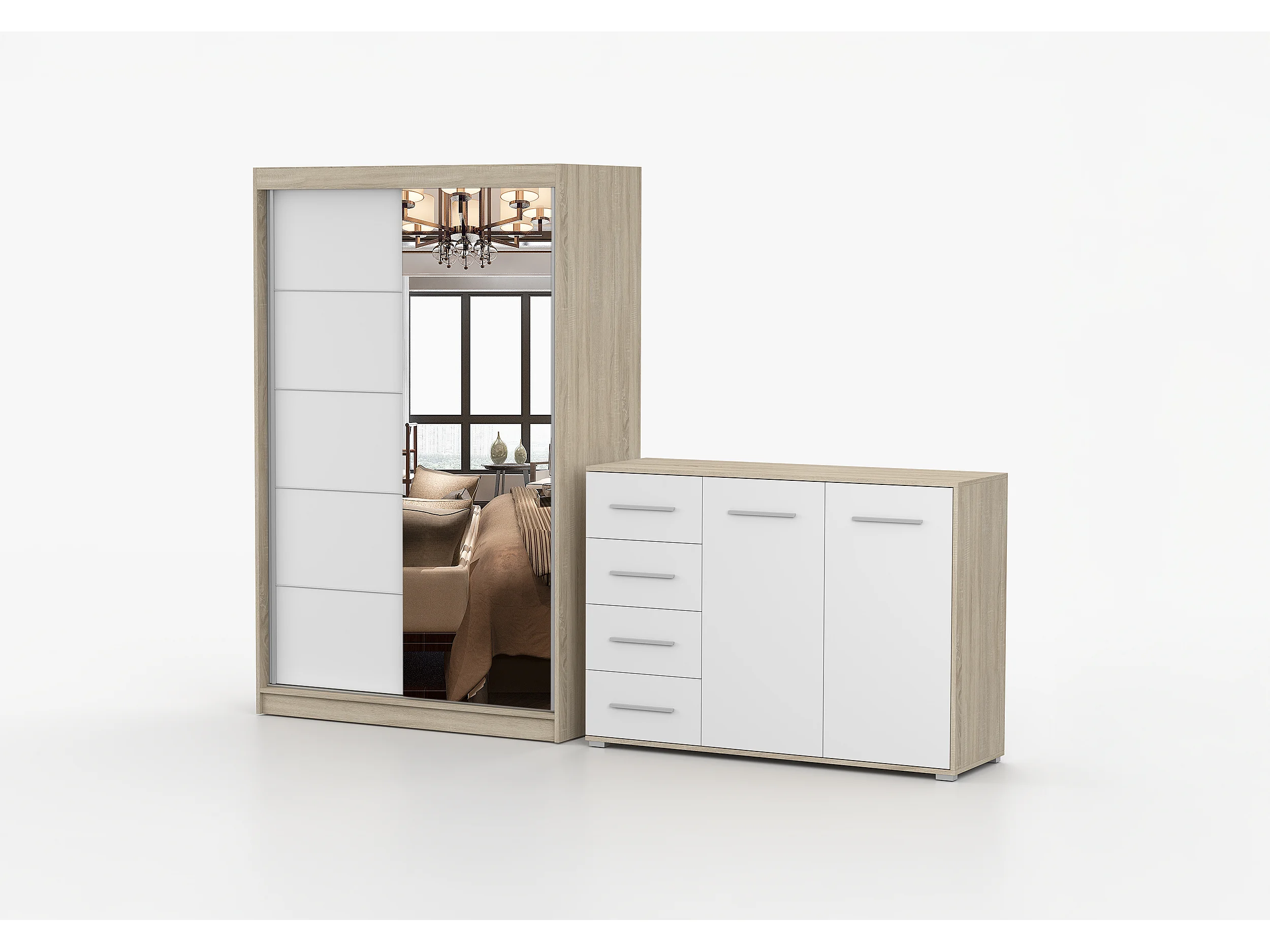 Ensemble armoire Syra et commode Ilario avec miroir - Chêne - Blanc