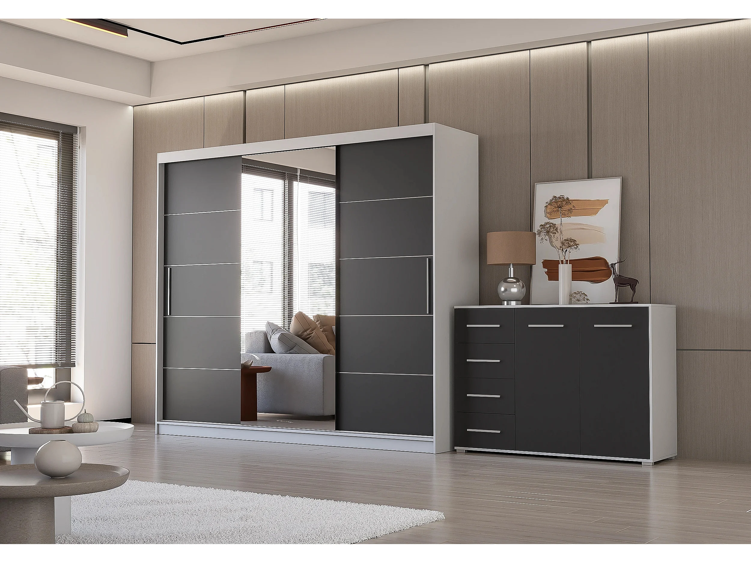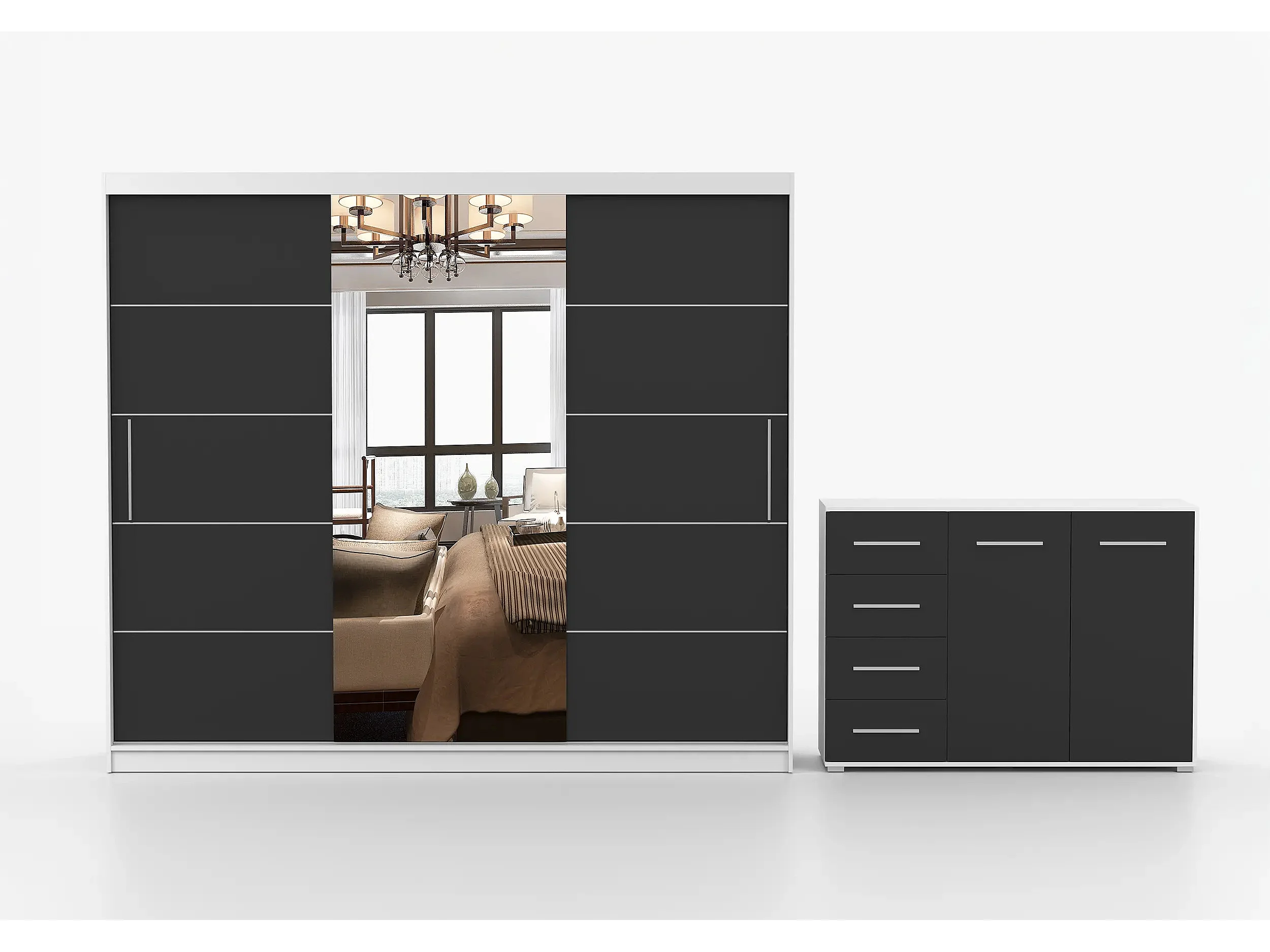 Ensemble armoire Theana et commode Ilario avec miroir - Blanc - Noir