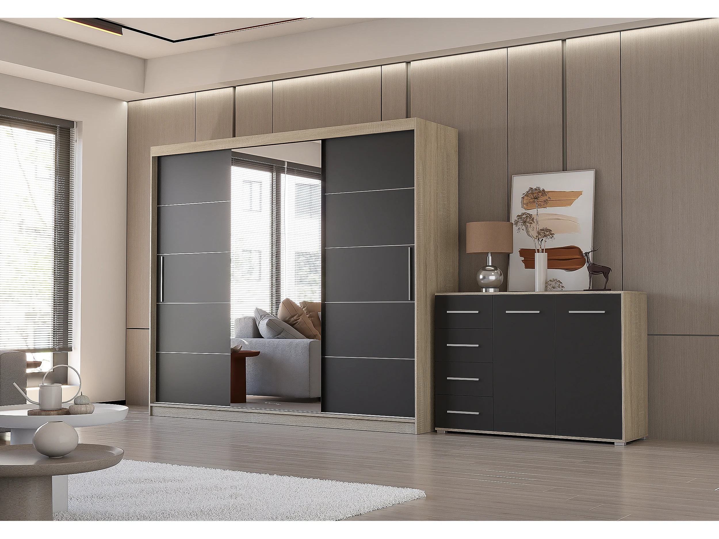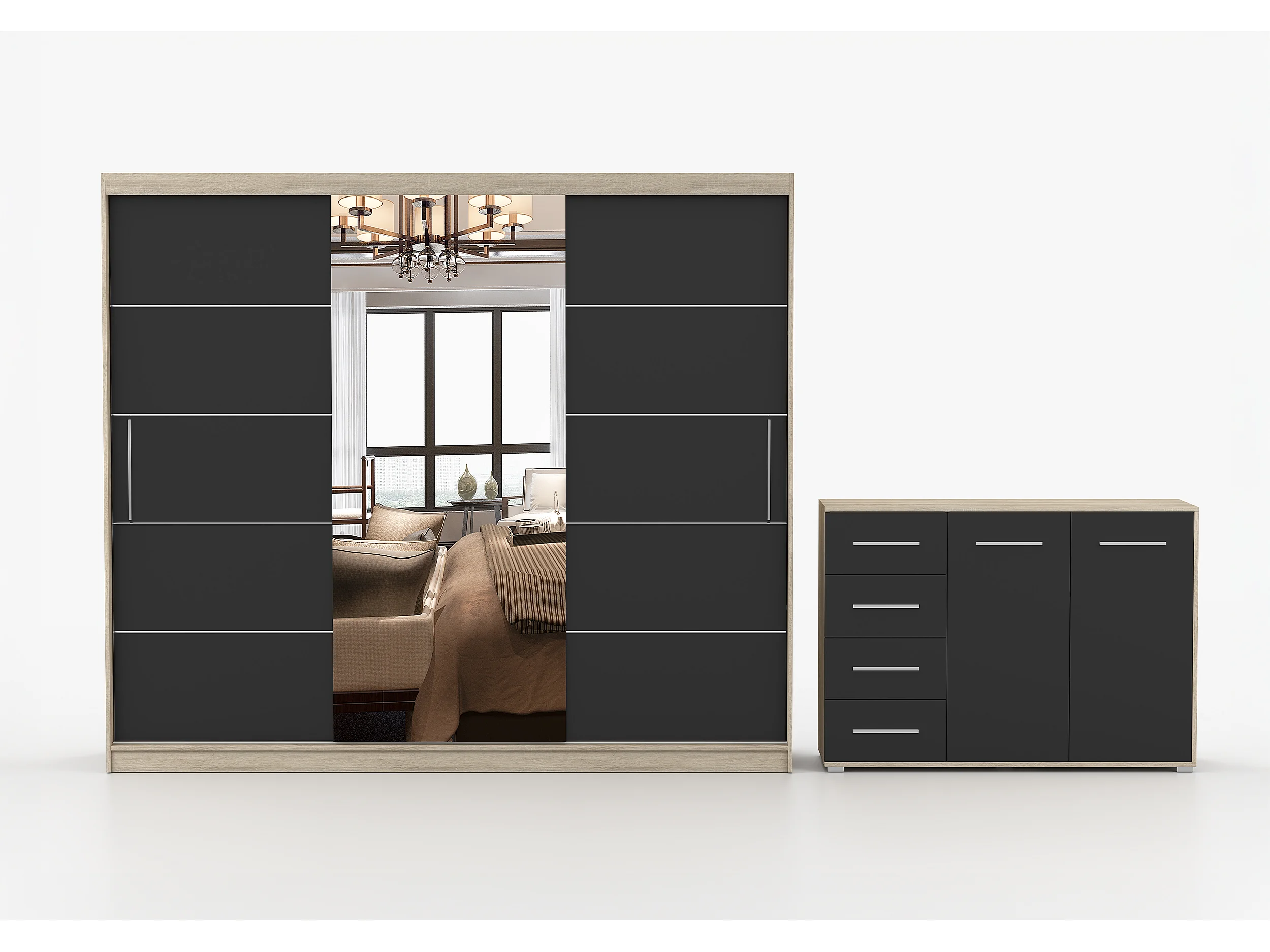 Ensemble armoire Theana et commode Ilario avec miroir - Chêne - Noir