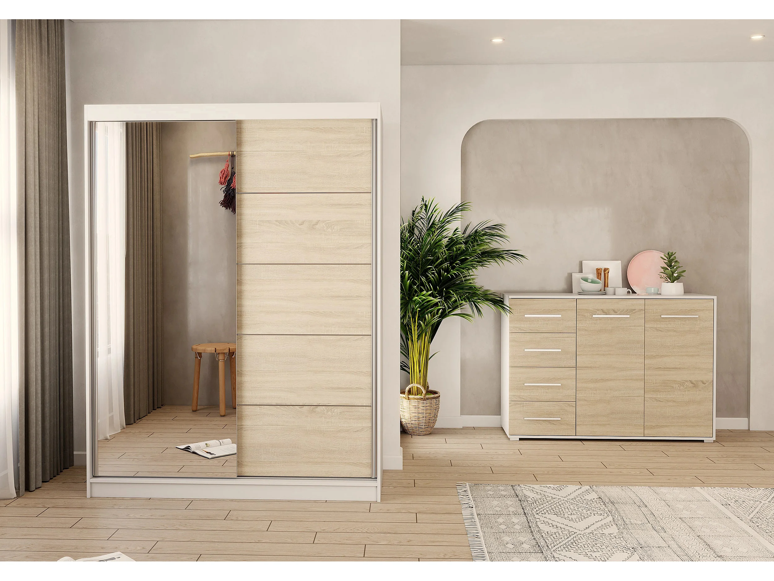 Ensemble armoire Vaiana et commode Ilario avec miroir - Blanc - Chêne