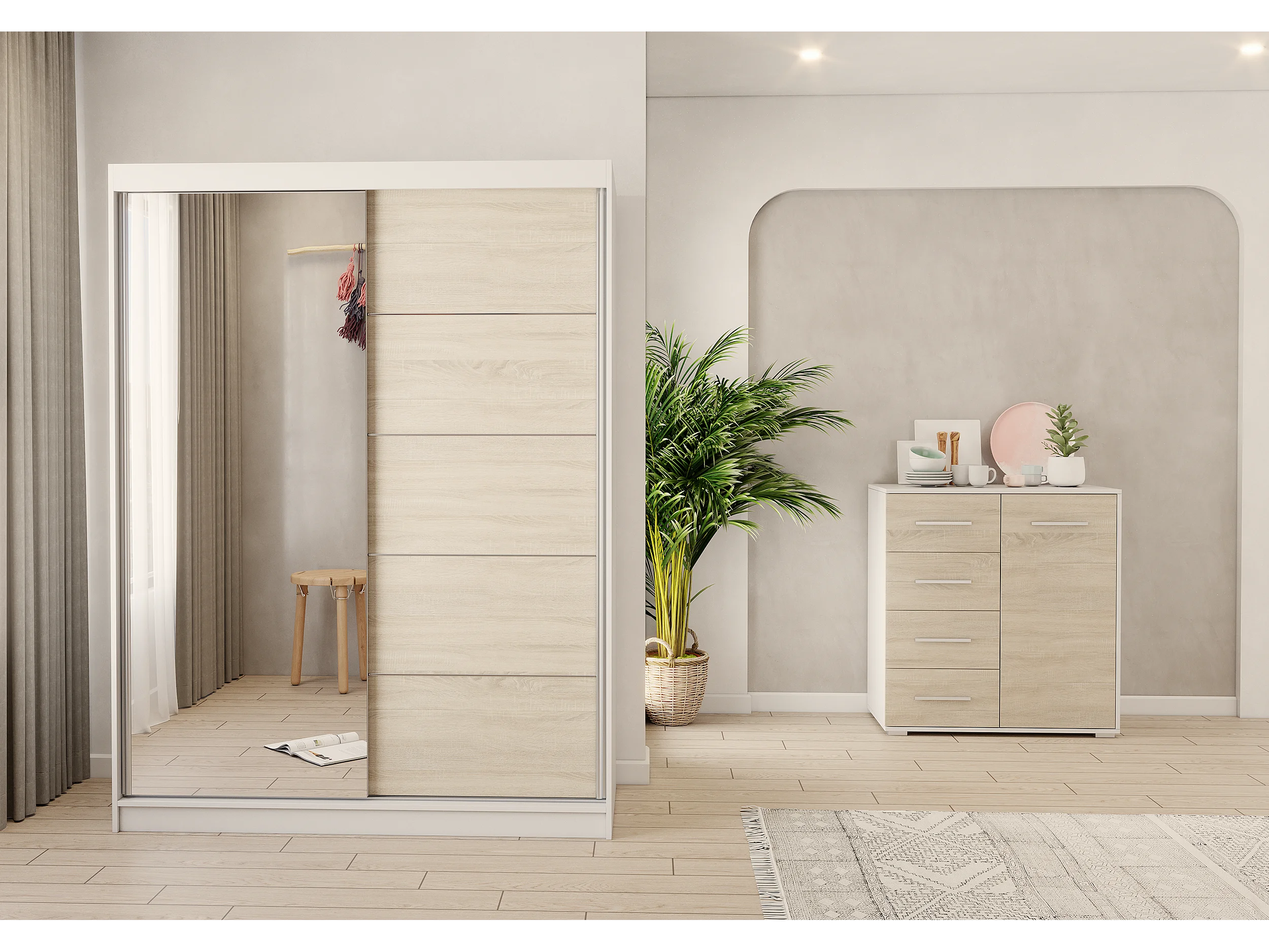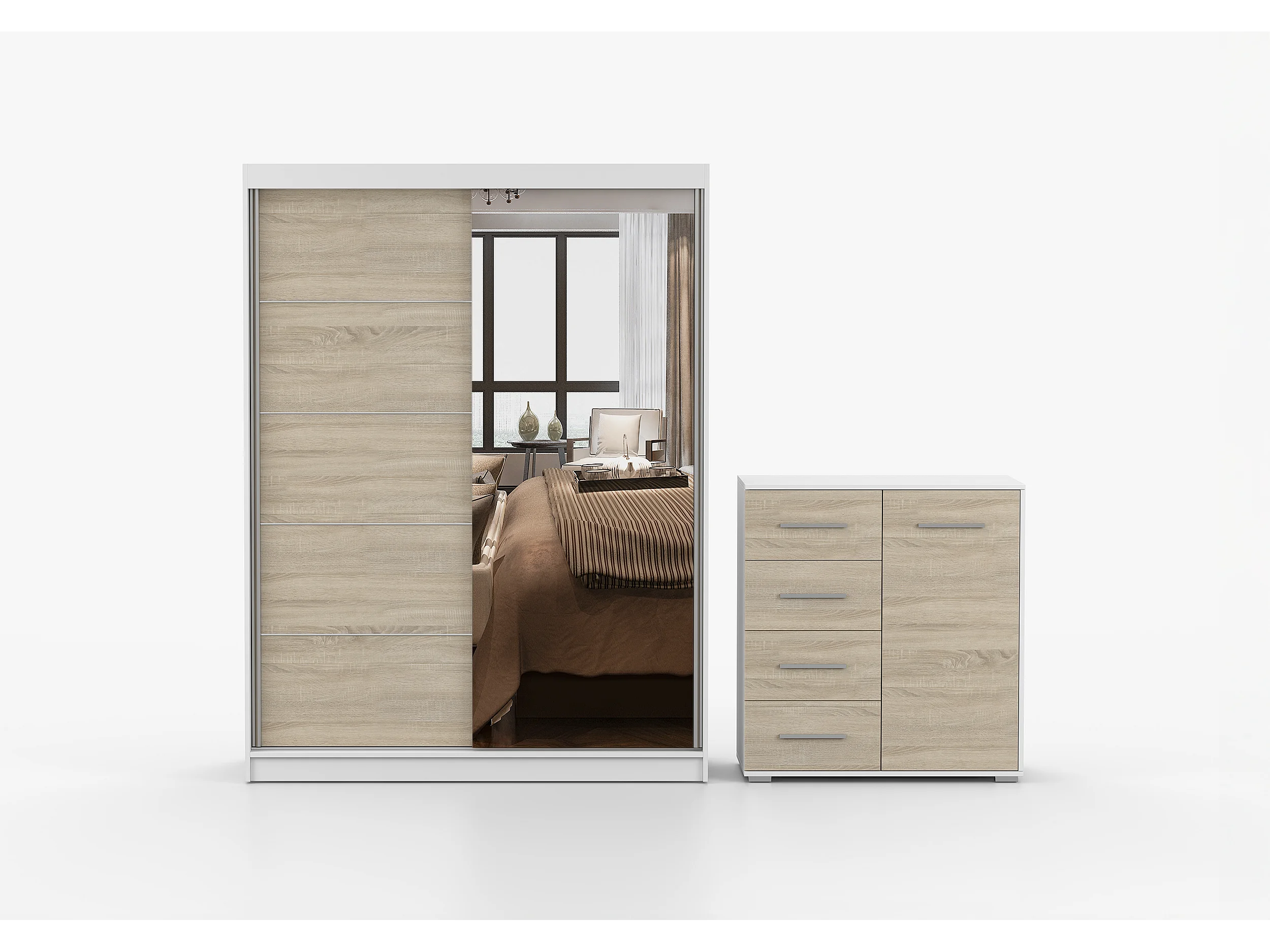 Ensemble armoire Vaiana et commode Ilario Chêne - Blanc avec miroir - Blanc - Chêne
