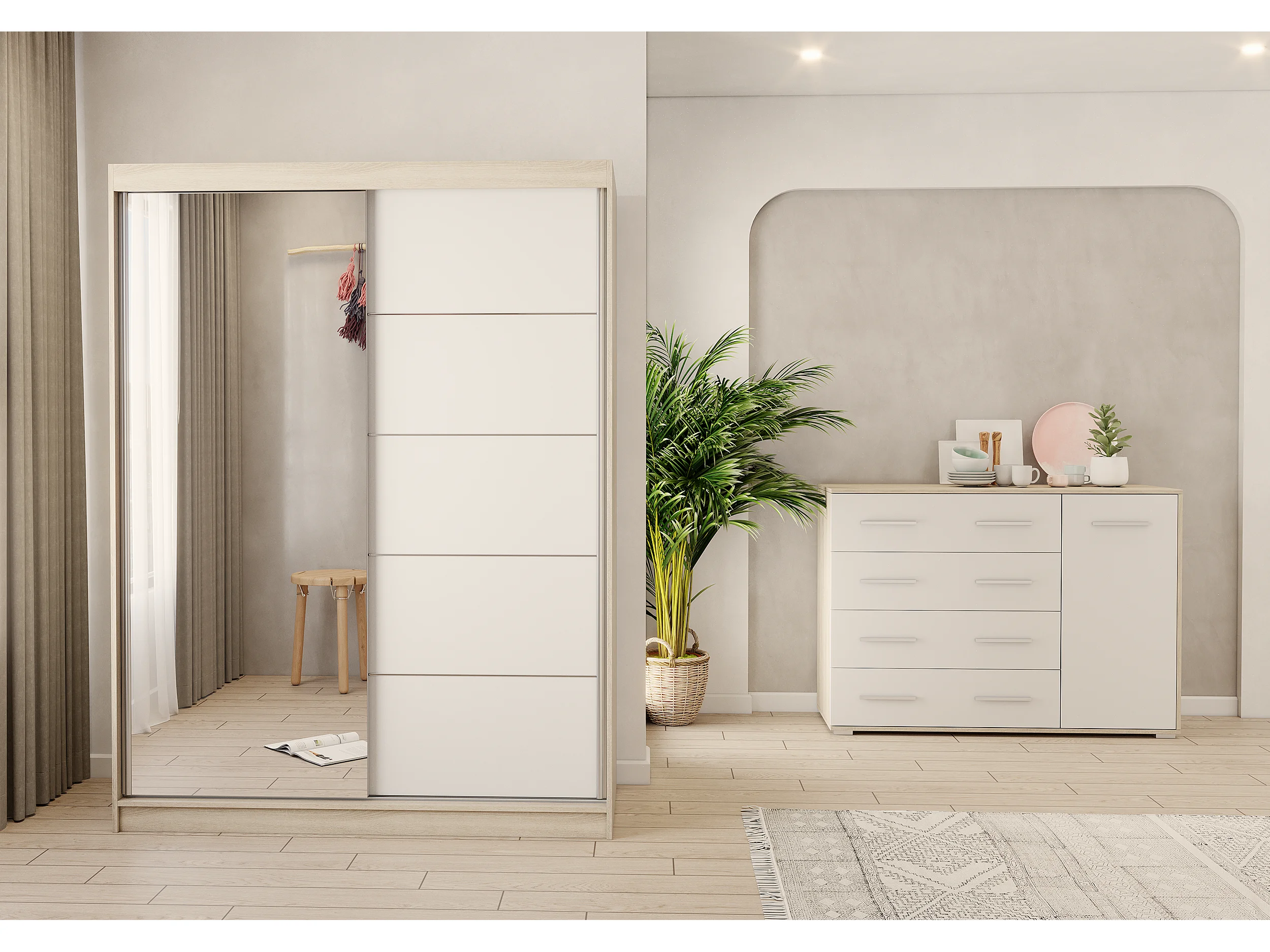 Ensemble armoire Vaiana et commode Ilario Chêne - Blanc avec miroir - Chêne - Blanc
