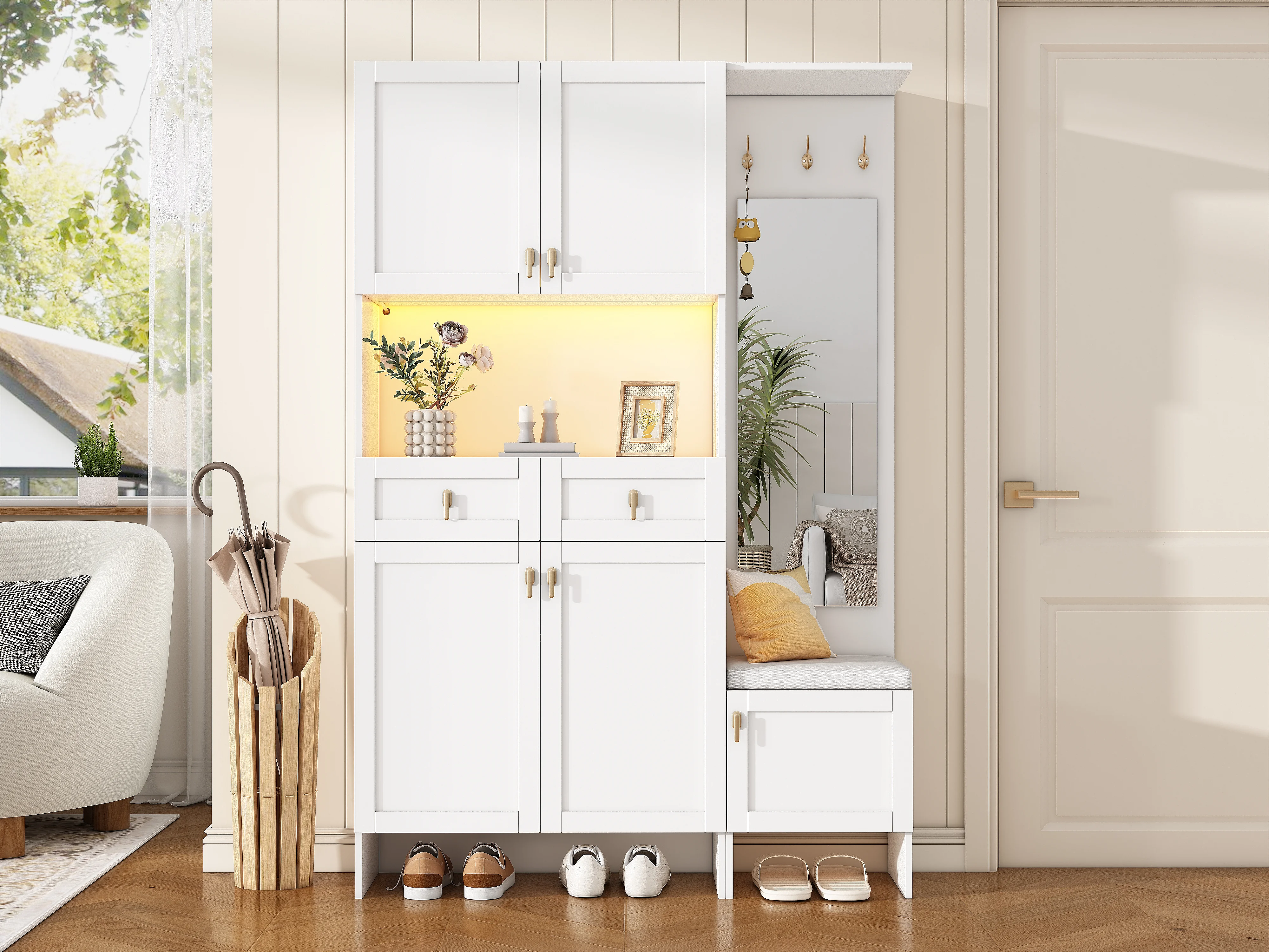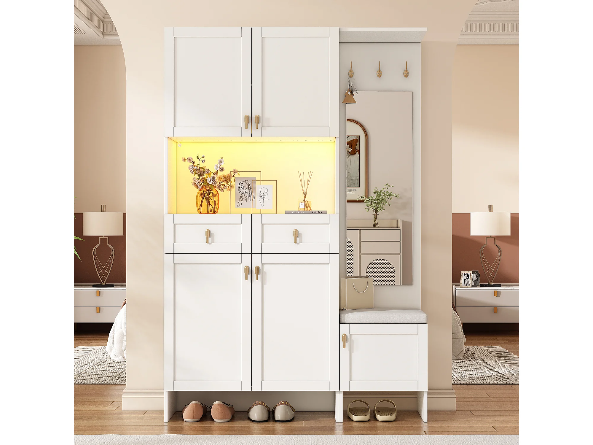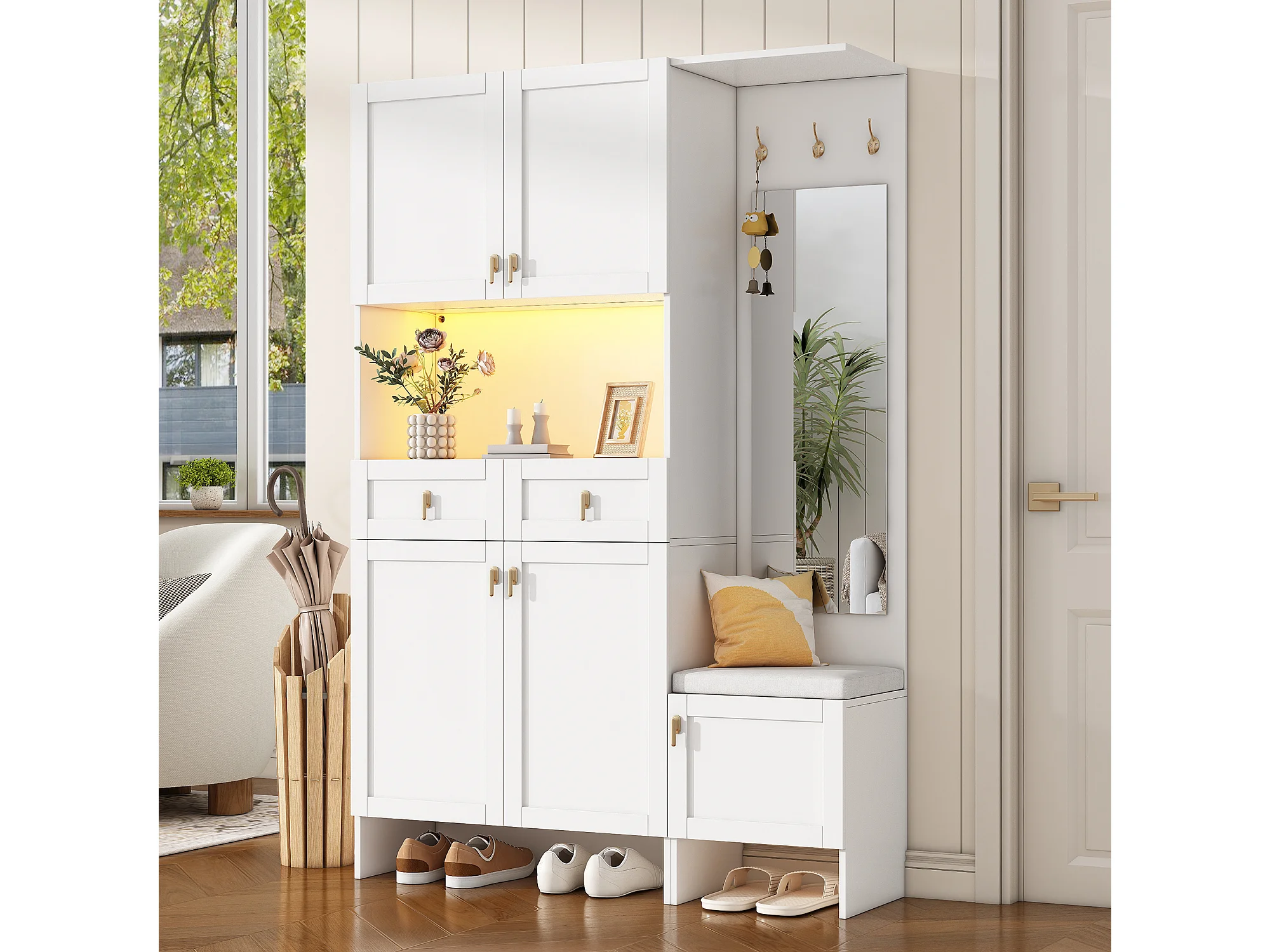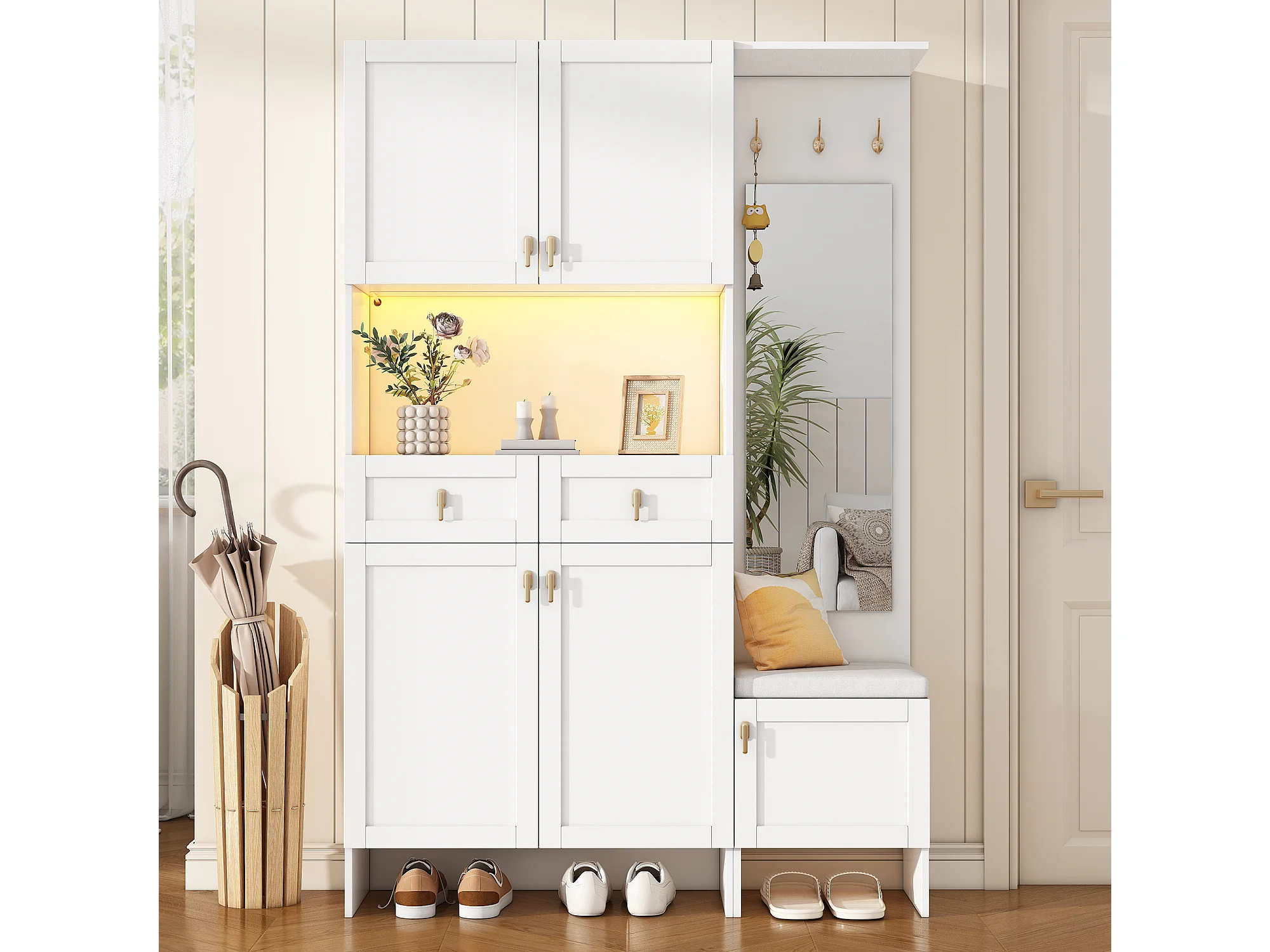 Ensemble armoire/vestiaire - 120 x 33.5 x 180 cm - avec banc + meuble à chaussures + 3 crochets + 2 tiroirs + 1 miroir - aggloméré - blanc