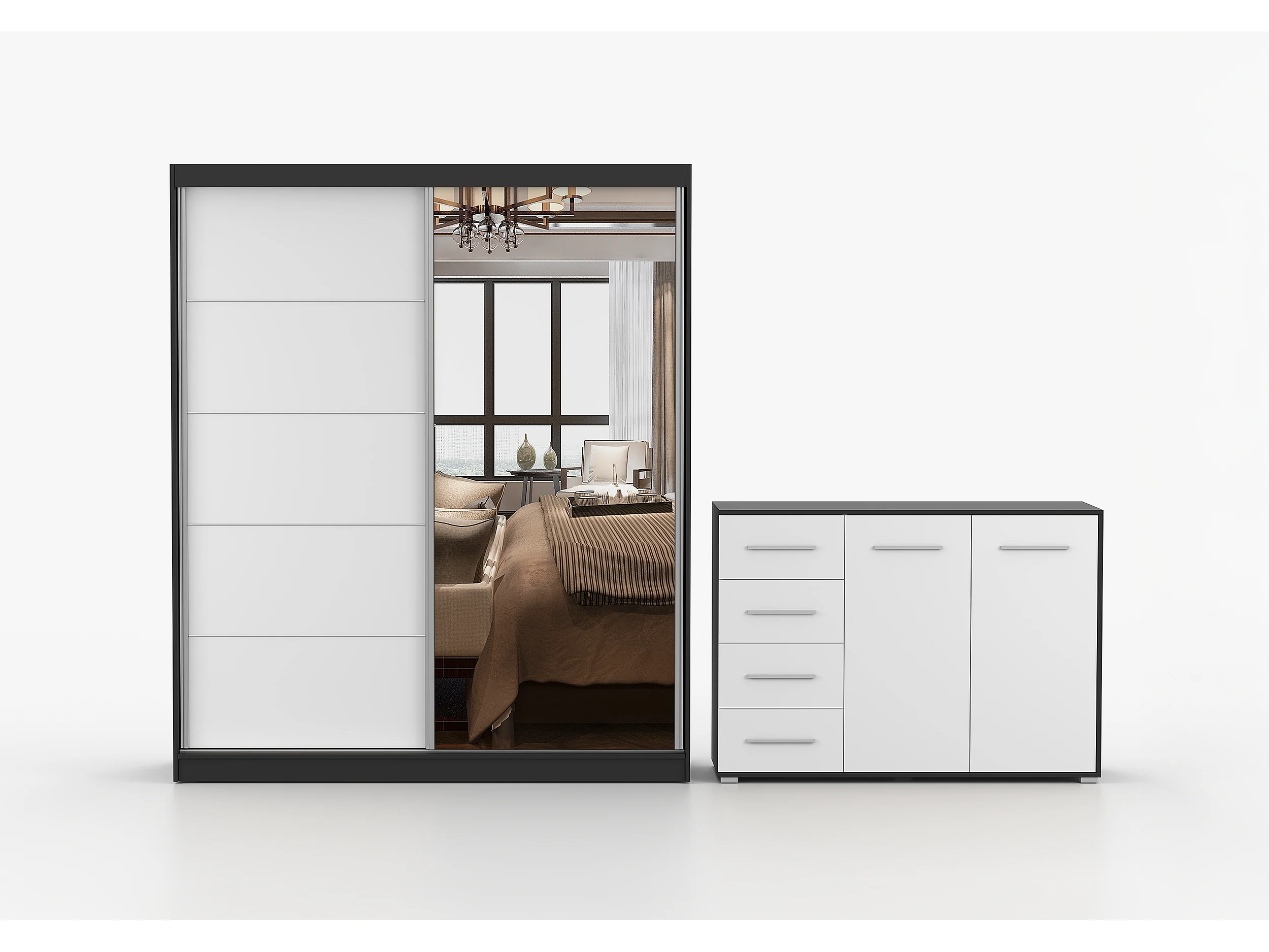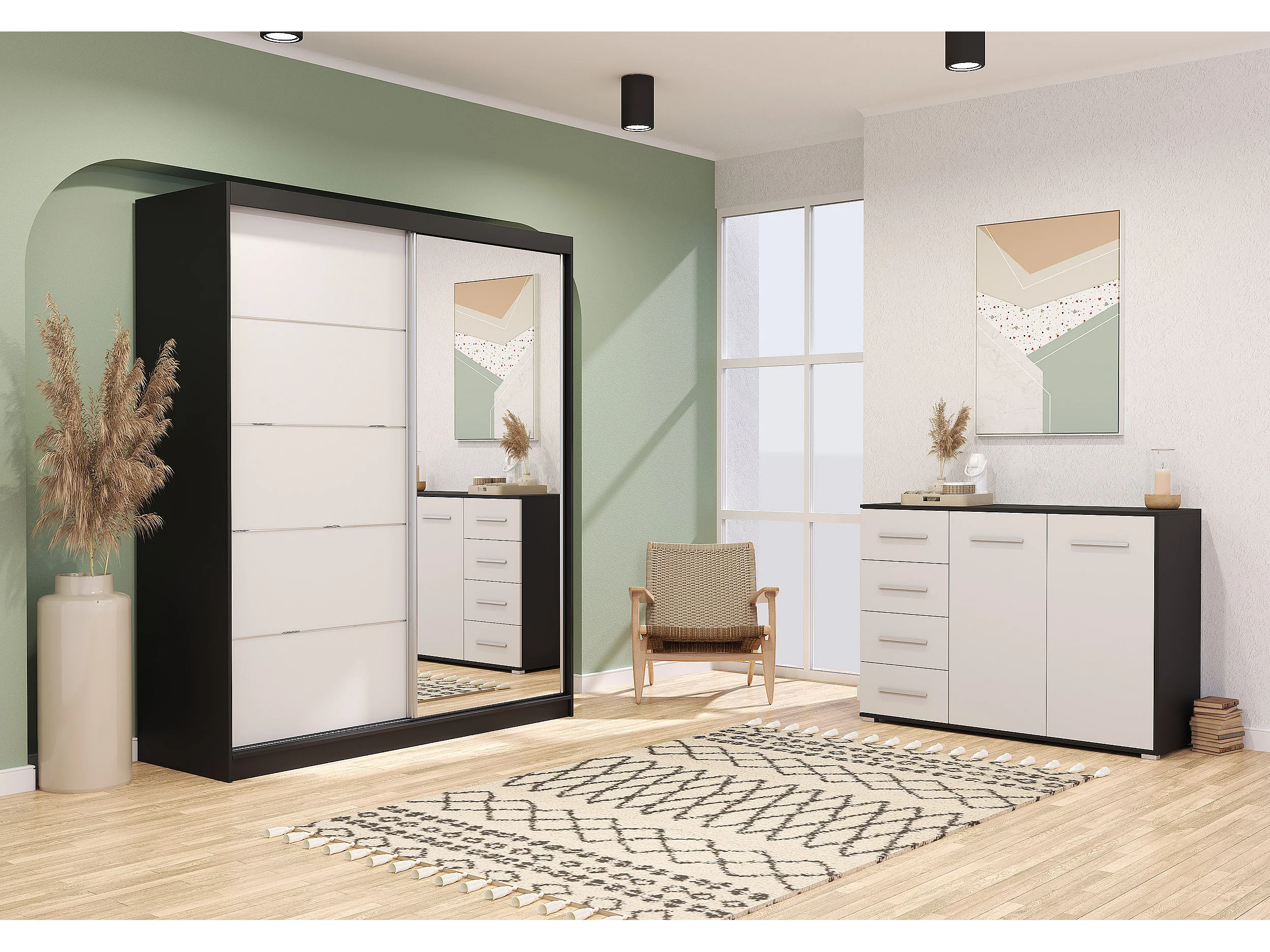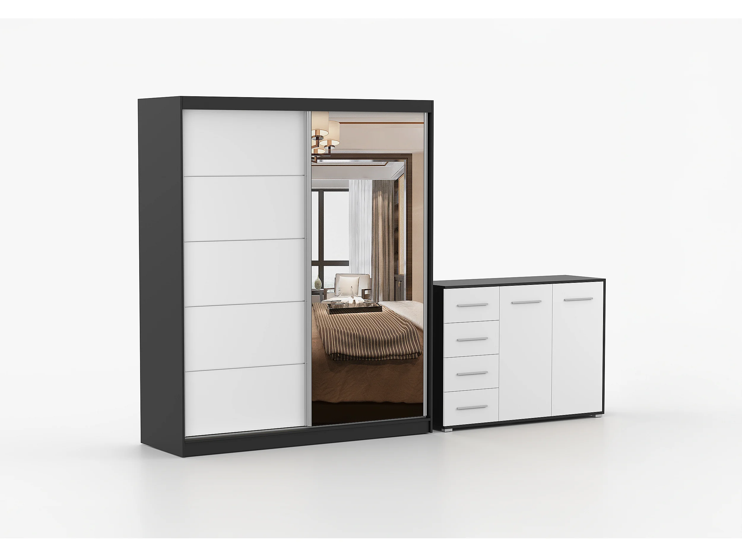 Ensemble armoire Ysalis et commode Ilario avec miroir - Noir - Blanc