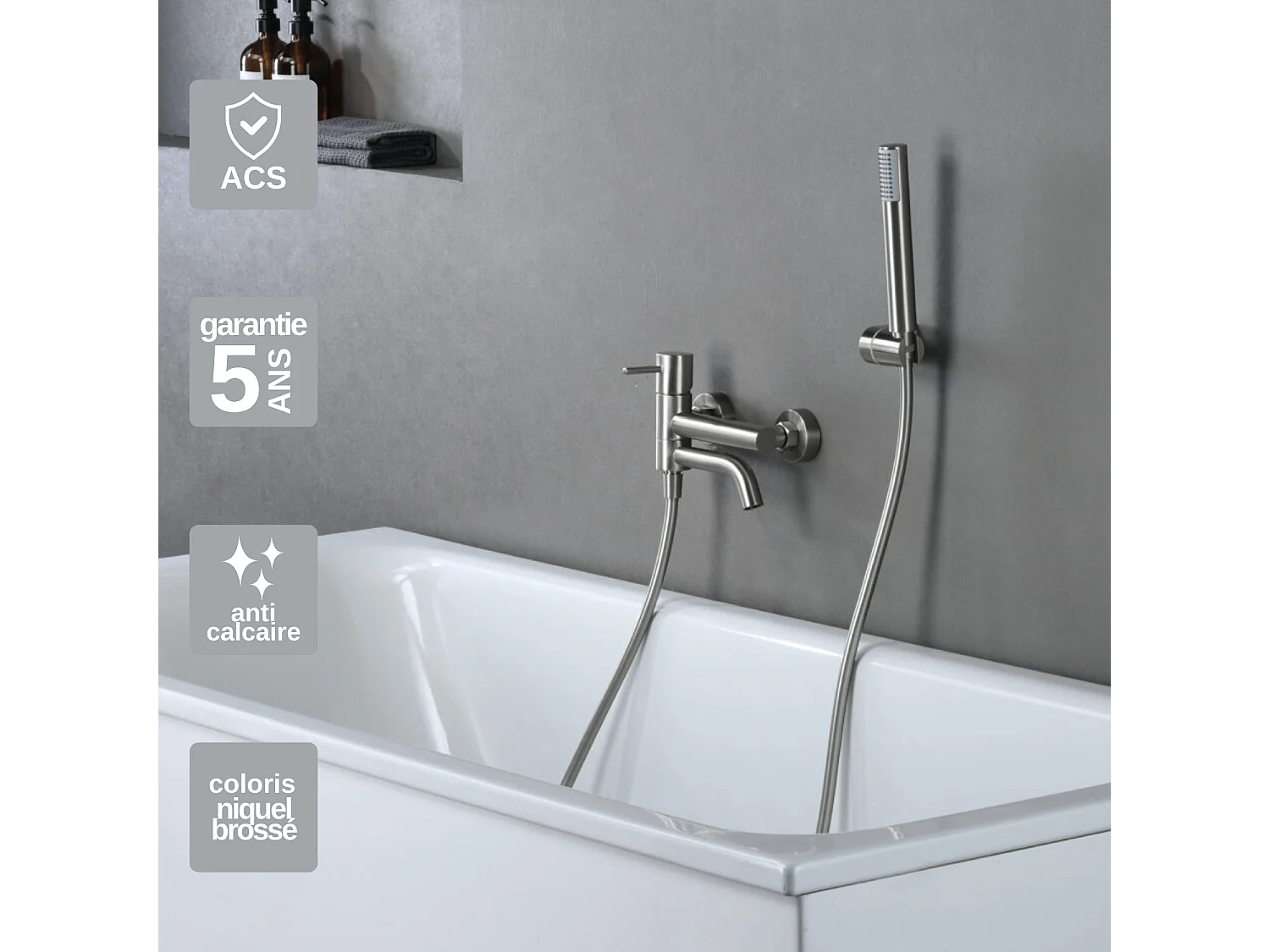 Ensemble Bain/Douche Anti-Calcaire en Niquel Brossé MONZA BDM039-4NQ