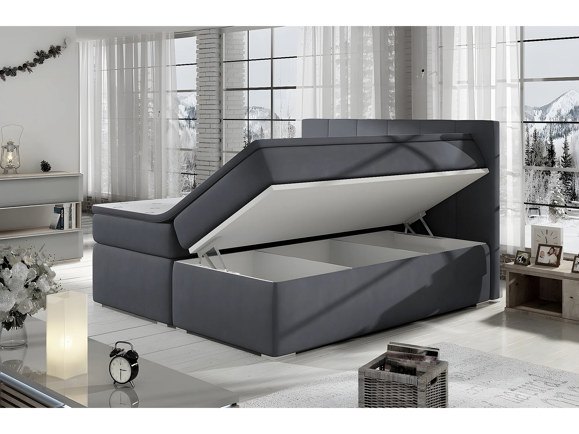 Ensemble boxspring complet tête de lit + sommiers + matelas + surmatelas BORIS de VENESETTI - tissu luxe gris foncé - 140x200 cm