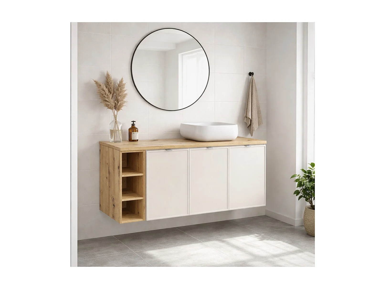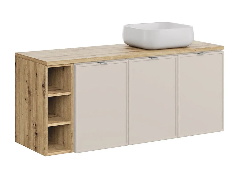 Ensemble BRAZZA : meubles sous vasque à placards 140cm avec niches visibles + plan pour vasque + vasque à poser carrée arrondie