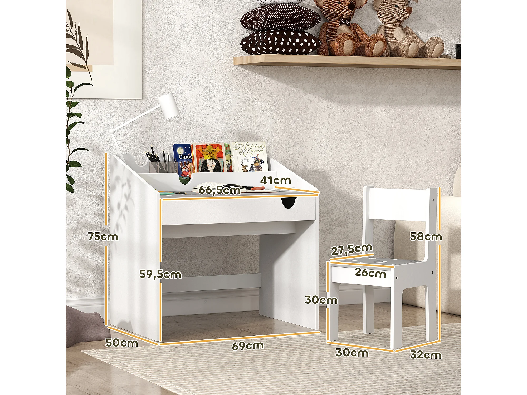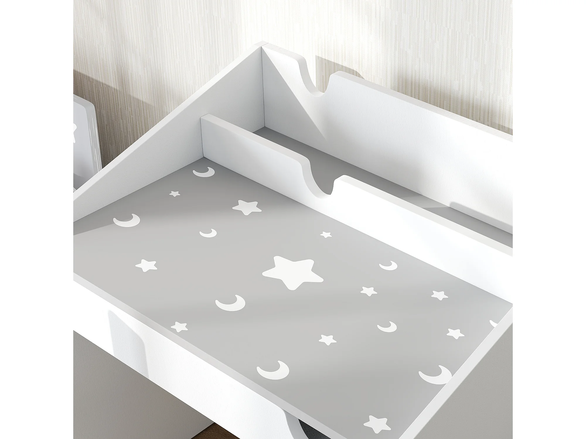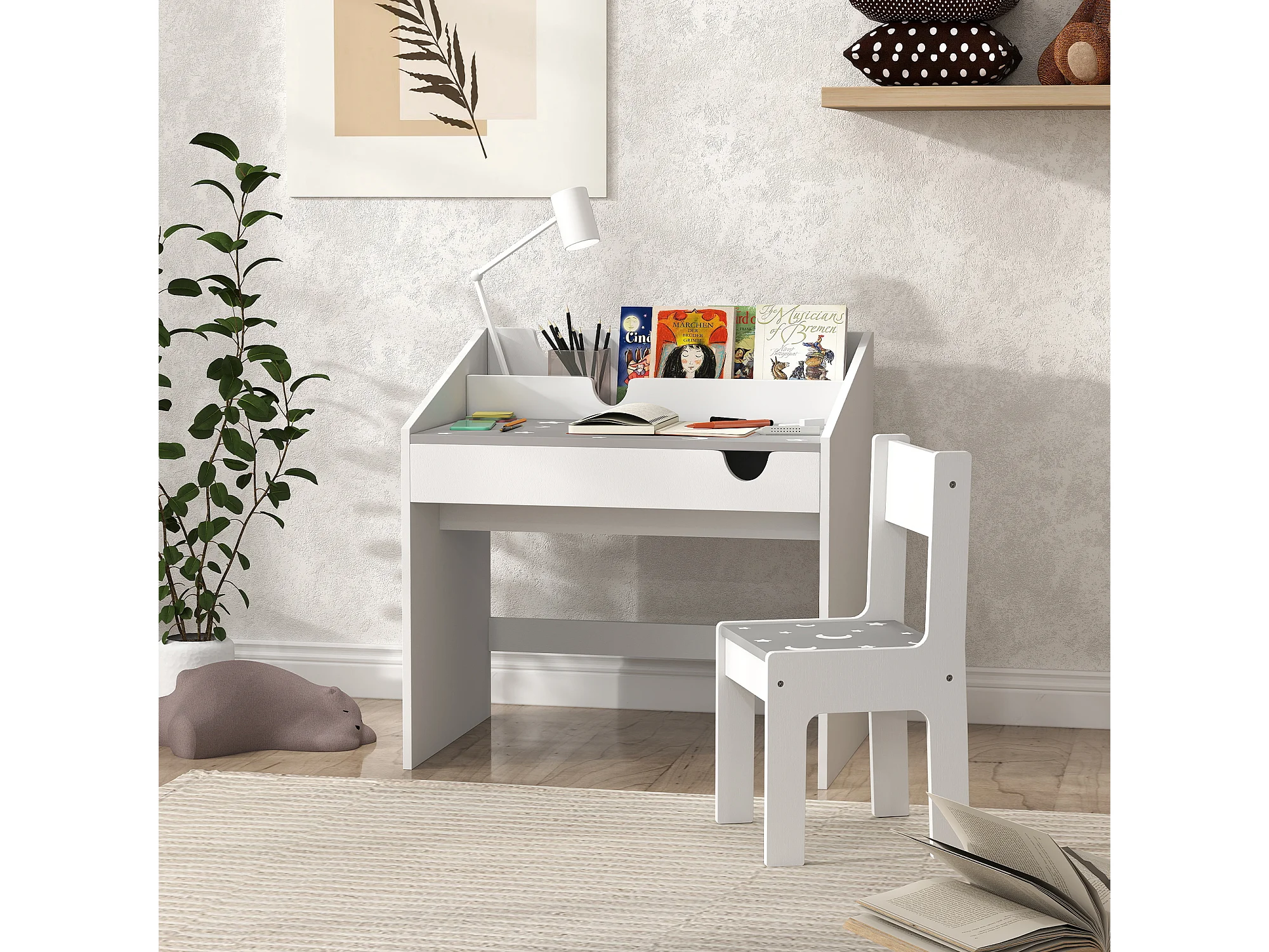 Ensemble bureau et chaise enfant motif étoile lune - tiroir, porte-livres intégré - blanc gris