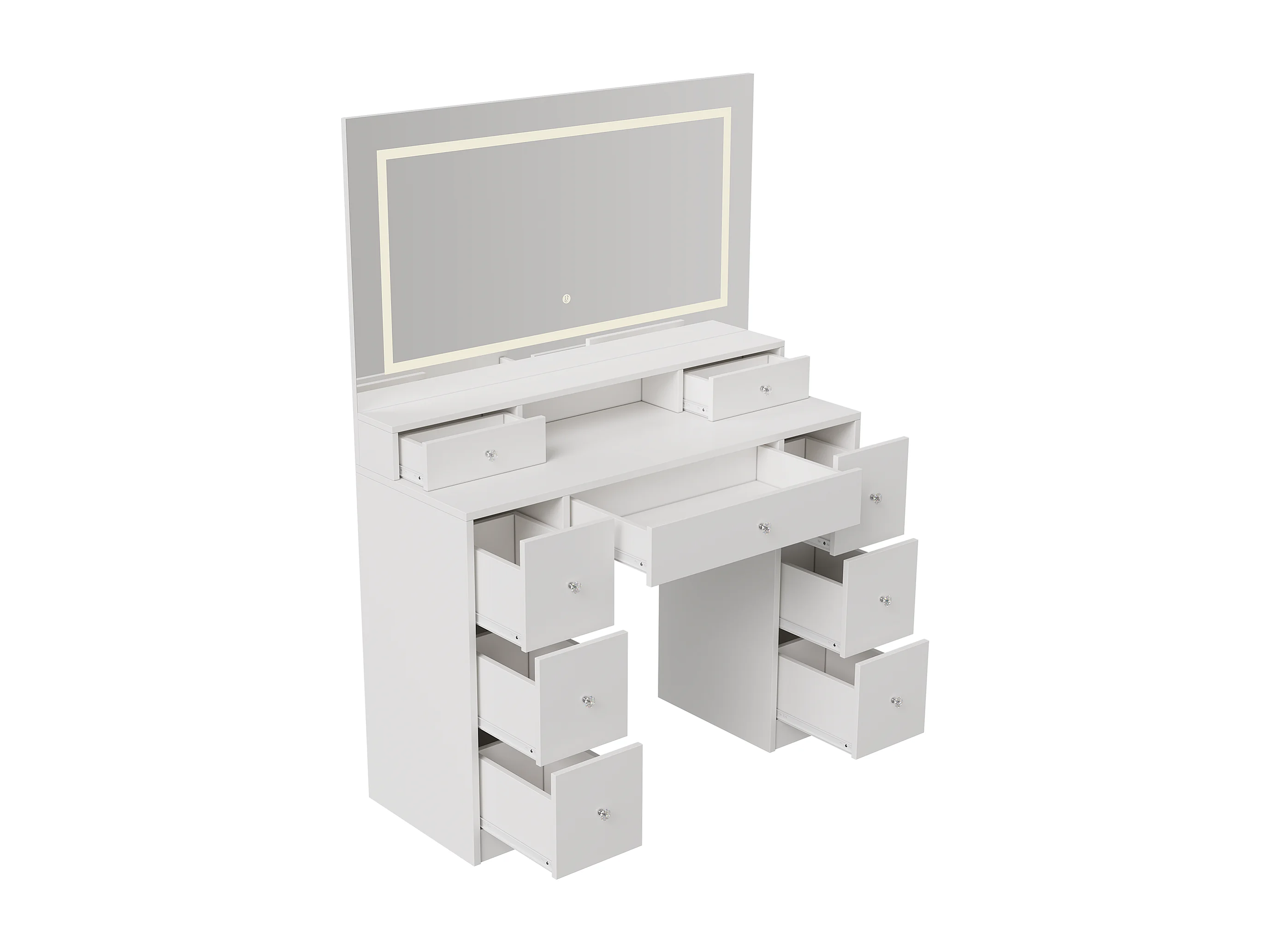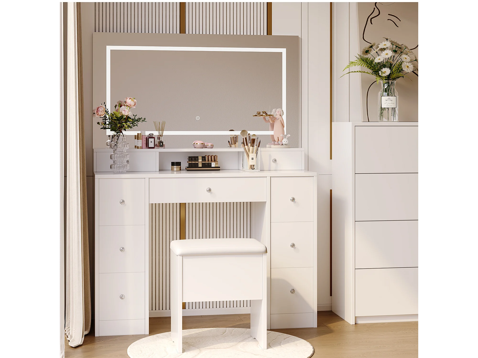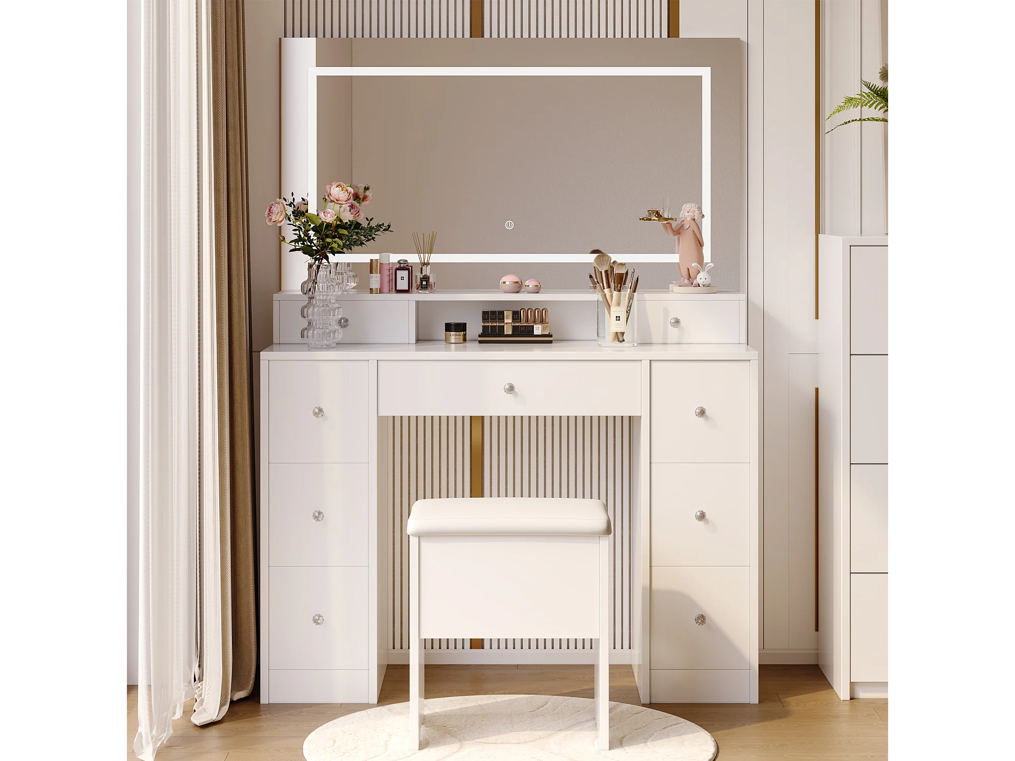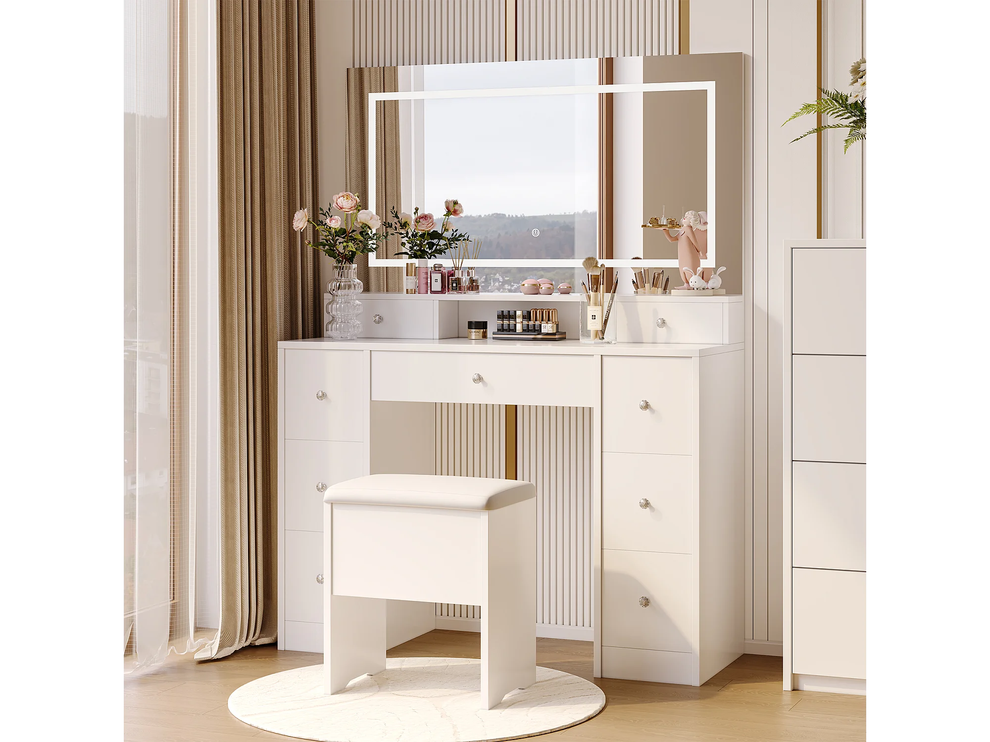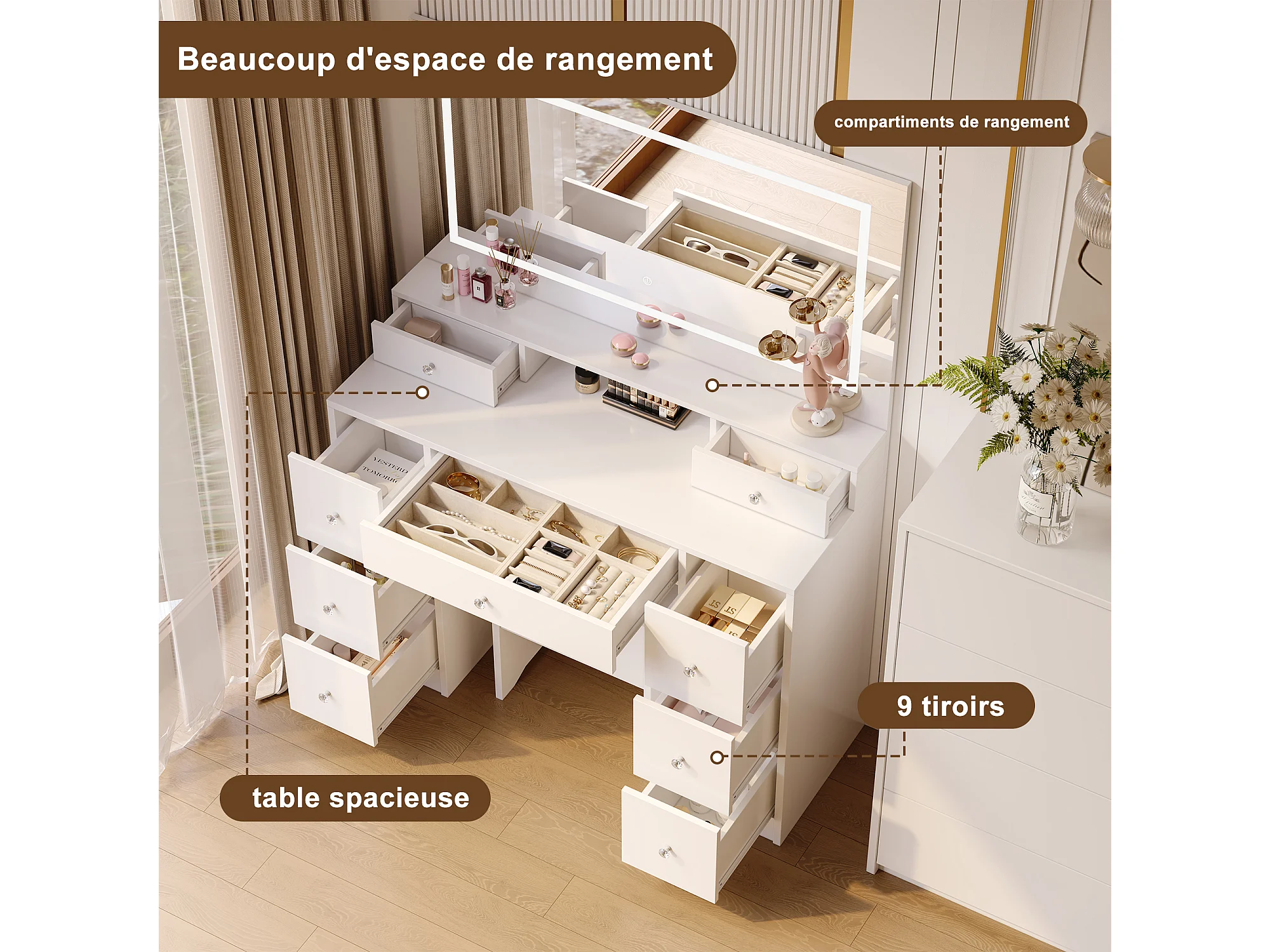 Ensemble coiffeuse avec miroir et éclairage LED, table de toilette avec tabouret de rangement, 9 tiroirs et étagères ouvertes, blanc