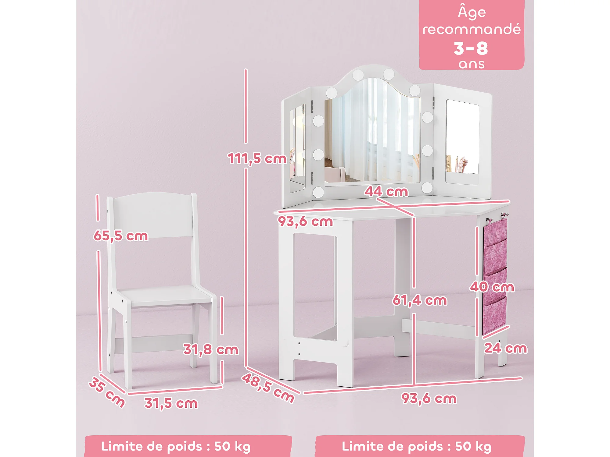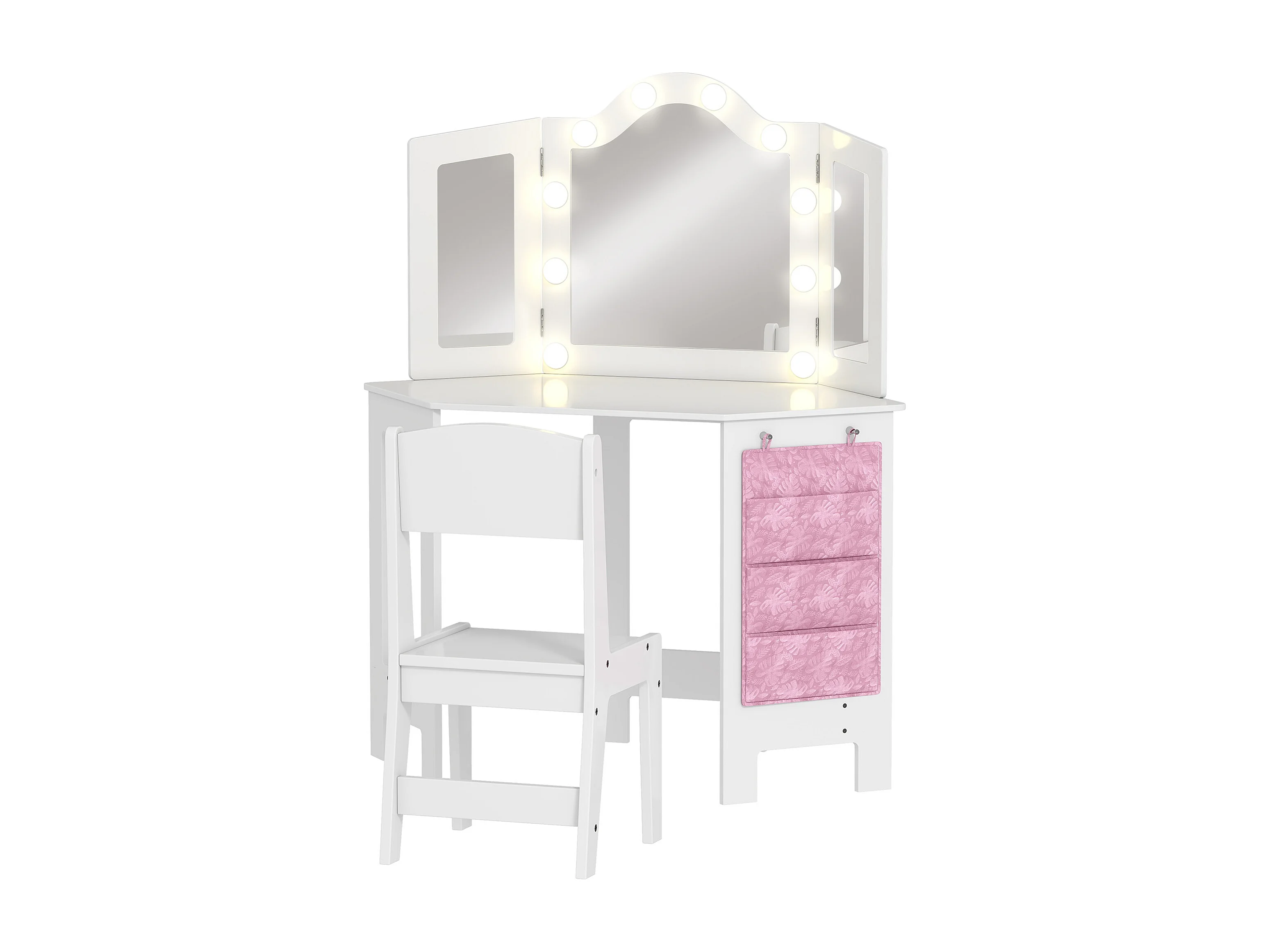 Ensemble coiffeuse enfant chaise et miroir Holywood triptyque - pochette rangement rose - blanc