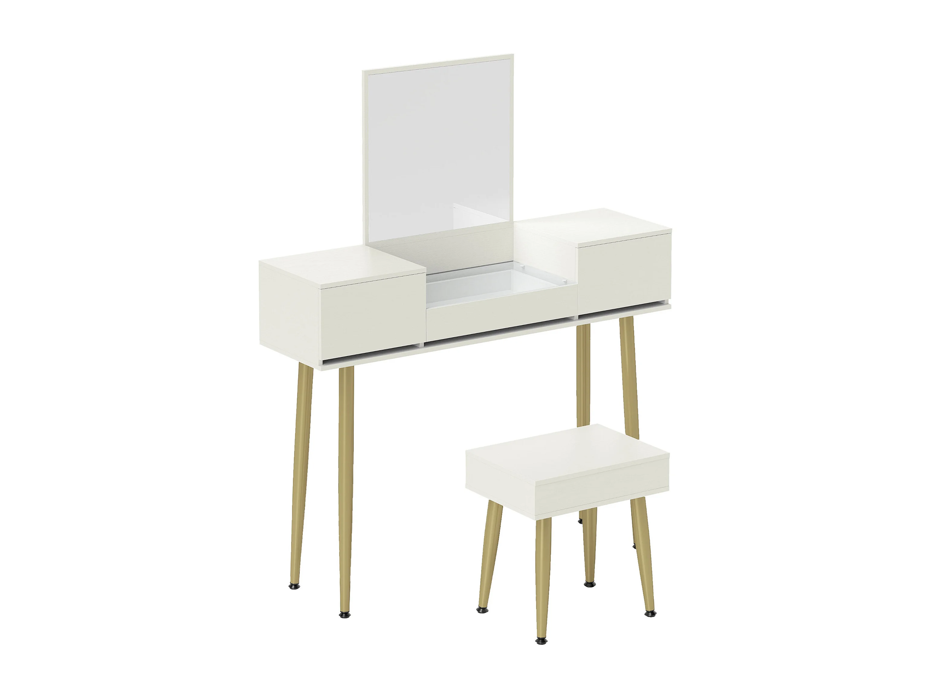 Ensemble coiffeuse tabouret coffre avec miroir design - 3 tiroirs, plateau verre trempé - métal doré blanc